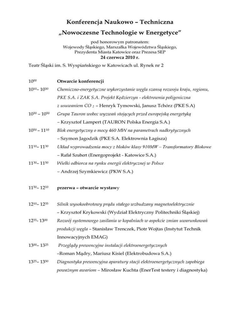 Konferencja Naukowo – Techniczna „Nowoczesne Technologie w Energetyce” pod honorowym patronatem: Wojewody Śląskiego, Marszałka Województwa Śląskiego, Prezydenta Miasta Katowice oraz Prezesa SEP 24 czerwca 2010 r. Teatr Śląski im. S. Wyspiańskiego w Katowicach ul. Rynek nr 2 1000 Otwarcie konferencji 1010– 1030 Chemiczno-energetyczne wykorzystanie węgla szansą rozwoju kraju, regionu, PKE S.A. i ZAK S.A. Projekt Kędzierzyn - elektrownia poligeniczna z usuwaniem CO 2 – Henryk Tymowski, Janusz Tchórz (PKE S.A) 1030 – 1050 Grupa Tauron wobec wyzwań stojących przed europejską energetyką – Krzysztof Lampert (TAURON Polska Energia S.A.) 1050 – 1110 Blok energetyczny o mocy 460 MW na parametrach nadkrytycznych – Szymon Jagodzik (PKE S.A. Elektrownia Łagisza) 1110– 1130 Układ wyprowadzenia mocy z bloków klasy 910MW – Transformatory Blokowe – Rafał Szubert (Energoprojekt - Katowice S.A.) 1130– 1150 Wielki odbiorca na rynku energii elektrycznej w Polsce – Andrzej Szymkiewicz (PKW S.A.) 1150– 1210 przerwa – otwarcie wystawy 1210– 1235 Silnik wysokoobrotowy prądu stałego wzbudzany magnetoelektrycznie – Krzysztof Krykowski (Wydział Elektryczny Politechniki Śląskiej) 1235- 1300 Rozwój systemowego zasilania w kopalniach w aspekcie zmian uwarunkowań produkcji węgla – Stanisław Trenczek, Piotr Wojtas (Instytut Technik Innowacyjnych EMAG) 1300– 1325 Przeglądy prewencyjne instalacji elektroenergetycznych –Roman Mądry, Mariusz Kisiel (Elektrobudowa S.A.) 1325– 1350 Diagnostyka prewencyjna aparatury stacji elektroenergetycznych zapobiega powaŜnym awariom – Mirosław Kuchta (EnerTest testery i diagnostyka) 1350– 1415 Nowoczesna aparatura rozdzielcza dla sieci dystrybucyjnych wysokiego napięcia – Tomasz Wolanowski (ABB Sp. z o.o.) 1415- 1445 przerwa 1445– 1510 Najnowsze rozwiązania w urządzeniach rozdzielczych wysokich napięć w technologii AIS, GIS i 9MTS – Wojciech Majewski (AREVA T&D Sp. z o.o.) 1510– 1535 Inteligentne systemy zabezpieczenia, telemechanika, łączność cyfrowa (Smart Grid) i zarządzania pomiarami energii elektrycznej (Smart Metering) – Włodzimierz Kustra (Siemens Sp. z o.o.) 1535– 1600 Nowoczesne wyłączniki próŜniowe oraz recloser dla sieci napowietrznych do 6 kV – Włodzimierz Kustra (Siemens Sp. z o.o.) 1600– 1625 Aplikacje napędów regulowanych – Bogdan Spyra (PKE S.A. Elektrownia Siersza) 1625 –1715 Podsumowanie i wnioski 1715 Zakończenie konferencji