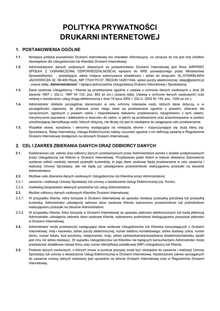 POLITYKA PRYWATNOŚCI DRUKARNI INTERNETOWEJ 1. POSTANOWIENIA OGÓLNE 1.1. Niniejsza polityka prywatności Drukarni Internetowej ma charakter informacyjny, co oznacza że nie jest ona źródłem obowiązków dla Usługobiorców lub Klientów Drukarni Internetowej. 1.2. Administratorem danych osobowych zbieranych za pośrednictwem Drukarni Internetowej jest firma AIRPRINT SPÓŁKA Z OGRANICZONĄ ODPOWIEDZIALNOŚCIĄ wpisana do KRS prowadzonego przez Ministerstwo Sprawiedliwości , posiadająca: adres miejsca wykonywania działalności i adres do doręczeń: AL.STANISŁAWA JACHOWICZA 32, 09-400 Płock, NIP 7743175137, REGON 142611044, adres poczty elektronicznej: [email protected] - zwana dalej „Administratorem” i będąca jednocześnie Usługodawcą Drukarni Internetowej i Sprzedawcą. 1.3. Dane osobowe Usługobiorcy i Klienta są przetwarzane zgodnie z ustawą o ochronie danych osobowych z dnia 29 sierpnia 1997 r. (Dz.U. 1997 Nr 133, poz. 883 ze zm.) (zwana dalej: Ustawą o ochronie danych osobowych) oraz ustawą o świadczeniu usług drogą elektroniczną z dnia 18 lipca 2002 r. (Dz.U. 2002 Nr 144, poz. 1204 ze zm.). 1.4. Administrator dokłada szczególnej staranności w celu ochrony interesów osób, których dane dotyczą, a w szczególności zapewnia, że zbierane przez niego dane są przetwarzane zgodnie z prawem; zbierane dla oznaczonych, zgodnych z prawem celów i niepoddawane dalszemu przetwarzaniu niezgodnemu z tymi celami; merytorycznie poprawne i adekwatne w stosunku do celów, w jakich są przetwarzane oraz przechowywane w postaci umożliwiającej identyfikację osób, których dotyczą, nie dłużej niż jest to niezbędne do osiągnięcia celu przetwarzania. 1.5. Wszelkie słowa, wyrażenia i akronimy występujące na niniejszej stronie i rozpoczynające się dużą literą (np. Sprzedawca, Sklep Internetowy, Usługa Elektroniczna) należy rozumieć zgodnie z ich definicją zawartą w Regulaminie Drukarni Internetowej dostępnym na stronach Drukarni Internetowej. 2. CEL I ZAKRES ZBIERANIA DANYCH ORAZ ODBIORCY DANYCH 2.1. Każdorazowo cel, zakres oraz odbiorcy danych przetwarzanych przez Administratora wynika z działań podejmowanych przez Usługobiorcę lub Klienta w Drukarni Internetowej. Przykładowo jeżeli Klient w trakcie składania Zamówienia wybierze odbiór osobisty zamiast przesyłki kurierskiej, to jego dane osobowe będą przetwarzane w celu zawarcia i realizacji Umowy Sprzedaży, ale nie będą już udostępniane przewoźnikowi realizującemu przesyłki na zlecenie Administratora. 2.2. Możliwe cele zbierania danych osobowych Usługobiorców lub Klientów przez Administratora: 2.2.1. zawarcie i realizacja Umowy Sprzedaży lub umowy o świadczenie Usługi Elektronicznej (np. Konto). 2.2.2. marketing bezpośredni własnych produktów lub usług Administratora. 2.3. Możliwi odbiorcy danych osobowych Klientów Drukarni Internetowej: 2.3.1. W przypadku Klienta, który korzysta w Drukarni Internetowej ze sposobu dostawy przesyłką pocztową lub przesyłką kurierską, Administrator udostępnia zebrane dane osobowe Klienta wybranemu przewoźnikowi lub pośrednikowi realizującemu przesyłki na zlecenie Administratora. 2.3.2. W przypadku Klienta, który korzysta w Drukarni Internetowej ze sposobu płatności elektronicznych lub kartą płatniczą Administrator udostępnia zebrane dane osobowe Klienta, wybranemu podmiotowi obsługującemu powyższe płatności w Drukarni Internetowej. 2.4. Administrator może przetwarzać następujące dane osobowe Usługobiorców lub Klientów korzystających z Drukarni Internetowej: imię i nazwisko; adres poczty elektronicznej; numer telefonu kontaktowego; adres dostawy (ulica, numer domu, numer lokalu, kod pocztowy, miejscowość, kraj), adres zamieszkania/prowadzenia działalności/siedziby (jeżeli jest inny niż adres dostawy). W wypadku Usługobiorców lub Klientów nie będących konsumentami Administrator może przetwarzać dodatkowo nazwę firmy oraz numer identyfikacji podatkowej (NIP) Usługobiorcy lub Klienta. 2.5. Podanie danych osobowych, o których mowa w punkcie powyżej może być niezbędne do zawarcia i realizacji Umowy Sprzedaży lub umowy o świadczenie Usługi Elektronicznej w Drukarni Internetowej. Każdorazowo zakres wymaganych do zawarcia umowy danych wskazany jest uprzednio na stronie Drukarni Internetowej oraz w Regulaminie Drukarni Internetowej. 3. COOKIES I DANE EKSPLOATACYJNE 3.1. Pliki Cookies (ciasteczka) są to niewielkie informacje tekstowe w postaci plików tekstowych, wysyłane przez serwer i zapisywane po stronie osoby odwiedzającej stronę Drukarni Internetowej (np. na dysku twardym komputera, laptopa, czy też na karcie pamięci smartfona – w zależności z jakiego urządzenia korzysta odwiedzający nasz Sklep Internetowy). Szczegółowe informacje dot. plików Cookies, a także historię ich powstania można znaleźć m.in. tutaj: http://pl.wikipedia.org/wiki/Ciasteczko. 3.2. Administrator może przetwarzać dane zawarte w plikach Cookies podczas korzystania przez odwiedzających ze strony Drukarni Internetowej w następujących celach: 3.2.1. identyfikacji Usługobiorców jako zalogowanych w Drukarni Internetowej i pokazywania, że są zalogowani; 3.2.2. zapamiętywania Produktów dodanych do koszyka w celu złożenia Zamówienia; 3.2.3. zapamiętywania danych z wypełnianych Formularzy Zamówienia, ankiet lub danych logowania do Drukarni Internetowej; 3.2.4. dostosowywania zawartości strony Drukarni Internetowej do indywidualnych preferencji Usługobiorcy (np. dotyczących kolorów, rozmiaru czcionki, układu strony) oraz optymalizacji korzystania ze stron Drukarni Internetowej; 3.2.5. prowadzenia anonimowych statystyk przedstawiających sposób korzystania ze strony Drukarni Internetowej. 3.3. Standardowo większość przeglądarek internetowych dostępnych na rynku domyślnie akceptuje zapisywanie plików Cookies. Każdy ma możliwość określenia warunków korzystania z plików 