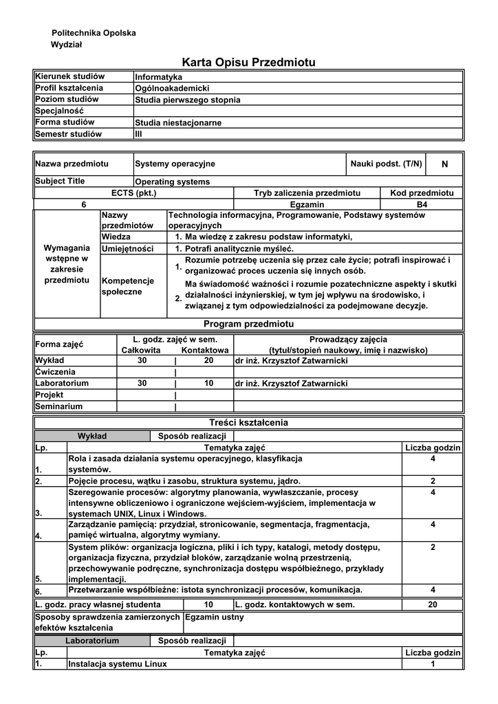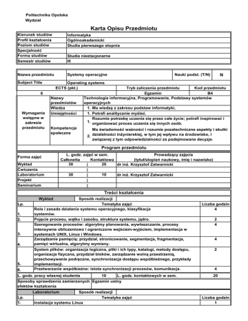 Politechnika Opolska Wydział Karta Opisu Przedmiotu Kierunek studiów Profil kształcenia Poziom studiów Specjalność Forma studiów Semestr studiów Studia niestacjonarne III Nazwa przedmiotu Systemy operacyjne Subject Title Całk. 6 Wymagania wstępne w zakresie przedmiotu Informatyka Ogólnoakademicki Studia pierwszego stopnia Nauki podst. (T/N) N Operating systems ECTS (pkt.) Tryb zaliczenia przedmiotu Kod przedmiotu Kont. 3 Prakt. 3 Egzamin B4 Nazwy Technologia informacyjna, Programowanie, Podstawy systemów przedmiotów operacyjnych Wiedza 1. Ma wiedzę z zakresu podstaw informatyki, 2. Umiejętności 1. Potrafi analitycznie myśleć. Rozumie potrzebę uczenia się przez całe życie; potrafi inspirować i 1. organizować proces uczenia się innych osób. Kompetencje Ma świadomość ważności i rozumie pozatechniczne aspekty i skutki społeczne 2. działalności inżynierskiej, w tym jej wpływu na środowisko, i związanej z tym odpowiedzialności za podejmowane decyzje. Program przedmiotu Forma zajęć Wykład Ćwiczenia Laboratorium Projekt Seminarium L. godz. zajęć w sem. Prowadzący zajęcia Całkowita Kontaktowa (tytuł/stopień naukowy, imię i nazwisko) 30 20 dr inż. Krzysztof Zatwarnicki | | 30 10 dr inż. Krzysztof Zatwarnicki | | | Treści kształcenia Wykład Lp. 1. 2. 3. 4. 5. 6. Sposób realizacji Tematyka zajęć Rola i zasada działania systemu operacyjnego, klasyfikacja systemów. Pojęcie procesu, wątku i zasobu, struktura systemu, jądro. Szeregowanie procesów: algorytmy planowania, wywłaszczanie, procesy intensywne obliczeniowo i ograniczone wejściem-wyjściem, implementacja w systemach UNIX, Linux i Windows. Zarządzanie pamięcią: przydział, stronicowanie, segmentacja, fragmentacja, pamięć wirtualna, algorytmy wymiany. System plików: organizacja logiczna, pliki i ich typy, katalogi, metody dostępu, organizacja fizyczna, przydział bloków, zarządzanie wolną przestrzenią, przechowywanie podręczne, synchronizacja dostępu współbieżnego, przykłady implementacji. Przetwarzanie współbieżne: istota synchronizacji procesów, komunikacja. L. godz. pracy własnej studenta 10 L. godz. kontaktowych w sem. Sposoby sprawdzenia zamierzonych Egzamin ustny efektów kształcenia 2 4 4 2 4 20 Laboratorium Lp. 1. Sposób realizacji Tematyka zajęć Instalacja systemu Linux Liczba godzin 4 Liczba godzin 1 2. 3. 4. 5. Podstawowe komenty powłoki Bash Programowanie skryptów powłoki Bash Zarządzanie dyskami i systemami plików Uruchamianie, zarządzanie procesami i demonami w systemie Unix 3 4 1 1 L. godz. pracy własnej studenta 20 L. godz. kontaktowych w sem. 10 Sposoby sprawdzenia zamierzonych Ocena poprawności wykonania ćwiczeń efektów kształcenia 1. Ma wiedzę z zakresu podstaw systemów operacyjnych (W). Wiedza Rozumie sposób pracy mechanizmów stosowanych w 3. systemach operacyjnych (W). Umiejętności Efekty kształcenia dla przedmiotu - po zakończonym cyklu kształcenia Potrafi pracować z systemami operacyjnymi klasy Windows i 1. Unix (L). Potrafi wskazać źródło problemów związanych z 2. nieprawidłowo działającym systemem (L). Prawidłowo identyfikuje i rozstrzyga dylematy związane z 1. wykonywaniem zawodu (W,L). Kompetencje społeczne Ma świadomość roli społecznej absolwenta uczelni technicznej, a zwłaszcza rozumie potrzebę formułowania i przekazywania społeczeństwu, w szczególności poprzez 2. środki masowego przekazu, informacji i opinii dotyczących osiągnięć techniki i innych aspektów działalności inżynierskiej; podejmuje starania, aby przekazać takie informacje i opinie w sposób powszechnie zrozumiały (W). Metody dydaktyczne: Wykład informacyjny, prezentacje multimedialne. Dyskusja dydaktyczna w ramach laboratorium. Forma i warunki zaliczenia przedmiotu: Laboratorium: poprawne wykonanie wszystkich przewidzianych programem ćwiczeń; pozytywne oceny z egzaminu ustnego, uzyskanie zaliczenia z laboratorium. Wykład : Literatura podstawowa: [1] A. Silberschatz, P. Galvin, G. Gagne: Podstawy systemów operacyjnych, WNT 2006. [2] [3] A.S. Tanenbaum: Strukturalna organizacja systemów komputerowych, Helion 2006. Literatura uzupełniająca: [1] M. Rochkind: Programowanie w systemie UNIX dla zaawansowanych, WNT 2007. [2] [3] M. Ben-Ari: Podstawy programowania współbieŜnego i rozproszonego, WNT 1996. ______________ * niewłaściwe przekreślić ………………………………………………….. ………………………………………………………. (kierownik jednostki organizacyjnej/bezpośredni przełożony: pieczęć/podpis (Dziekan Wydziału pieczęć/podpis)
