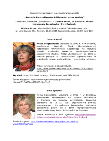 Serdecznie zapraszamy na emocjonującą debatę „Tracenie i odzyskiwanie Solidarności przez kobiety” z udziałem działaczek „Solidarności” – Danuty Kuroń, dr Barbary Labudy, Małgorzaty Tarasiewicz i Ewy Zydorek. Miejsce i czas: Wydział Nauk Politycznych i Dziennikarstwa UAM, ul. Umultowska 89a, Poznań, 11.06.2015 (czwartek), godz. 10:00, sala 125. Danuta Kuroń Notka biograficzna: urodzona w 1949 r. w Warszawie, absolwentka Wydziału Nauk Humanistycznych Katolickiego Uniwersytetu Lubelskiego na kierunku historia, działaczka społeczna, współorganizatorka podziemnych struktur NSZZ „Solidarność”, od 1986 r. struktur jawnych na Lubelszczyźnie, odpowiedzialna za organizację prasy, wydawnictwa i wszechnicy wiejskiej. Więcej informacji o Danucie Kuroń: http://www.powiat.hajnowka.pl/archiwum/2008/luty/dkuron.html Wywiad: http://ludziesektora.ngo.pl/ludziesektora/458749.html Źródło fotografii: http://www.wysokieobcasy.pl/wysokieobcasy/51,96856,4807026.html?i=0 Ewa Zydorek Notka biograficzna: urodzona w 1955 r. w Poznaniu, absolwentka Uniwersytetu im. Adama Mickiewicza w Poznaniu na kierunku psychologia, działaczka społeczna, po 13 XII 1981 organizatorka pomocy internowanym i ich rodzinom, kolporterka, redaktorka podziemnej prasy, od I 1984 współpracowniczka Międzyzakładowej Rady „Solidarności” w Poznaniu. Więcej informacji o Ewie Zydorek: http://encyklopediasolidarnosci.pl/wiki/index.php?title=Ewa_Zydorek Źródło fotografii: http://www.solidarnosc.org.pl/poznan/zdjeciawiad/2010/EWA.jpg Polecamy: Literatura: Shana Penn, Podziemie kobiet, Wyd. Rosner & Wspólnicy, Warszawa 2003 Film: Solidarność według kobiet: https://www.youtube.com/watch?v=gM42QiNq8kw Barbara Lidia Labuda Notka biograficzna: urodzona w 1946 w Żmigrodzie. Absolwentka Uniwersytetu Wrocławskiego, Instytut Filologii Romańskiej. W latach 70. działaczka opozycji antytotalitarnej związana z KOR, a następnie, od 1980 r., z „Solidarnością”. Od 1989, posłanka na Sejm kontraktowy z poparciem Komitetu Obywatelskiego. W 1994 została członkiem Unii Wolności. Więcej informacji o Barbarze Labudzie: http://www.encyklopediasolidarnosci.pl/wiki/index.php?title=Barbara_Lidia_Labuda Źródło fotografii: http://www.podlaskikongreskobiet.pl/barbara-labuda/ Polecamy: Wywiad: http://wyborcza.pl/1,91446,16076441,Labuda__bilans_tych_25_lat_jest_bardzo _dobry.html Małgorzata Maria Tarasiewicz Notka biograficzna: urodzona w 1960 r. w Sopocie. Absolwentka Uniwersytetu Gdańskiego (politologia i anglistyka). W drugiej połowie lat 80. działaczka organizacji Wolność i Pokój. Następnie koordynatorka Komisji Kobiet NSZZ „Solidarność”, prezeska polskiego oddziału Amnesty International. Związana również z organizacją Network of East-West Women (najpierw jako koordynatorka biura w Nowym Jorku, a później dyrektorka polskiego oddziału). Więcej informacji o Małgorzacie Tarasiewicz: http://mtarasiewicz.pl/?page_id=11 Źródło fotografii: http://mtarasiewicz.pl/?page_id=11 Polecamy: Literatura: Shana Penn, Sekret Solidarności, Wyd. W.A.B., Warszawa 2013. Ewa Kondratowicz, Szminka na sztandarze, Wyd. Sic!, 2001. Spektakl: Sprawa Operacyjnego Rozpoznania, reż. Zbigniew Brzoza, Teatr Wybrzeże. Wywiad: http://wiadomosci.ngo.pl/wiadomosc/681852.html