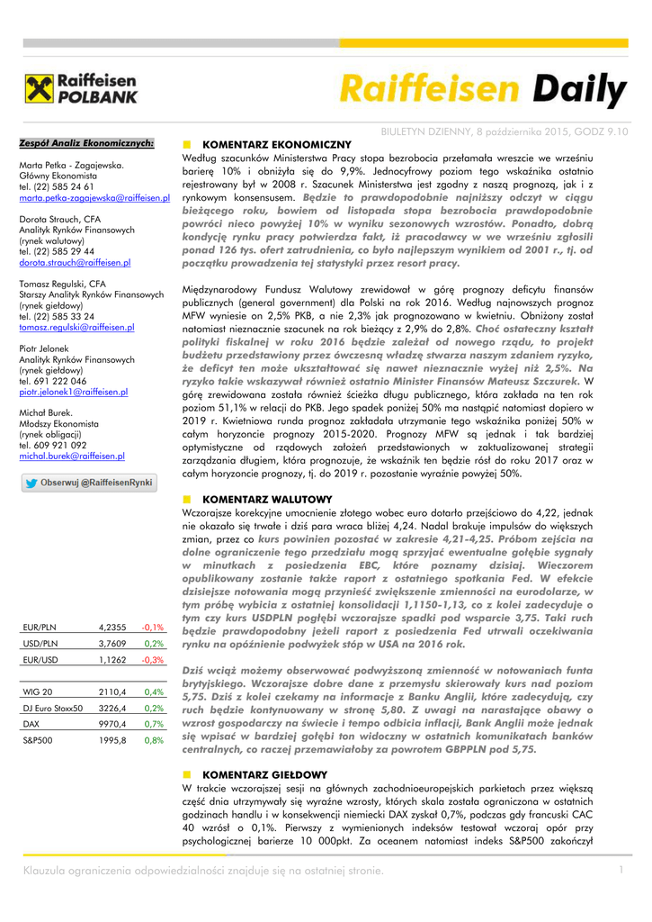 Zespół Analiz Ekonomicznych: Marta Petka - Zagajewska. Główny Ekonomista tel. (22) 585 24 61 [email protected] Dorota Strauch, CFA Analityk Rynków Finansowych (rynek walutowy) tel. (22) 585 29 44 [email protected] Tomasz Regulski, CFA Starszy Analityk Rynków Finansowych (rynek giełdowy) tel. (22) 585 33 24 [email protected] Piotr Jelonek Analityk Rynków Finansowych (rynek giełdowy) tel. 691 222 046 [email protected] Michał Burek. Młodszy Ekonomista (rynek obligacji) tel. 609 921 092 [email protected] EUR/PLN 4,2355 -0,1% USD/PLN 3,7609 0,2% EUR/USD 1,1262 -0,3% WIG 20 2110,4 0,4% DJ Euro Stoxx50 3226,4 0,2% DAX 9970,4 0,7% S&P500 1995,8 0,8% BIULETYN DZIENNY, 8 października 2015, GODZ 9.10 KOMENTARZ EKONOMICZNY Według szacunków Ministerstwa Pracy stopa bezrobocia przełamała wreszcie we wrześniu barierę 10% i obniżyła się do 9,9%. Jednocyfrowy poziom tego wskaźnika ostatnio rejestrowany był w 2008 r. Szacunek Ministerstwa jest zgodny z naszą prognozą, jak i z rynkowym konsensusem. Będzie to prawdopodobnie najniższy odczyt w ciągu bieżącego roku, bowiem od listopada stopa bezrobocia prawdopodobnie powróci nieco powyżej 10% w wyniku sezonowych wzrostów. Ponadto, dobrą kondycję rynku pracy potwierdza fakt, iż pracodawcy w we wrześniu zgłosili ponad 126 tys. ofert zatrudnienia, co było najlepszym wynikiem od 2001 r., tj. od początku prowadzenia tej statystyki przez resort pracy. Międzynarodowy Fundusz Walutowy zrewidował w górę prognozy deficytu finansów publicznych (general government) dla Polski na rok 2016. Według najnowszych prognoz MFW wyniesie on 2,5% PKB, a nie 2,3% jak prognozowano w kwietniu. Obniżony został natomiast nieznacznie szacunek na rok bieżący z 2,9% do 2,8%. Choć ostateczny kształt polityki fiskalnej w roku 2016 będzie zależał od nowego rządu, to projekt budżetu przedstawiony przez ówczesną władzę stwarza naszym zdaniem ryzyko, że deficyt ten może ukształtować się nawet nieznacznie wyżej niż 2,5%. Na ryzyko takie wskazywał również ostatnio Minister Finansów Mateusz Szczurek. W górę zrewidowana została również ścieżka długu publicznego, która zakłada na ten rok poziom 51,1% w relacji do PKB. Jego spadek poniżej 50% ma nastąpić natomiast dopiero w 2019 r. Kwietniowa runda prognoz zakładała utrzymanie tego wskaźnika poniżej 50% w całym horyzoncie prognozy 2015-2020. Prognozy MFW są jednak i tak bardziej optymistyczne od rządowych założeń przedstawionych w zaktualizowanej strategii zarządzania długiem, która prognozuje, że wskaźnik ten będzie rósł do roku 2017 oraz w całym horyzoncie prognozy, tj. do 2019 r. pozostanie wyraźnie powyżej 50%. KOMENTARZ WALUTOWY Wczorajsze korekcyjne umocnienie złotego wobec euro dotarło przejściowo do 4,22, jednak nie okazało się trwałe i dziś para wraca bliżej 4,24. Nadal brakuje impulsów do większych zmian, przez co kurs powinien pozostać w zakresie 4,21-4,25. Próbom zejścia na dolne ograniczenie tego przedziału mogą sprzyjać ewentualne gołębie sygnały w minutkach z posiedzenia EBC, które poznamy dzisiaj. Wieczorem opublikowany zostanie także raport z ostatniego spotkania Fed. W efekcie dzisiejsze notowania mogą przynieść zwiększenie zmienności na eurodolarze, w tym próbę wybicia z ostatniej konsolidacji 1,1150-1,13, co z kolei zadecyduje o tym czy kurs USDPLN pogłębi wczorajsze spadki pod wsparcie 3,75. Taki ruch będzie prawdopodobny jeżeli raport z posiedzenia Fed utrwali oczekiwania rynku na opóźnienie podwyżek stóp w USA na 2016 rok. Dziś wciąż możemy obserwować podwyższoną zmienność w notowaniach funta brytyjskiego. Wczorajsze dobre dane z przemysłu skierowały kurs nad poziom 5,75. Dziś z kolei czekamy na informacje z Banku Anglii, które zadecydują, czy ruch będzie kontynuowany w stronę 5,80. Z uwagi na narastające obawy o wzrost gospodarczy na świecie i tempo odbicia inflacji, Bank Anglii może jednak się wpisać w bardziej gołębi ton widoczny w ostatnich komunikatach banków centralnych, co raczej przemawiałoby za powrotem GBPPLN pod 5,75. KOMENTARZ GIEŁDOWY W trakcie wczorajszej sesji na głównych zachodnioeuropejskich parkietach przez większą część dnia utrzymywały się wyraźne wzrosty, których skala została ograniczona w ostatnich godzinach handlu i w konsekwencji niemiecki DAX zyskał 0,7%, podczas gdy francuski CAC 40 wzrósł o 0,1%. Pierwszy z wymienionych indeksów testował wczoraj opór przy psychologicznej barierze 10 000pkt. Za oceanem natomiast indeks S&P500 zakończył Klauzula ograniczenia odpowiedzialności znajduje się na ostatniej stronie. 1 BIULETYN DZIENNY, 8 października 2015, GODZ 9.10 wczorajsze notowania wzrostem o 0,8% tuż pod barierą 2000pkt. W najbliższym czasie przy pustym kalendarzu makro uwaga inwestorów będzie skierowana na trwający sezon publikacji raportów kwartalnych, a ten wyraźnie przyspieszy dopiero w przyszłym tygodniu, gdy poznamy pierwsze kwartalne raporty dla największych amerykańskich banków. Do tego czasu w notowaniach indeksu S&P500 może zabraknąć impulsów do trwałego pokonania psychologicznej bariery 2000pkt. W najbliższym czasie lepiej mogą sobie radzić spółki paliwowe, którym będzie sprzyjać obserwowane na rynkach odbicie cen ropy. W trakcie wczorajszej sesji wzrosty nie ominęły również warszawskiego parkietu, gdzie indeks WIG20 zyskał 0,4%, podczas gdy mWIG40 oraz sWIG80 zyskały odpowiednio 0,8% oraz 0,3%. Indeks polskich blue chipów potwierdził wczoraj powrót ponad barierę 2100pkt. jednak jeszcze jest zbyt wcześnie do stwierdzenia trwałej poprawy perspektyw w jego notowaniach. Warto natomiast zwrócić uwagę na indeksy średnich spółek. Po tym jak w ostatnim czasie padły sygnały kupna w przypadku indeksu sWIG80, w notowaniach mWIG40 w najbliższym czasie również może dojść do istotnych rozstrzygnięć. Jego perspektywy uległyby zdecydowanej poprawie w przypadku pokona