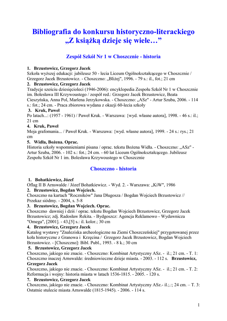 Historia szkoły wspomnieniami pisana / oprac. tekstu Bożena Widła. - Choszczno: „ASz" Artur Szuba, 2006. - 102 s.: fot.; 24 cm. - 60 lat Liceum Ogólnokształcącego. Jubileusz