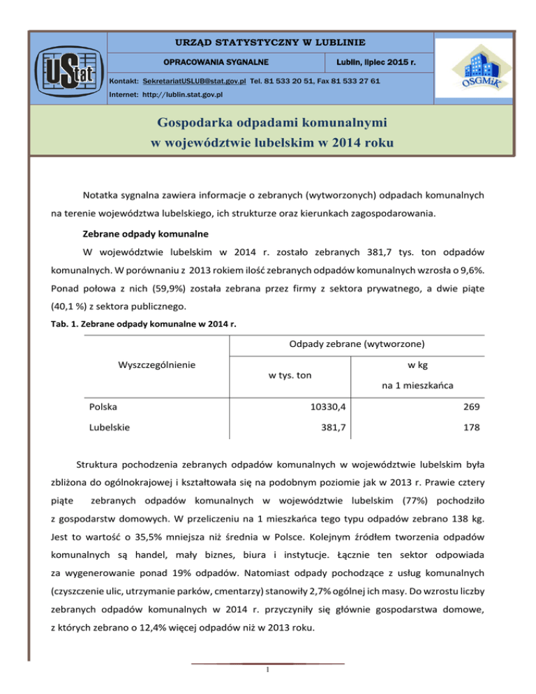 URZĄD STATYSTYCZNY W LUBLINIE OPRACOWANIA SYGNALNE Lublin, lipiec 2015 r. Kontakt: [email protected] Tel. 81 533 20 51, Fax 81 533 27 61 Internet: http://lublin.stat.gov.pl Gospodarka odpadami komunalnymi w województwie lubelskim w 2014 roku Notatka sygnalna zawiera informacje o zebranych (wytworzonych) odpadach komunalnych na terenie województwa lubelskiego, ich strukturze oraz kierunkach zagospodarowania. Zebrane odpady komunalne W województwie lubelskim w 2014 r. zostało zebranych 381,7 tys. ton odpadów komunalnych. W porównaniu z 2013 rokiem ilość zebranych odpadów komunalnych wzrosła o 9,6%. Ponad połowa z nich (59,9%) została zebrana przez firmy z sektora prywatnego, a dwie piąte (40,1 %) z sektora publicznego. Tab. 1. Zebrane odpady komunalne w 2014 r. Odpady zebrane (wytworzone) Wyszczególnienie w kg w tys. ton na 1 mieszkańca Polska 10330,4 269 381,7 178 Lubelskie Struktura pochodzenia zebranych odpadów komunalnych w województwie lubelskim była zbliżona do ogólnokrajowej i kształtowała się na podobnym poziomie jak w 2013 r. Prawie cztery piąte zebranych odpadów komunalnych w województwie lubelskim (77%) pochodziło z gospodarstw domowych. W przeliczeniu na 1 mieszkańca tego typu odpadów zebrano 138 kg. Jest to wartość o 35,5% mniejsza niż średnia w Polsce. Kolejnym źródłem tworzenia odpadów komunalnych są handel, mały biznes, biura i instytucje. Łącznie ten sektor odpowiada za wygenerowanie ponad 19% odpadów. Natomiast odpady pochodzące z usług komunalnych (czyszczenie ulic, utrzymanie parków, cmentarzy) stanowiły 2,7% ogólnej ich masy. Do wzrostu liczby zebranych odpadów komunalnych w 2014 r. przyczyniły się głównie gospodarstwa domowe, z których zebrano o 12,4% więcej odpadów niż w 2013 roku. 1 Rys. 1. Źródła pochodzenia odpadów komunalnych w województwie lubelskim w 2014 r. 19% 3% 78% Handel, mały biznes, biura i instytucje Usługi komunalne Gospodarstwa domowe Ilość odpadów komunalnych, które w 2014 r. zebrano w województwie lubelskim była nieco wyższa niż w latach 2009-2013, w których utrzymywała się na poziomie 150 kg na 1 mieszkańca. W 2014 r. w Polsce zauważalny był również niewielki wzrost (o 3%) ilości odpadów komunalnych, zwłaszcza w porównaniu do 2009 r. (z 263 do 268 kg na 1 mieszkańca). Rys. 2. Odpady komunalne zebrane na 1 mieszkańca kg 300 250 200 150 100 50 0 2009 2010 2011 Polska 2012 2013 2014 lata lubelskie Porównując województwo lubelskie z innymi województwami można stwierdzić, że ilość zebranych odpadów komunalnych przypadających na 1 mieszkańca jest o ponad 13% większa niż w województwie świętokrzyskim, lecz o śląskim. 2 47,5% mniejsza niż w województwie W województwie lubelskim w 2014 r. udział odpadów zmieszanych w ogólnej liczbie zebranych odpadów komunalnych był wysoki i wyniósł 80,0% (niemal zrównał się ze średnią krajową). W ostatnich latach można zauważyć pozytywne efekty polityki gospodarki odpadami. Powstawanie nowych sortowni i sukcesywne wprowadzanie pojemników do selektywnej zbiórki odpadów komunalnych spowodowało, że utrzymuje się spadek udziału ilości odpadów zebranych w sposób nieselektywny, który w latach 2009-2014 wyniósł 11,5 punktu procentowego. Rys. 3. Struktura zebranych odpadów komunalnych według metod ich pozyskiwania w województwie lubelskim % 120 100 80 60 40 20 0 2009 2010 2011 zmieszane 2012 2013 2014 lata zebrane selektywnie W 2014 r. w województwie lubelskim zebrano 305,3 tys. ton zmieszanych odpadów komunalnych, tj. o 0,7% więcej niż w 2013 r. Masa odpadów zmieszanych zebranych z gospodarstw domowych wyniosła 229,7 tys. ton i stanowiła trzy czwarte ogólnej ich ilości (75,2%), przy czym w porównaniu z poprzednim rokiem zanotowano wzrost ich udziału o 1,8%. Najwięcej zmieszanych odpadów komunalnych z gospodarstw domowych w przeliczeniu na 1 mieszkańca zebrano w miastach: Biała Podlaska (202 kg), Zamość (174 kg) i Lublin (173 kg), podczas gdy najmniej w powiatach: chełmskim (49 kg), łukowskim (55 kg) i radzyńskim (55 kg). 3 Rys. 4. Zmieszane odpady komunalne zebrane z gospodarstw domowych w województwie lubelskim w 2014 r. BIAŁA PODLASKA łukowski bialski radzyński parczewski rycki lubartowski włodawski puławski łęczyński LUBLIN CHEŁM świdnicki opolski chełmski lubelski krasnostawski hrubieszowski kraśnicki ZAMOŚĆ janowski zamojski województwo lubelskie 106,7 kg biłgorajski tomaszowski na 1 mieszkańca w kg poniżej 60 90 120 150 i więcej Selektywna zbiórka odpadów Udział odpadów zebranych selektywnie i wysegregowanych z frakcji suchej znacznie się zwiększył. Wpływ na taką sytuację miało wprowadzenie ustawy o utrzymaniu czystości i porządku w gminach. W 2014 r. w województwie lubelskim zebrano selektywnie i wysegregowano z frakcji suchej jedną piątą odpadów komunalnych (20%). Było to nieznacznie więcej niż średnio w kraju (19,8%) i stanowiło ponad 76 tys. ton. W porównaniu do 2013 r. ilość odpadów zebranych selektywnie wzrosła o 68,9%. Nadal dominującą rolę w pozyskiwaniu odpadów zebranych selektywnie z udziałem 88% miały gospodarstwa domowe. Znaczna zmiana nastąpiła w przypadku handlu, małego biznesu, biur i instytucji oraz usług komunalnych, gdzie odnotowano spadek udziału selektywnie zebranych odpadów odpowiednio o 2,5 p.proc. i 0,2 p.proc. 4 Rys. 5. Źródła pochodzenia odpadów komunalnych zebranych selektywnie w 2014 r. 2% 10% 88% Handel, mały biznes, biura i instytucje Usługi komunalne Gospodarstwa domowe W okresie ostatnich pięciu lat ilość odpadów zebranych selektywnie w województwie lubelskim wzrosła ponad dwukrotnie, chociaż ich struktura nie uległa większym zmianom. Największą dynamiką wzrostu odznaczały się odpady biodegradowalne i zużyty sprzęt elektryczny i elektroniczny. Udział metali, odpadów wielkogabarytowych i odpadów niebezpiecznych w ogólnej ilości odpadów zebranych selek