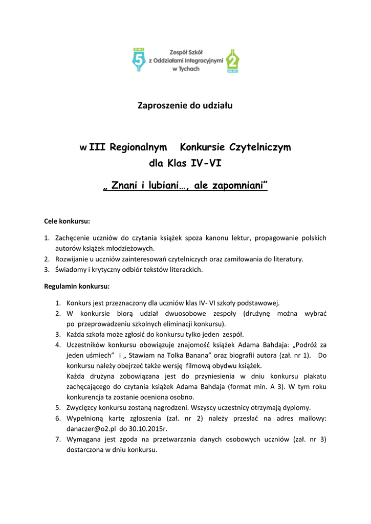 Zaproszenie do udziału w III Regionalnym Konkursie Czytelniczym dla Klas IV-VI „ Znani i lubiani…, ale zapomniani” Cele konkursu: 1. Zachęcenie uczniów do czytania książek spoza kanonu lektur, propagowanie polskich autorów książek młodzieżowych. 2. Rozwijanie u uczniów zainteresowań czytelniczych oraz zamiłowania do literatury. 3. Świadomy i krytyczny odbiór tekstów literackich. Regulamin konkursu: 1. Konkurs jest przeznaczony dla uczniów klas IV- VI szkoły podstawowej. 2. W konkursie biorą udział dwuosobowe zespoły (drużynę można wybrać po przeprowadzeniu szkolnych eliminacji konkursu). 3. Każda szkoła może zgłosić do konkursu tylko jeden zespół. 4. Uczestników konkursu obowiązuje znajomość książek Adama Bahdaja: „Podróż za jeden uśmiech” i „ Stawiam na Tolka Banana” oraz biografii autora (zał. nr 1). Do konkursu należy obejrzeć także wersję filmową obydwu książek. Każda drużyna zobowiązana jest do przyniesienia w dniu konkursu plakatu zachęcającego do czytania książek Adama Bahdaja (format min. A 3). W tym roku konkurencja ta zostanie oceniona osobno. 5. Zwycięzcy konkursu zostaną nagrodzeni. Wszyscy uczestnicy otrzymają dyplomy. 6. Wypełnioną kartę zgłoszenia (zał. nr 2) należy przesłać na adres mailowy: [email protected] do 30.10.2015r. 7. Wymagana jest zgoda na przetwarzania danych osobowych uczniów (zał. nr 3) dostarczona w dniu konkursu. TERMIN: 25 listopada 2015 roku o godz. 9.00 MIEJSCE: Zespół Szkół z Oddziałami Integracyjnymi w Tychach, ul. Czarnieckiego 22 ORGANIZATOR: Szkoła Podstawowa nr 5 w Zespole Szkół z Oddziałami Integracyjnymi w Tychach Organizatorzy: Danuta Czerwińska (tel. 668 295 312, Irena Milak (tel. 607 407 391) Załącznik nr 1 Adam Bahdaj, ps. Jan Kot, Dominik Damian (ur. 2 stycznia 1918 w Zakopanem, zm. 7 maja 1985 w Warszawie) – polski pisarz, tłumacz z języka węgierskiego. Uczestnik wojny obronnej 1939. W czasie II wojny światowej był kurierem tatrzańskim. Studiował na Wydziale Prawa UJ w Krakowie i w Szkole Głównej Handlowej w Warszawie. Uczestnik wojny obronnej 1939; następnie działacz Polonii na Węgrzech. W 1945 powrócił do kraju. A. Bahdaj jest znany głównie z powieści dla dzieci i młodzieży. W plebiscycie czytelników „Płomyka” i „Świata Młodych” na najpopularniejszego pisarza otrzymał w 1970 „Orle Pióro”, a w 1974 – nagrodę Prezesa Rady Ministrów za całokształt twórczości dla dzieci i młodzieży. W latach 1988-1992 w łódzkim Se-ma-forze zrealizowano 26 odcinkowy animowany serial lalkowy Mały Pingwin Pik-Pok na podstawie książki Adama Bahdaja. Bohaterem jest pingwinek, który ma dość siedzenia na Wyspie Śnieżnych Burz i postanawia zwiedzić świat. Twórczość Mały ratownik (1953) Na śnieżnej trasie (1953) Przygody Wojtka (1953) Narciarski ślad (1954) Droga przez góry (1956), wspomnienia z młodości Do przerwy 0:1 (1957), na jej podstawie powstał serial telewizyjny i film kinowy Paragon gola; kontynuacja przygód bohaterów to Wakacje z duchami O siódmej w Budapeszcie (1958) Order z księżyca (1959) Wakacje z duchami (1961), dalszy ciąg przygód bohaterów Do przerwy 0:1, na jej podstawie powstał serial telewizyjny (lektura do klasy 6. szkoły podstawowej) Uwaga! Czarny parasol! (1963) Podróż za jeden uśmiech (1964), na jej podstawie powstał serial telewizyjny i film pełnometrażowy Piraci z Wysp Śpiewających (1965) Kapelusz za sto tysięcy (1966) Stawiam na Tolka Banana (1966), na jej podstawie powstał serial telewizyjny W stronę Kansas City (1969) Czarne sombrero (1970) Trzecia granica (1973-1974), wspomnienia z młodości, na jej podstawie postał serial telewizyjny Telemach w dżinsach (1979), nagroda Srebrne Koziołki w 1981, dalszy ciąg to Gdzie twój dom, Telemachu?, na podstawie obu książek powstał film fabularny W piątą stronę świata Gdzie twój dom, Telemachu? (1982), dalszy ciąg Telemacha w dżinsach, w 1984 książka została wpisana na Listę Honorową IBBY Dan Drewer i Indianie (1985) Tańczący słoń (1987) Ekranizacje: Do przerwy 0:1 Podróż za jeden uśmiech Stawiam na Tolka Banana Trzecia granica Wakacje z duchami W piątą stronę świata Załącznik nr 2 Karta zgłoszenia uczestników konkursu czytelniczego „ Znani i lubiani…, ale zapomniani” 1. Imię i nazwisko ucznia a) …………………………………………. b) …………………………………………. 2. Nazwa i adres szkoły, e-mail, telefon kontaktowy: …………………………………………………………………………………………………………………………. 3. Imię i nazwisko opiekuna oraz telefon kontaktowy: ………………………………………………………………………………… Załącznik nr 3 Oświadczenie o wyrażeniu zgody na przetwarzanie danych osobowych dziecka Wyrażam zgodę na przetwarzanie danych osobowych mojego syna/córki ……………………………………………………………………………………………………………………………………………… oraz opublikowanie wizerunku dziecka na stronie internetowej Zespołu Szkół z Oddziałami Integracyjnymi w Tychach oraz w prasie lokalnej dla celów konkursu „ Znani i lubiani…, ale zapomniani”. …………………………………………………………. Data i podpis rodzica/ opiekuna Zespół Szkół z Oddziałami Integracyjnymi ul. Czarnieckiego 22, 43-100 Tychy tel/fax: 032 227 37 93, 032 327 59 80, www.zszoi.pl, e-mail: [email protected]