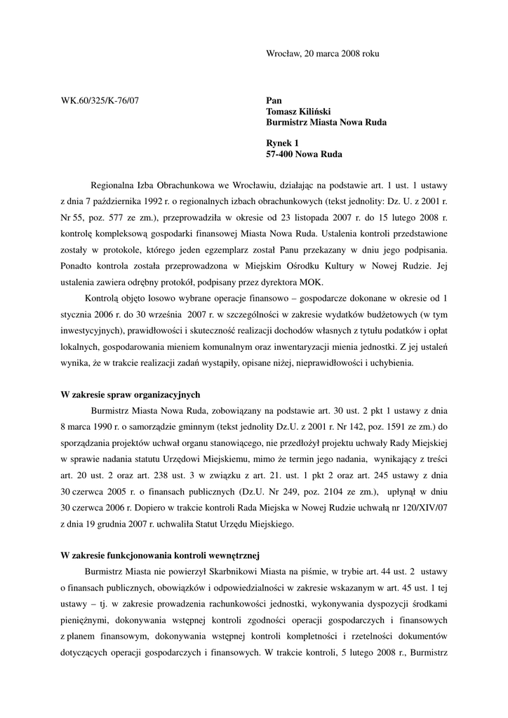 Wrocław, 20 marca 2008 roku WK.60/325/K-76/07 Pan Tomasz Kiliński Burmistrz Miasta Nowa Ruda Rynek 1 57-400 Nowa Ruda Regionalna Izba Obrachunkowa we Wrocławiu, działając na podstawie art. 1 ust. 1 ustawy z dnia 7 października 1992 r. o regionalnych izbach obrachunkowych (tekst jednolity: Dz. U. z 2001 r. Nr 55, poz. 577 ze zm.), przeprowadziła w okresie od 23 listopada 2007 r. do 15 lutego 2008 r. kontrolę kompleksową gospodarki finansowej Miasta Nowa Ruda. Ustalenia kontroli przedstawione zostały w protokole, którego jeden egzemplarz został Panu przekazany w dniu jego podpisania. Ponadto kontrola została przeprowadzona w Miejskim Ośrodku Kultury w Nowej Rudzie. Jej ustalenia zawiera odrębny protokół, podpisany przez dyrektora MOK. Kontrolą objęto losowo wybrane operacje finansowo – gospodarcze dokonane w okresie od 1 stycznia 2006 r. do 30 września 2007 r. w szczególności w zakresie wydatków budżetowych (w tym inwestycyjnych), prawidłowości i skuteczność realizacji dochodów własnych z tytułu podatków i opłat lokalnych, gospodarowania mieniem komunalnym oraz inwentaryzacji mienia jednostki. Z jej ustaleń wynika, że w trakcie realizacji zadań wystąpiły, opisane niżej, nieprawidłowości i uchybienia. W zakresie spraw organizacyjnych Burmistrz Miasta Nowa Ruda, zobowiązany na podstawie art. 30 ust. 2 pkt 1 ustawy z dnia 8 marca 1990 r. o samorządzie gminnym (tekst jednolity Dz.U. z 2001 r. Nr 142, poz. 1591 ze zm.) do sporządzania projektów uchwał organu stanowiącego, nie przedłożył projektu uchwały Rady Miejskiej w sprawie nadania statutu Urzędowi Miejskiemu, mimo że termin jego nadania, wynikający z treści art. 20 ust. 2 oraz art. 238 ust. 3 w związku z art. 21. ust. 1 pkt 2 oraz art. 245 ustawy z dnia 30 czerwca 2005 r. o finansach publicznych (Dz.U. Nr 249, poz. 2104 ze zm.), upłynął w dniu 30 czerwca 2006 r. Dopiero w trakcie kontroli Rada Miejska w Nowej Rudzie uchwałą nr 120/XIV/07 z dnia 19 grudnia 2007 r. uchwaliła Statut Urzędu Miejskiego. W zakresie funkcjonowania kontroli wewnętrznej Burmistrz Miasta nie powierzył Skarbnikowi Miasta na piśmie, w trybie art. 44 ust. 2 ustawy o finansach publicznych, obowiązków i odpowiedzialności w zakresie wskazanym w art. 45 ust. 1 tej ustawy – tj. w zakresie prowadzenia rachunkowości jednostki, wykonywania dyspozycji środkami pieniężnymi, dokonywania wstępnej kontroli zgodności operacji gospodarczych i finansowych z planem finansowym, dokonywania wstępnej kontroli kompletności i rzetelności dokumentów dotyczących operacji gospodarczych i finansowych. W trakcie kontroli, 5 lutego 2008 r., Burmistrz 2 Miasta powierzył Skarbnikowi Miasta na piśmie obowiązki i odpowiedzialność w zakresie wymienionym w art. 45 ust. 1 ustawy o finansach publicznych. W Urzędzie Miejskim nie został dotychczas zatrudniony audytor wewnętrzny, mimo że jednostka spełniała przesłanki, o których mowa w art. 49 ust. 2 i 5 ustawy o finansach publicznych w zakresie wielkości zrealizowanych w 2005 i w 2006 r. kwot wydatków (wyniosły one odpowiednio 35.052.716 zł i 47.267.164 zł), przekraczających kwoty, o których mowa w §§ 3 i 4 rozporządzeń Ministra Finansów: z dnia 20 grudnia 2002 r. w sprawie określenia kwot przychodów oraz wydatków środków publicznych dokonywanych w ciągu roku kalendarzowego, których przekroczenie powoduje obowiązek prowadzenia audytu wewnętrznego w jednostkach sektora finansów publicznych (Dz.U. Nr 234, poz. 1970) oraz z dnia 24 czerwca 2006 r. w sprawie kwot, których przekroczenie powoduje obowiązek prowadzenia audytu wewnętrznego w jednostkach sektora finansów publicznych (Dz.U. Nr 112, poz. 763). Jak wynika z wyjaśnień Burmistrza Miasta, mimo przeprowadzonych konkursów nie udało się dotychczas zatrudnić audytora wewnętrznego. W zakresie gospodarki pieniężnej (kasowej i bankowej) oraz rozrachunków W kasie Urzędu przechowywano druki, których termin obowiązywania minął (weksle, zabezpieczenia należytego wykonania robót w postaci gwarancji bankowych i ubezpieczeniowych). Ponadto Instrukcja ewidencji i kontroli druków ścisłego zarachowania zawierała zapisy dotyczące druków, które wyszły z użycia : karty postoju, karty abonamentowe, identyfikatory i bilety parkingowe, związane z pobieraniem opłat w Strefie Płatnego Parkowania zniesionej w 2004 r. oraz świadectwa pochodzenia zwierząt, wycofane w związku ze zmianą z dniem 13 lutego 2002 r. przepisów art. 7 ust. 3 ustawy z 24 kwietnia 1997 r. o zwalczaniu chorób zakaźnych zwierząt, badaniu zwierząt rzeźnych i mięsa oraz Inspekcji Weterynaryjnej (Dz. U. z 2001 r. Nr 129, poz. 1438). W Instrukcji ewidencji i kontroli druków ścisłego zarachowania kierownik jednostki nie zawarł uregulowań w zakresie postępowania z drukami, które przestały obowiązywać. Przy przechowywaniu zapasu gotówki w kasie nie przestrzegano zasad określonych w treści załącznika nr 4 do Zarządzenia nr 146/06 z 31 października 2006 r. wprowadzającego normę ISO pn. „Obrót gotówkowy”, ponieważ stan gotówki ustalony 4 grudnia 2007 r. przewyższał o 1.536,50 zł wysokość pogotowia kasowego wskazanego w pkt. 3.3.5 ww. Zarządzenia. Ponadto gotówka pobierana z banku nie była ujmowana w prawidłowej podziałce klasyfikacji budżetowej, a mianowicie w paragrafie przewidzianym rozporządzeniami Ministra Finansów w sprawie szczegółowej klasyfikacji dochodów, wydatków, przychodów i rozchodów oraz środków pochodzących ze źródeł zagranicznych z 20 września 2004 r. (Dz. U. Nr 209, poz. 2132 ze zm.) i obowiązującego od 1 lipca 2006 r. (Dz. U. Nr 107, poz. 726 ze zm.). Takie postępowanie naruszyło przepis art. 16 ust. 1 ustawy z 30 czerwca 2005 r. o finansach publicznych, zgodnie z którym wydatki publiczne klasyfikuje się według działów i rozdziałów oraz paragrafów - określających rodzaj dochodu, przychodu lub wydatku. 3 W wyniku nieprzestrzega