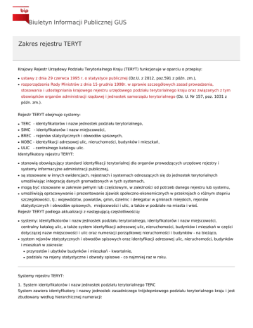 Biuletyn Informacji Publicznej GUS Zakres rejestru TERYT Krajowy Rejestr Urzędowy Podziału Terytorialnego Kraju (TERYT) funkcjonuje w oparciu o przepisy: ● ustawy z dnia 29 czerwca 1995 r. o statystyce publicznej (Dz.U. z 2012, poz.591 z późn. zm.), ● rozporządzenia Rady Ministrów z dnia 15 grudnia 1998r. w sprawie szczegółowych zasad prowadzenia, stosowania i udostępniania krajowego rejestru urzędowego podziału terytorialnego kraju oraz związanych z tym obowiązków organów administracji rządowej i jednostek samorządu terytorialnego (Dz. U. Nr 157, poz. 1031 z późn. zm.). Rejestr TERYT obejmuje systemy: ● TERC - identyfikatorów i nazw jednostek podziału terytorialnego, ● SIMC - identyfikatorów i nazw miejscowości, ● BREC - rejonów statystycznych i obwodów spisowych, ● NOBC - identyfikacji adresowej ulic, nieruchomości, budynków i mieszkań, ● ULIC - centralnego katalogu ulic. Identyfikatory rejestru TERYT: ● stanowią obowiązujący standard identyfikacji terytorialnej dla organów prowadzących urzędowe rejestry i systemy informacyjne administracji publicznej, ● są stosowane w innych ewidencjach, rejestrach i systemach odnoszących się do jednostek terytorialnych umożliwiając integrację danych gromadzonych w tych systemach, ● mogą być stosowane w zakresie pełnym lub częściowym, w zależności od potrzeb danego rejestru lub systemu, ● umożliwiają opracowywanie i prezentowanie zjawisk społeczno-ekonomicznych w przekrojach o różnym stopniu szczegółowości, tj.: województw, powiatów, gmin, dzielnic i delegatur w gminach miejskich, rejonów statystycznych i obwodów spisowych, miejscowości i ulic, a także w podziale na miasta i wieś. Rejestr TERYT podlega aktualizacji z następującą częstotliwością: ● systemy: identyfikatorów i nazw jednostek podziału terytorialnego, identyfikatorów i nazw miejscowości, centralny katalog ulic, a także system identyfikacji adresowej ulic, nieruchomości, budynków i mieszkań w części dotyczącej nazw miejscowości i ulic oraz numeracji porządkowej nieruchomości i budynków - na bieżąco, ● system rejonów statystycznych i obwodów spisowych oraz identyfikacji adresowej ulic, nieruchomości, budynków i mieszkań w zakresie: ● przyrostów i ubytków budynków i mieszkań - kwartalnie, ● podziału na rejony statystyczne i obwody spisowe - co najmniej raz w roku. Systemy rejestru TERYT: 1. System identyfikatorów i nazw jednostek podziału terytorialnego TERC System zawiera identyfikatory i nazwy jednostek zasadniczego trójstopniowego podziału terytorialnego kraju i jest zbudowany według hierarchicznej numeracji: ● województw, ● powiatów, ● gmin. W systemie odrębnymi identyfikatorami wyróżniono: ● miasta na prawach powiatu, ● gminy miejskie, wiejskie, miejsko-wiejskie, ● miasta i obszary wiejskie w gminach miejsko-wiejskich, ● dzielnice i delegatury w gminach miejskich. 2. System identyfikatorów i nazw miejscowości SIMC System zawiera: ● urzędowe nazwy miejscowości, ● stałe, niepowtarzalne identyfikatory miejscowości, ● określenia rodzajowe miejscowości, ● przynależność miejscowości do gminy, powiatu i województwa. 3. System rejonów statystycznych i obwodów spisowych BREC System obejmuje identyfikatory podziału utworzonego dla potrzeb przeprowadzania narodowych spisów powszechnych i prowadzenia badań reprezentacyjnych ● obwód spisowy jest jednostką przestrzenną wyodrębnioną dla spisów powszechnych i innych badań statystycznych według liczby mieszkań i mieszkańców, ● rejon statystyczny stanowi przestrzenną jednostkę agregacji danych statystycznych złożoną z kilku, nie więcej niż dziewięciu obwodów spisowych. W okresach międzyspisowych system BREC stanowi operat losowania prób do badań demograficzno-społecznych, na podstawie którego ustala się rejon statystyczny, obwód spisowy oraz numer pozycji mieszkania w ramach obwodu. Adres wylosowanej pozycji ustala się z systemu identyfikacji adresowej ulic, nieruchomości, budynków i mieszkań. 4. System identyfikacji adresowej ulic, nieruchomości, budynków i mieszkań NOBC System zawiera adresy budynków i mieszkań, w układzie rejonów statystycznych i obwodów spisowych. Na podstawie baz systemu: ● przygotowywana jest dokumentacja wyjściowa do narodowych spisów powszechnych w postaci wykazów adresowo-mieszkaniowych, ● ustalane są adresy mieszkań wylosowanych do badań reprezentacyjnych. 5. Centralny katalog ulic ULIC W ramach systemu identyfikacji adresowej ulic, nieruchomości, budynków i mieszkań NOBC prowadzony jest centralny katalog ulic ULIC obejmujący nazwy ulic zgodne z brzmieniem uchwał o ich nadaniu oraz ich identyfikatory, utworzony przez alfabetyczne ułożenie nazw ulic w ramach całego kraju. Katalog ulic pozwala na lokalizację ulicy w danym mieście i gminie, a na terenach wiejskich również na lokalizację w konkretnej miejscowości wiejskiej gminy. Nazwy podane w katalogu ULIC powinny być wykorzystywane w innych systemach łącznie z cechą, tj. określeniem typu: ul., al., pl., rynek, skwer itp. Jeśli jednak katalog służy do drukowania adresów np. na kopertach, w pismach, czy zaświadczeniach, zaleca się programowo pominąć cechę przy drukowaniu adresu w przypadku, gdy: ● określenie to pokrywa się z pierwszym słowem nazwy, ● cechę sklasyfikowano jako „inne”. Przedstawiony zakres odpowiada informacjom zawartym w urzędowym rejestrze TERYT (zakres podstawowy). Systemy SIMC, BREC i NOBC zawierają ponadto informacje dodatkowe, tworzące statystyczną część rejestru (zakres rozszerzony). Systemy TERC i ULIC części statystycznej nie posiadają. System NTS Z rejestrem TERYT- systemem identyfikatorów i nazw jednostek podziału terytorialnego TERC, powiązana jest Nomenklatura Jednostek Terytorialnych do Celów Statystycznych (NTS). Podstawę prawną jej wprowadzenia stanowi rozporządzenie (WE)