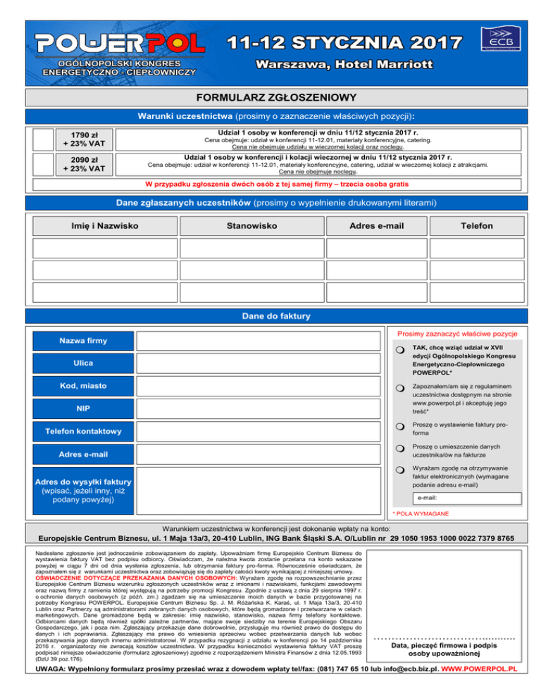 FORMULARZ ZGŁOSZENIOWY Warunki uczestnictwa (prosimy o zaznaczenie właściwych pozycji): Udział 1 osoby w konferencji w dniu 11/12 stycznia 2017 r. 1790 zł + 23% VAT Cena obejmuje: udział w konferencji 11-12.01, materiały konferencyjne, catering. Cena nie obejmuje udziału w wieczornej kolacji oraz noclegu. 2090 zł + 23% VAT Cena obejmuje: udział w konferencji 11-12.01, materiały konferencyjne, catering, udział w wieczornej kolacji z atrakcjami. Cena nie obejmuje noclegu. Udział 1 osoby w konferencji i kolacji wieczornej w dniu 11/12 stycznia 2017 r. W przypadku zgłoszenia dwóch osób z tej samej firmy – trzecia osoba gratis Dane zgłaszanych uczestników (prosimy o wypełnienie drukowanymi literami) Imię i Nazwisko Stanowisko Adres e-mail Telefon Dane do faktury Prosimy zaznaczyć właściwe pozycje Nazwa firmy TAK, chcę wziąć udział w XVII edycji Ogólnopolskiego Kongresu Energetyczno-Ciepłowniczego POWERPOL* Zapoznałem/am się z regulaminem uczestnictwa dostępnym na stronie www.powerpol.pl i akceptuję jego treść* Proszę o wystawienie faktury proforma Proszę o umieszczenie danych uczestnika/ów na fakturze Wyrażam zgodę na otrzymywanie faktur elektronicznych (wymagane podanie adresu e-mail) Ulica Kod, miasto NIP Telefon kontaktowy Adres e-mail Adres do wysyłki faktury (wpisać, jeżeli inny, niż podany powyżej) e-mail: * POLA WYMAGANE Warunkiem uczestnictwa w konferencji jest dokonanie wpłaty na konto: Europejskie Centrum Biznesu, ul. 1 Maja 13a/3, 20-410 Lublin, ING Bank Śląski S.A. O/Lublin nr 29 1050 1953 1000 0022 7379 8765 Nadesłane zgłoszenie jest jednocześnie zobowiązaniem do zapłaty. Upoważniam firmę Europejskie Centrum Biznesu do wystawienia faktury VAT bez podpisu odbiorcy. Oświadczam, że należna kwota zostanie przelana na konto wskazane powyżej w ciągu 7 dni od dnia wysłania zgłoszenia, lub otrzymania faktury pro-forma. Równocześnie oświadczam, że zapoznałem się z warunkami uczestnictwa oraz zobowiązuję się do zapłaty całości kwoty wynikającej z niniejszej umowy. OŚWIADCZENIE DOTYCZĄCE PRZEKAZANIA DANYCH OSOBOWYCH: Wyrażam zgodę na rozpowszechnianie przez Europejskie Centrum Biznesu wizerunku zgłoszonych uczestników wraz z imionami i nazwiskami, funkcjami zawodowymi oraz nazwą firmy z ramienia której występują na potrzeby promocji Kongresu. Zgodnie z ustawą z dnia 29 sierpnia 1997 r. o ochronie danych osobowych (z późń. zm.) zgadzam się na umieszczenie moich danych w bazie przygotowanej na potrzeby Kongresu POWERPOL. Europejskie Centrum Biznesu Sp. J. M. Różańska K. Karaś, ul. 1 Maja 13a/3, 20-410 Lublin oraz Partnerzy są administratorami zebranych danych osobowych, które będą gromadzone i przetwarzane w celach marketingowych. Dane gromadzone będą w zakresie: imię nazwisko, stanowisko, nazwa firmy telefony kontaktowe. Odbiorcami danych będą również spółki zależne partnerów, mające swoje siedziby na terenie Europejskiego Obszaru Gospodarczego, jak i poza nim. Zgłaszający przekazuje dane dobrowolnie, przysługuje mu również prawo do dostępu do danych i ich poprawiania. Zgłaszający ma prawo do wniesienia sprzeciwu wobec przetwarzania danych lub wobec przekazywania jego danych innemu administratorowi. W przypadku rezygnacji z udziału w konferencji po 14 października 2016 r. organizatorzy nie zwracają kosztów uczestnictwa. W przypadku konieczności wystawienia faktury VAT proszę podpisać niniejsze oświadczenie (formularz zgłoszeniowy) zgodnie z rozporządzeniem Ministra Finansów z dnia 12.05.1993 (DzU 39 poz.176). …………………………........... Data, pieczęć firmowa i podpis osoby upoważnionej UWAGA: Wypełniony formularz prosimy przesłać wraz z dowodem wpłaty tel/fax: (081) 747 65 10 lub [email protected]. WWW.POWERPOL.PL