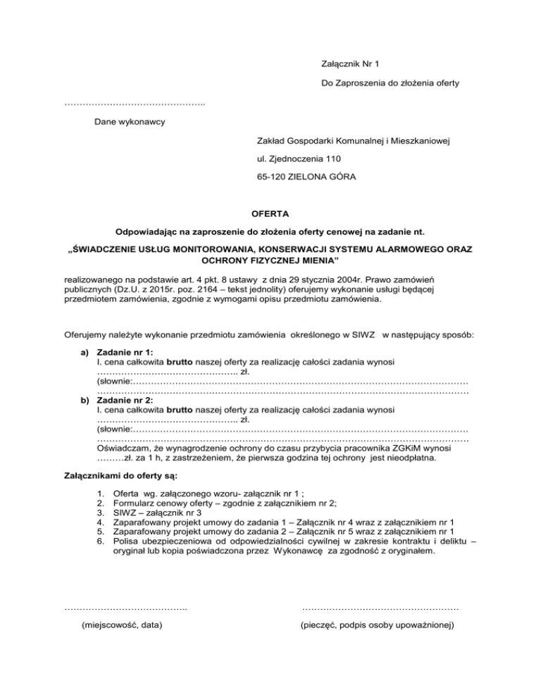 Załącznik Nr 1 Do Zaproszenia do złożenia oferty ……………………………………….. Dane wykonawcy Zakład Gospodarki Komunalnej i Mieszkaniowej ul. Zjednoczenia 110 65-120 ZIELONA GÓRA OFERTA Odpowiadając na zaproszenie do złożenia oferty cenowej na zadanie nt. „ŚWIADCZENIE USŁUG MONITOROWANIA, KONSERWACJI SYSTEMU ALARMOWEGO ORAZ OCHRONY FIZYCZNEJ MIENIA” realizowanego na podstawie art. 4 pkt. 8 ustawy z dnia 29 stycznia 2004r. Prawo zamówień publicznych (Dz.U. z 2015r. poz. 2164 – tekst jednolity) oferujemy wykonanie usługi będącej przedmiotem zamówienia, zgodnie z wymogami opisu przedmiotu zamówienia. Oferujemy należyte wykonanie przedmiotu zamówienia określonego w SIWZ w następujący sposób: a) Zadanie nr 1: I. cena całkowita brutto naszej oferty za realizację całości zadania wynosi ……………………………………….. zł. (słownie:………………………………………………………………………………………………… …………………………………………………………………………………………………………… b) Zadanie nr 2: I. cena całkowita brutto naszej oferty za realizację całości zadania wynosi ……………………………………….. zł. (słownie:………………………………………………………………………………………………… …………………………………………………………………………………………………………… Oświadczam, że wynagrodzenie ochrony do czasu przybycia pracownika ZGKiM wynosi ………zł. za 1 h, z zastrzeżeniem, że pierwsza godzina tej ochrony jest nieodpłatna. Załącznikami do oferty są: 1. 2. 3. 4. 5. 6. Oferta wg. załączonego wzoru- załącznik nr 1 ; Formularz cenowy oferty – zgodnie z załącznikiem nr 2; SIWZ – załącznik nr 3 Zaparafowany projekt umowy do zadania 1 – Załącznik nr 4 wraz z załącznikiem nr 1 Zaparafowany projekt umowy do zadania 2 – Załącznik nr 5 wraz z załącznikiem nr 1 Polisa ubezpieczeniowa od odpowiedzialności cywilnej w zakresie kontraktu i deliktu – oryginał lub kopia poświadczona przez Wykonawcę za zgodność z oryginałem. ………………………………….. (miejscowość, data) ……………………………………………. (pieczęć, podpis osoby upoważnionej)