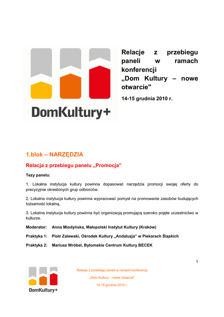 Relacje z przebiegu paneli w ramach konferencji „Dom Kultury – nowe otwarcie" 14-15 grudnia 2010 r. 1.blok – NARZĘDZIA Relacja z przebiegu panelu „Promocja” Tezy panelu: 1. Lokalna instytucja kultury powinna dopasować narzędzia promocji swojej oferty do precyzyjnie określonych grup odbiorców. 2. Lokalna instytucja kultury powinna wypracować pomysł na promowanie zasobów budujących toŜsamość lokalną. 3. Lokalna instytucja kultury powinna być organizacją promującą szeroko pojęte uczestnictwo w kulturze. Moderator: Anna Miodyńska, Małopolski Instytut Kultury (Kraków) Praktyka 1: Piotr Zalewski, Ośrodek Kultury „Andaluzja” w Piekarach Śląskich Praktyka 2: Mariusz Wróbel, Bytomskie Centrum Kultury BECEK 1 Relacje z przebiegu paneli w ramach konferencji „Dom Kultury – nowe otwarcie" 14-15 grudnia 2010 r. RozbieŜność w stosunku do tez pojawiła się juŜ przy prezentacjach: pan Piotr Zalewski z Piekar Śląskich zaakceptował je jako załoŜenia regulujące działania promocyjne ośrodka kultury, Mariusz Wróbel z BECEK-u odniósł się zaś krytycznie, zwłaszcza do tezy pierwszej, podając w wątpliwość sens precyzyjnego wyodrębniania grup odbiorców. Promocja adresowana do konkretnych adresatów (młodzieŜy, seniorów czy regionalistów) nie przekonała teŜ innych uczestników panelu: ich oferta kulturalna jest najczęściej rozumiana jako zaproszenie dla wszystkich. Druga teza została zaakceptowana. Uczestnicy panelu odwołali się do dwóch przykładów dobrze ilustrujących powinność, jaką jest dla instytucji kultury promowanie lokalnego dziedzictwa. Były to dwa duŜe projekty: „Korzenie Siekierek” (DoroŜkarnia, Warszawa) i „Nowohucka Kronika Filmowa” (Ośrodek Kultury im. C.K. Norwida, Kraków). Padło nawet sformułowanie, Ŝe promocja dziedzictwa jest misją lokalnej instytucji kultury: „jeśli my tego nie zrobimy, nie zrobi tego nikt inny”. Na potwierdzenie trzeciej tezy odwoływano się do programów ogólnopolskich, takich jak na przykład Rok Chopinowski, które pomagają wychodzić poza tradycyjne działania lokalne. Jako zaproszenie do udziału w kulturze raczej niŜ do uczestnictwa w konkretnych wydarzeniach realizuje swoja promocję BECEK. Jego komunikaty reklamowe przyciągają ludzi do samej instytucji (prezentując idee, które ją oŜywiają), a dopiero później na wydarzenia z kalendarza imprez. Czas nie pozwolił juŜ niestety na rozwinięcie tego wątku. Anna Miodyńska Relacja z przebiegu panelu „Badania” Tezy panelu: 1. Lokalna instytucja kultury powinna korzystać z róŜnorodnych badań kultury, niekoniecznie musi sama je realizować. 2. Lokalna instytucja kultury powinna inicjować debaty publiczne na temat wyników lokalnych badań społecznych. 3. Lokalna instytucja kultury powinna posiadać kompetencje związane z prowadzaniem badań ewaluacyjnych. Moderator: Piotr Knaś, Małopolski Instytut Kultury (Kraków) Praktyka 1: Łukasz Ostrowski, Uniwersytet Warszawski, Towarzystwo Inicjatyw Twórczych „Ę” (Warszawa), Agata Nowotny, Towarzystwo Inicjatyw Twórczych „Ę” (Warszawa) 2 Relacje z przebiegu paneli w ramach konferencji „Dom Kultury – nowe otwarcie" 14-15 grudnia 2010 r. Praktyka 2: Paweł Machnicki, Zastępca Burmistrza Gminy i Miasta Dobczyce Podczas panelu uczestnicy dyskutowali wyłącznie na temat pierwszej tezy. Początkowe kontrowersje dotyczyły reprezentatywności tego typu badań oraz kwestii budowania przez lokalne samorządy polityk kultury (czy tego typu badania mogą stanowić materiał dla tworzenia analiz wskazujących rekomendacje dla decydentów politycznych). Pierwsza teza, zgodnie z efektami dyskusji, powinna zostać przemodelowana i brzmieć następująco: Lokalne instytucje kultury powinny koniecznie realizować własne badania w formie dopasowanej do własnych potrzeb i kompetencji (te oczywiście naleŜy wzmacniać i rozwijać), w porozumieniu z samorządem lokalnym, który oczekuje od domu kultury partnerskiej współpracy przy wytyczaniu kierunku rozwoju kultury i ewaluacji efektów finansowania obszaru kultury (programu usług publicznych). Dwie pozostałe tezy nie wzbudziły kontrowersji, były rozwinięciem pierwszej, równieŜ w jej nowym brzmieniu. Dla programu Dom Kultury + efekty tej dyskusji mogą być następujące: • naleŜy wzmacniać kompetencje domów kultury w zakresie realizacji badań społecznych, • naleŜy wzmacniać partnerstwo instytucji kultury i samorządów lokalnych w zakresie współpracy dotyczącej badań i rozwoju kultury (domy kultury nie powinny być wyłącznie usługodawcami kulturalnymi z ramienia samorządu, ale równieŜ ośrodkami refleksji, badań, debat, kreującymi nowe polityki kultury). Piotr Knaś Relacja z przebiegu panelu „Internet 2.0” Tezy panelu: 1. Lokalna Instytucja kultury nie musi mieć własnej strony internetowej. 2. Lokalna Instytucja kultury musi istnieć w serwisach społecznościowych. 3. Lokalna Instytucja kultury powinna dać internautom moŜliwość współtworzenia treści serwisu internetowego instytucji. Moderator: Marcin Wójcik, Małopolski Instytut Kultury (Kraków) Praktyka 1: Maciej Twaróg, Muzeum Historyczne Miasta Krakowa, Odział Dom Zwierzyniecki Praktyka 2: Iwona Kargol-Dębicka, Fundacja Forum 3 Relacje z przebiegu paneli w ramach konferencji „Dom Kultury – nowe otwarcie" 14-15 grudnia 2010 r. Uczestnicy panelu jednogłośnie odrzucili pierwszą tezę, stwierdzając, Ŝe własna strona internetowa lokalnej instytucji kultury podnosi jej prestiŜ. Potrzeba posiadania strony internetowej została porównana do potrzeby posiadania i przy stosownych okazjach ubierania garnituru, tak by przez część swoich odbiorców być postrzeganą jako powaŜna instytucja. Przedstawiciele instytucji kultury jednocześnie przyznali, Ŝe dobrą praktyką jest prowadzenie bloga instytucji, który w sytuacjach problemów technicznych oficjalnej strony, moŜe ją zastępować. Druga t