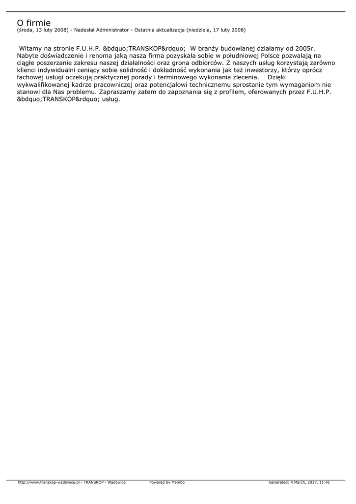 O firmie (środa, 13 luty 2008) - Nadesłał Administrator - Ostatnia aktualizacja (niedziela, 17 luty 2008) Witamy na stronie F.U.H.P. „TRANSKOP” W branży budowlanej działamy od 2005r. Nabyte doświadczenie i renoma jaką nasza firma pozyskała sobie w południowej Polsce pozwalają na ciągłe poszerzanie zakresu naszej działalności oraz grona odbiorców. Z naszych usług korzystają zarówno klienci indywidualni ceniący sobie solidność i dokładność wykonania jak też inwestorzy, którzy oprócz fachowej usługi oczekują praktycznej porady i terminowego wykonania zlecenia. Dzięki wykwalifikowanej kadrze pracowniczej oraz potencjałowi technicznemu sprostanie tym wymaganiom nie stanowi dla Nas problemu. Zapraszamy zatem do zapoznania się z profilem, oferowanych przez F.U.H.P. „TRANSKOP” usług. http://www.transkop-wadowice.pl - TRANSKOP - Wadowice Powered by Mambo Generated: 4 March, 2017, 11:41