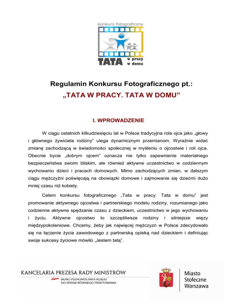 Regulamin Konkursu Fotograficznego pt.: „TATA W PRACY. TATA W DOMU” I. WPROWADZENIE W ciągu ostatnich kilkudziesięciu lat w Polsce tradycyjna rola ojca jako „głowy i głównego Ŝywiciela rodziny” ulega dynamicznym przemianom. Wyraźnie widać zmianę zachodzącą w świadomości społecznej w myśleniu o ojcostwie i roli ojca. Obecnie bycie „dobrym ojcem” oznacza nie tylko zapewnienie materialnego bezpieczeństwa swoim bliskim, ale równieŜ aktywne uczestnictwo w codziennym wychowaniu dzieci i pracach domowych. Mimo zachodzących zmian, w dalszym ciągu męŜczyźni poświęcają na obowiązki domowe i zajmowanie się dziećmi duŜo mniej czasu niŜ kobiety. Celem konkursu fotograficznego „Tata w pracy. Tata w domu” jest promowanie aktywnego ojcostwa i partnerskiego modelu rodziny, rozumianego jako codzienne aktywne spędzanie czasu z dzieckiem, uczestnictwo w jego wychowaniu i Ŝyciu. Aktywne ojcostwo to szczęśliwsze rodziny i silniejsze więzy międzypokoleniowe. Chcemy, Ŝeby jak najwięcej męŜczyzn w Polsce zdecydowało się na łączenie Ŝycia zawodowego z partnerską opieką nad dzieckiem i definiując swoje sukcesy Ŝyciowe mówiło „Jestem tatą”. II. POSTANOWIENIA OGÓLNE 1. Zasady Konkursu określa niniejszy regulamin, który wchodzi w Ŝycie z dniem rozpoczęcia Konkursu i obowiązuje do czasu jego zakończenia. 2. Organizatorem Konkursu jest Biuro Pełnomocnika Rządu do spraw Równego Traktowania i Urząd Miasta Stołecznego Warszawy. 3. Celem Konkursu jest promowanie roli ojca, przekazywanie pozytywnego wizerunku ideału ojcostwa, pogłębienie więzi ojca i dziecka oraz zacieśnianie więzi międzypokoleniowych. 4. Konkurs jest objęty honorowym patronatem ElŜbiety Radziszewskiej, Pełnomocnika Rządu do spraw Równego Traktowania oraz Hanny GronkiewiczWaltz, Prezydent Miasta Stołecznego Warszawy . 5. Konkurs odbywa się w dwóch kategoriach wiekowych: kategoria 1 do lat 15, kategoria 2 od lat 16 do lat 21, 6. Konkurs trwa od 23 czerwca do 30 listopada 2011 roku: nadsyłanie prac do 31 października 2011 roku, ocena jury oraz ogłoszenie wyników Konkursu do 30 listopada 2011 roku, 7. Konkurs jest otwarty dla wszystkich fotografujących z wyłączeniem: pracowników Organizatora Konkursu oraz najbliŜszych tych osób (małŜonkowie oraz w pierwszym stopniu pokrewieństwa lub powinowactwa), osób, które w jakikolwiek sposób brały udział w przygotowaniu i przeprowadzeniu Konkursu oraz najbliŜszych wymienionych osób. 8. Uczestnik niepełnoletni moŜe wziąć udział w konkursie tylko za pisemną zgodą rodzica/opiekuna (Załącznik nr 2 do Regulaminu) III. ZDJĘCIA 9. Tematyka zdjęć powinna nawiązywać do celu Konkursu i przedstawiać tatę podczas wykonywania pracy zawodowej, jak równieŜ aktywnie zajmującego się dzieckiem. 10. KaŜdy uczestnik moŜe zgłosić maksymalnie 3 fotografie wraz z formularzem zgłoszenia zawierającym: imię i nazwisko autora zdjęć, wiek, adres, telefon lub email (załącznik nr 1 do Regulaminu). 11. Fotografie mogą być zarówno w poziomie, jak i w pionie, kolorowe, czarno-białe i w sepii, wydrukowane na papierze fotograficznym w formacie 13x18 cm lub 20x30 cm oraz bezwarunkowo w postaci elektronicznej na podpisanej imieniem i nazwiskiem płycie CD, zapisane lub zeskanowane w rozdzielczości nie mniejszej niŜ 300 dpi, bez obróbki w programach graficznych typu Photoshop, CorelDRAW. Zdjęcia nie powinny być oprawione. 12. Zgłaszane do Konkursu fotografie naleŜy opisać na odwrocie: tytuł Konkursu, tytuł zdjęcia, imię i nazwisko autora zdjęć, symbol kategorii wiekowej, adres, telefon lub e-mail autora zdjęć. 13. Zdjęcia tylko w formie cyfrowej lub tylko w formie papierowej nie wezmą udziału w Konkursie. 14. Z Konkursu wyłącza się prace uprzednio nagradzane lub wystawiane. 15. Termin zgłaszania zdjęć mija 31 października 2011 roku. Za datę zgłoszenia uwaŜa się datę wpłynięcia pracy konkursowej do siedziby Organizatora. 16. Wraz z przekazaniem fotografii naleŜy przekazać podpisany Formularz zgłoszeniowy wraz z oświadczeniem (Załącznik nr 1 do Regulaminu), a osoby niepełnoletnie dołączają oświadczenie - pisemną zgodę rodziców/opiekunów ustawowych na udział w Konkursie (Załącznik nr 2 do Regulaminu). 17. Prace bez stosownych oświadczeń nie wezmą udziału w Konkursie. 18. KaŜdy z uczestników ma prawo do wglądu do swoich danych osobowych oraz ich poprawiania, zgodnie z ustawą o ochronie danych osobowych z dnia 29 sierpnia 1997 r. (Dz. U. z 2002 r. Nr 101, poz. 926 z późn. zm.). 19. Udział w Konkursie jest jednoznaczny z nieodpłatnym udzieleniem prawa do nieodpłatnego wykorzystywania i publikowania prac w następujących polach eksploatacji: druku w dowolnej liczbie publikacji i w dowolnym nakładzie, uŜywania ich w Internecie oraz w innych formach utrwaleń. Przesłane pliki nie będą zwracane. 20. Organizator zastrzega sobie prawo do publikowania fotografii zgłoszonych do Konkursu, umieszczania ich na stronach internetowych, w mediach i wykorzystania ich w innej formie, podając dane autora (imię i nazwisko). 21. Zdjęcia reprezentujące wysoki poziom techniczny i merytoryczny zostaną po zakończeniu Konkursu umieszczone w bazie fotograficznej. Zdjęcia te będą elementem promującym postawy tolerancji i będą wykorzystywane przez Biuro Pełnomocnika Rządu do spraw Równego Traktowania oraz Urząd Miasta Stołecznego Warszawy do celów promocyjnych. TakŜe i w tym przypadku fotografie będą opisane nazwiskami autorów. 22. Zdjęcia wraz z formularzem zgłoszenia naleŜy składać bezpośrednio w Kancelarii Prezesa Rady Ministrów, w biurze podawczym lub przesyłać na adres: Biuro Pełnomocnika Rządu do spraw Równego Traktowania 00-583 Warszawa, Al. Ujazdowskie 1/3 z dopiskiem: Konkurs Fotograficzny „TATA W PRACY. TATA W DOMU” 23. Koszt przesyłki pokrywa uczestnik konkursu. 24. Oceny fotografii oraz przyznania nagród dokona Jury Ko