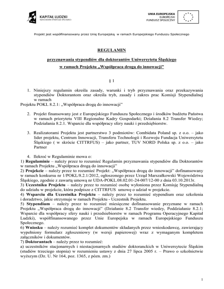 Projekt jest współfinansowany przez Unię Europejską w ramach Europejskiego Funduszu Społecznego REGULAMIN przyznawania stypendiów dla doktorantów Uniwersytetu Śląskiego w ramach Projektu „Współpraca drogą do innowacji” §1 1. Niniejszy regulamin określa zasady, warunki i tryb przyznawania oraz przekazywania stypendiów Doktorantom oraz określa tryb, zasady i zakres prac Komisji Stypendialnej w ramach Projektu POKL 8.2.1: „Współpraca drogą do innowacji” 2. Projekt finansowany jest z Europejskiego Funduszu Społecznego i środków budżetu Państwa w ramach priorytetu VIII Regionalne Kadry Gospodarki; Działania 8.2 Transfer Wiedzy; Podziałania 8.2.1. Wsparcie dla współpracy sfery nauki i przedsiębiorstw. 3. Realizatorami Projektu jest partnerstwo 3 podmiotów: Combidata Poland sp. z o.o. – jako lider projektu, Centrum Innowacji, Transferu Technologii i Rozwoju Fundacja Uniwersytetu Śląskiego ( w skrócie CITTRFUS) – jako partner, TUV NORD Polska sp. z o.o. – jako Partner 4. Ilekroć w Regulaminie mowa o: 1) Regulaminie – należy przez to rozumieć Regulamin przyznawania stypendiów dla Doktorantów w ramach Projektu „Współpraca drogą do innowacji” 2) Projekcie – należy przez to rozumieć Projekt: „Współpraca drogą do innowacji” dofinansowany w ramach konkursu nr 1/POKL/8.2.1/2012, ogłoszonego przez Urząd Marszałkowski Województwa Śląskiego, zgodnie z zawartą umową nr UDA-POKL.08.02.01-24-007/12-00 z dnia 03.10.2013r. 3) Uczestniku Projektu – należy przez to rozumieć osobę wyłoniona przez Komisję Stypendialną do udziału w projekcie, która podpisze z CITTRFUS umowę o udział w projekcie. 4) Wsparciu dla Uczestnika Projektu – należy przez to rozumieć stypendium oraz szkolenia i doradztwo, jakie otrzymuje w ramach Projektu - Uczestnik Projektu. 5) Stypendium – należy przez to rozumieć miesięczne dofinansowanie przyznane w ramach Projektu „Współpraca drogą do innowacji” (Działanie 8.2 Transfer wiedzy, Poddziałanie 8.2.1; Wsparcie dla współpracy sfery nauki i przedsiebiorstw w ramach Programu Operacyjnego Kapitał Ludzki), współfinansowanego przez Unie Europejska w ramach Europejskiego Funduszu Społecznego. 6) Wniosku – należy rozumieć komplet dokumentów składanych przez wnioskodawcę, zawierający wypełniony formularz zgłoszeniowy (w wersji papierowej) wraz z wymaganym kompletem załączników i dokumentów. 7) Doktorantach – należy przez to rozumieć: a) uczestników stacjonarnych i niestacjonarnych studiów doktoranckich w Uniwersytecie Śląskim (studiów trzeciego stopnia) w rozumieniu ustawy z dnia 27 lipca 2005 r. – Prawo o szkolnictwie wyższym (Dz. U. Nr 164, poz. 1365, z pózn. zm.) 1 Projekt jest współfinansowany przez Unię Europejską w ramach Europejskiego Funduszu Społecznego b) inne niż wymienione w pkt. 1 osoby, których przewód doktorski został wszczęty w Uniwersytecie Śląskim zgodnie z przepisami ustawy z dnia 14 marca 2003 r. stopniach naukowych i tytule naukowym oraz o stopniach i tytule w zakresie sztuki (Dz. U. Nr 65, poz. 595, z pózn. zm.) do dnia podjecia uchwały o nadaniu stopnia doktora. 8) Studiach doktoranckich – należy przez to rozumieć studia trzeciego stopnia w rozumieniu ustawy z dnia 27 lipca 2005 r. - Prawo o szkolnictwie wyższym (Dz. U. nr 164, poz. 1365 z pózn. zm.). 9) Promotorze - oznacza osobę w rozumieniu ustawy z dnia 14 marca 2003 r. o stopniach naukowych i tytule naukowym oraz o stopniach i tytule w zakresie sztuki (Dz. U. nr 65, poz. 595 z pózn. zm.). 10) Wnioskodawcy – oznacza osobę (Doktoranta lub Doktorantkę) ubiegającą się o Stypendium, przystępująca do konkursu i składająca wypełniony formularz zgłoszeniowy, wraz z wymaganymi załacznikami. 11) Komisji Stypendialnej – należy przez to rozumieć Komisje, o której mowa w § 7 12) Liście Doktorantów rekomendowanych do otrzymania stypendium – należy przez to rozumieć listę osób, które Komisja Stypendialna wybrała do otrzymywania stypendiów 13) RSI – należy przez to rozumieć „Regionalną Strategię Innowacji Województwa Śląskiego” 14) Biurze Partnera Projektu – należy przez to rozumieć Biuro Partnera Projektu – CITTRFUS mieszczące się w Katowicach, ul. Bankowa 12, Budynek Rektoratu UŚ §2 Uczestnikiem Projektu może zostać każdy Doktorant Uniwersytetu Śląskiego z kierunków matematyczno – przyrodniczych lub technologicznych, którego działalność badawcza wpisuje się w RSI i którego badania mogą mieć praktyczne zastosowanie w przemyśle Województwa Śląskiego, zgodnie z listą kierunków rozwoju technologicznego RSI §3 W ramach Projektu przewiduje się następujące rodzaje wsparcia: a) stypendia motywacyjne dla 15 Uczestników Projektu, w tym 7 kobiet i 8 mężczyzn wypłacane przez 12 miesięcy tj. od stycznia do grudnia 2014 roku b) 60h szkolenie stacjonarne o charakterze praktycznym z zakresu inicjowania transferu wiedzy do gospodarki wg. następującego programu: Zarządzanie, wdrażanie innowacji, zastosowanie metod skutecznej oceny systemu zarządzania działalnością innowacyjną, Tworzenie biznes planów, Zarządzanie projektem, zasobami ludzkimi, ryzykiem, procesami, controling, klastry, Marketing innowacji c) 10h doradztwa indywidualnego z możliwością konsultacji pomysłów i wypracowania strategii wdrożenia, przygotowania planu przedsięwzięć biznesowych d) 16 szkoleń elektronicznych dostępnych na platformie projektu po zalogowaniu e) 2 egzaminy zewnętrzne w zakresie inicjowania transferu wiedzy do gospodarki dające możliwość uzyskania certyfikatu osobowego: specjalista zarządzania innowacjami lub menedżer (decyduje spełnienie wymagań, określonych przez instytucję certyfikującą TNP). §4 O stypendium ubiegać mogą się doktoranci spełniający następujące warunki: 2 Projekt jest współfinansowany przez Unię Europejską w ramach Europejskiego Funduszu Społecznego a) posiada