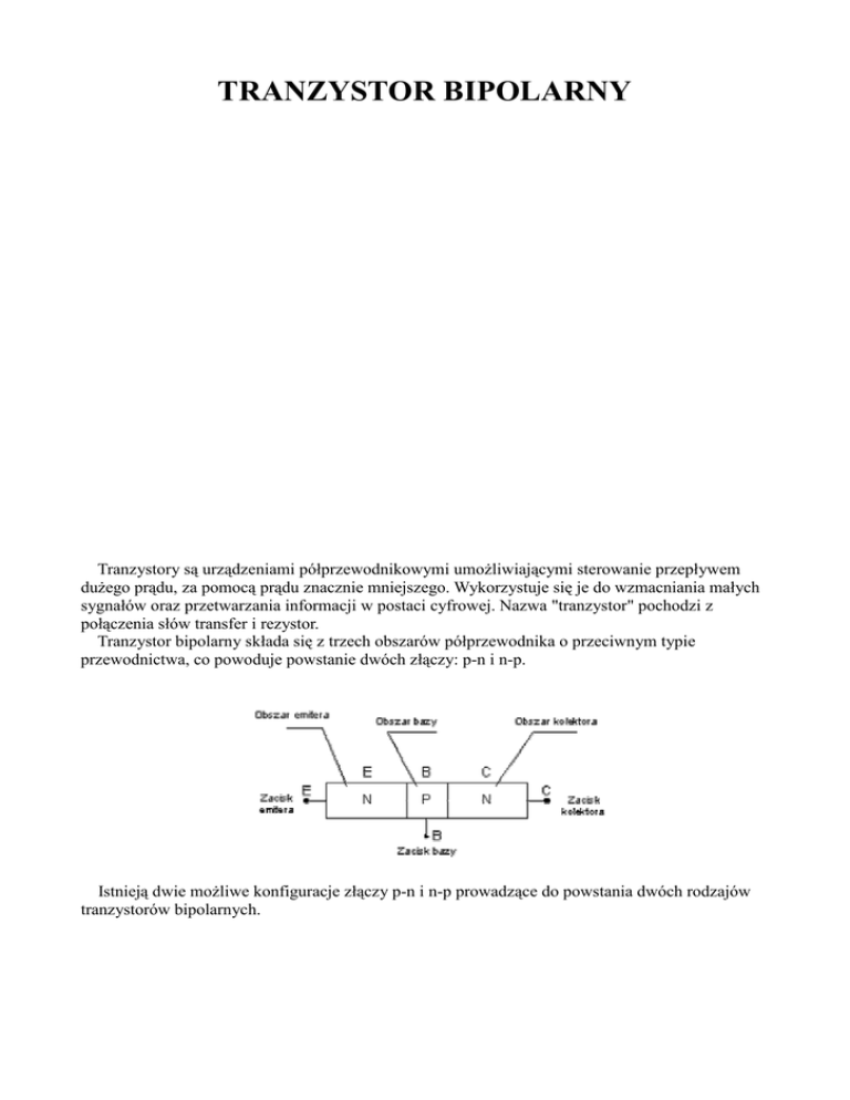 TRANZYSTOR BIPOLARNY Tranzystory są urządzeniami półprzewodnikowymi umożliwiającymi sterowanie przepływem dużego prądu, za pomocą prądu znacznie mniejszego. Wykorzystuje się je do wzmacniania małych sygnałów oraz przetwarzania informacji w postaci cyfrowej. Nazwa "tranzystor" pochodzi z połączenia słów transfer i rezystor. Tranzystor bipolarny składa się z trzech obszarów półprzewodnika o przeciwnym typie przewodnictwa, co powoduje powstanie dwóch złączy: p-n i n-p. Istnieją dwie możliwe konfiguracje złączy p-n i n-p prowadzące do powstania dwóch rodzajów tranzystorów bipolarnych. Symbole graficzne tranzystorów npn i pnp oraz ich diodowe modele zastępcze. Tranzystory, tak zresztą jak inne elementy elektroniczne, mają charakterystyczne dla siebie parametry graniczne, tzn. takie których przekroczenie grozi uszkodzeniem tranzystora. Są to: UEBOmax - dopuszczalne napięcie wsteczne baza-emiter UCBOmax - dopuszczalne napięcie wsteczne kolektor-baza UCEOmax - maksymalne dopuszczalne napięcie kolektor-emiter Icmax - maksymalny prąd kolektora IBmax - maksymalny prąd bazy Pstmax - maksymalna dopuszczalna moc strat Tranzystor jako element trójkońcówkowy, czyli trójnik może być połączony w układzie elektronicznym w rozmaity sposób. W matematycznym opisie tranzystora - trójnika - traktuje się go zwykle jako czwórnik, przyjmując jedną z końcówek jako wspólną dla wejścia i wyjścia. W zależności od tego, którą z końcówek wybieramy za wspólną, rozróżnia się konfiguracje: 1. Układ ze wspólnym emiterem OE (WE) 2. Układ ze wspólną bazą OB. (WB) 3. Układ ze wspólnym kolektorem OC (WC) Literatura 1. "Sztuka elektroniki" P. Horowitz, W. Hill 2. "Układy półprzewodnikowe" U. Tietze, Ch. Schenk 3. "Elementy i układy elektroniczne" pod redakcją Stanisława Kuty 4. "Podstawowe układy elektroniczne" W.Nowakowski