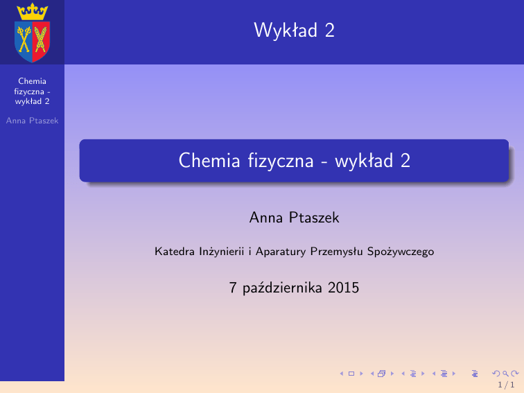 Wykład 2 Chemia fizyczna wykład 2 Anna Ptaszek Chemia fizyczna - wykład 2 Anna Ptaszek Katedra Inżynierii i Aparatury Przemysłu Spożywczego 7 października 2015 1/1 Zjawiska koligatywne Chemia fizyczna wykład 2 Rozpuszczenie w wodzie substancji nielotnej powoduje obniżenie prężności pary nasyconej Anna Ptaszek P woda woda ciek a lód woda + substancja nielotna 1 atm para wodna 0 0 100 T 2/1 Zjawiska koligatywne Chemia fizyczna wykład 2 P woda woda + substancja nielotna 1 atm efekt krioskopowy } } Anna Ptaszek T efekt ebulioskopowy 3/1 Zjawiska koligatywne Chemia fizyczna wykład 2 Anna Ptaszek Zjawiska koligatywne do tej grupy zaliczamy zjawiska będące konsekwencją obniżenia prężności pary czyli: ebulioskopię krioskopię ciśnienie osmotyczne 4/1 Zjawiska koligatywne Chemia fizyczna wykład 2 Anna Ptaszek ∆TW = KE · m KE - to stała ebuliometryczna: KE = R· T02 · M 1000· ∆HW M - masa molowa substancji rozpuszczonej T0 - temperatura wrzenia czystego rozpuszczalnika, ∆HW - molowe ciepło parowania Stała ta podaje podwyższenie temperatury wrzenia dla roztworu 1 molowego i jest charakterystyczna dla rozpuszczalnika. 5/1 Zjawiska koligatywne Chemia fizyczna wykład 2 Anna Ptaszek ∆TK = KK · m KK - to stała kriometryczna: K =− R· T02 · M 1000· ∆HK M - masa molowa substancji rozpuszczonej T0 - temperatura krzepnięcia czystego rozpuszczalnika, ∆HK - molowe ciepło krzepnięcia Stała kriometryczna podaje obniżenie temperatury krzepnięcia dla roztworu 1 molowego i jest charakterystyczna dla rozpuszczalnika. 6/1 Zjawiska koligatywne Chemia fizyczna wykład 2 Anna Ptaszek Ciśnienie osmotyczne Pojęcie to odnosi się do zjawiska osmozy, jakie zachodzi pomiędzy roztworem a czystym rozpuszczalnikiem przy założeniu, że są one oddzielone membraną czyli przegrodą przepuszczalną tylko dla cząsteczek rozpuszczalnika. Dlaczego membrana? Z powodu obecności błony dochodzi do przeciwnego, w stosunku do klasycznej dyfuzji, zachowania cząsteczek. Przepływ rozpuszczalnika zachodzi do momentu wyrównania potencjałów chemicznych zarówno rozpuszczalnika jak i substancji rozpuszczonej po obu stronach przegrody. Objawem zjawiska jest wzrost objętości roztworu, powodujący zmniejszenie stężenia substancji nielotnej. 7/1 Ciśnienie osmotyczne Chemia fizyczna wykład 2 Anna Ptaszek 8/1 Zjawiska koligatywne Chemia fizyczna wykład 2 Anna Ptaszek Osmotyczne równanie stanu to równanie opisujące oddziaływania pomiędzy cząsteczkami substancji rozpuszczonej a rozpuszczalnikiem: π RT = [1 + A2 (T )c + A3 (T )c 2 + ...] c M W równaniu tym A2 (T ) oraz A3 (T ) oznacza drugi i trzeci współczynnik wirialu, c stężenie substancji rozpuszczonej natomiast M masa molowa substancji rozpuszczonej. 9/1 Zjawiska koligatywne Chemia fizyczna wykład 2 Anna Ptaszek Drugi współczynnik wirialu A2 (T ) ujemna wartość wskazuje na niewielkie powinowactwo pomiędzy substancją rozpuszczona a rozpuszczalnikiem. W konsekwencji można zaobserwować zjawiska agregacji/asocjacji lub rekrystalizacji. duże dodatnie wartości tego współczynnika wskazują na bardzo dobrą rozpuszczalność. 10 / 1 Układy gaz-ciecz Chemia fizyczna wykład 2 Anna Ptaszek Rozpuszczalność wybranych gazów w cieczach w 20o C , w g /100g cieczy CIECZ woda etanol benzen H2 0,017 0,08 0,066 N2 0,015 0,130 0,104 O2 0,028 0,143 0,163 CO2 0,88 3 0,153 H2 S 2,68 NH3 710 11 / 1 Układy gaz-ciecz Chemia fizyczna wykład 2 Anna Ptaszek Wpływ temperatury na rozpuszczalność wybranych gazów w wodzie w g /100g cieczy T, o C 0 20 40 60 H2 0,0215 0,0182 0,0164 0,0160 CO2 1,71 0,878 0,530 0,359 H2 S 4,65 2,58 1,66 1,19 12 / 1 Układy gaz-ciecz Chemia fizyczna wykład 2 Anna Ptaszek wpływ temperatury podczas rozpuszczania gazu w cieczy wydziela się energia na sposób ciepła, stąd też zgodnie z regułą przekory: x2 ∆H 1 1 = ·( − ) x1 R T2 T1 x - zawartość gazu w cieczy odpowiednio w dwóch różnych temperaturach 13 / 1 Układy gaz-ciecz Chemia fizyczna wykład 2 Anna Ptaszek Wpływ ciśnienia na rozpuszczalność CO2 w wodzie w mL CO2 w 1g H2 O w przeliczeniu na warunki normalne p, bar 25 30 35 40 45 25o C 16,3 18,2 20 22 24 30o C 10,6 12,1 16 18 60o C 8,5 9,3 14 / 1 Układy gaz-ciecz Chemia fizyczna wykład 2 Anna Ptaszek wpływ ciśnienia - prawo Henry’ego w stałej temperaturze ilość x gazu rozpuszczonego w danej objętości cieczy jest proporcjonalna do jego ciśnienia cząstkowego p nad roztworem: x = He· p He - stała Henry’ego 15 / 1 Układy ciecz-para Chemia fizyczna wykład 2 Anna Ptaszek układy doskonałe i prawo Raoulta jeżeli dwie lub więcej cieczy tworzy roztwór doskonały to ciśnienia cząstkowe oparów (p) tych cieczy są związane ze składem ciekłego roztworu (x) następującą zależnością: p1 = P1o · xA p2 = P2o · xB p3 = P3o · xC Pio ciśnienie pary nasyconej nad czystą cieczą i 16 / 1 Układy ciecz-para Chemia fizyczna wykład 2 Anna Ptaszek składnik kluczowy - składnik lżejszy to ciecz o najniższej temperaturze wrzenia 17 / 1 Układy ciecz-para Chemia fizyczna wykład 2 Anna Ptaszek prawo Daltona całkowita prężność (ciśnienie) par nad mieszaniną jest równa sumie ciśnień cząstkowych składników mieszaniny p = p1 + p2 + p3 oczywiście pi = p· yi y - ułamek molowy oparów danej cieczy w fazie gazowej. 18 / 1 Układy ciecz-para Chemia fizyczna wykład 2 Anna Ptaszek prawo Daltona i Raoulta skutkuje dla układów doskonałych: 19 / 1 Układy ciecz-para Chemia fizyczna wykład 2 Anna Ptaszek prawo Daltona i Raoulta skutkuje dla układów doskonałych: 20 / 1 Układy ciecz-para Chemia fizyczna wykład 2 Anna Ptaszek rzeczywiste czyli niedoskonałe zeotropia to takie mieszaniny, w których występują oddziaływania pomiędzy cząsteczkami cieczy. W efekcie obserwuje się dodatnie lub ujemne odchylenia od prawa Raoulta. ujemne odchylenie dodatnie odchylenie 21 / 1 Układy ciecz-para Chemia fizyczna wykład 2 Anna Ptaszek azeotropia to zjawi