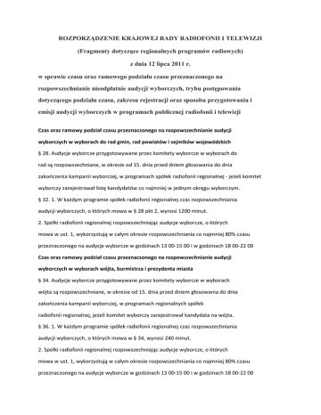 ROZPORZĄDZENIE KRAJOWEJ RADY RADIOFONII I TELEWIZJI (Fragmenty dotyczące regionalnych programów radiowych) z dnia 12 lipca 2011 r. w sprawie czasu oraz ramowego podziału czasu przeznaczonego na rozpowszechnianie nieodpłatnie audycji wyborczych, trybu postępowania dotyczącego podziału czasu, zakresu rejestracji oraz sposobu przygotowania i emisji audycji wyborczych w programach publicznej radiofonii i telewizji Czas oraz ramowy podział czasu przeznaczonego na rozpowszechnianie audycji wyborczych w wyborach do rad gmin, rad powiatów i sejmików wojewódzkich § 28. Audycje wyborcze przygotowywane przez komitety wyborcze w wyborach do rad są rozpowszechniane, w okresie od 15. dnia przed dniem głosowania do dnia zakończenia kampanii wyborczej, w programach spółek radiofonii regionalnej - jeżeli komitet wyborczy zarejestrował listę kandydatów co najmniej w jednym okręgu wyborczym. § 32. 1. W każdym programie spółek radiofonii regionalnej czas rozpowszechniania audycji wyborczych, o których mowa w § 28 pkt 2, wynosi 1200 minut. 2. Spółki radiofonii regionalnej rozpowszechniając audycje wyborcze, o których mowa w ust. 1, wykorzystują w całym okresie rozpowszechniania co najmniej 80% czasu przeznaczonego na audycje wyborcze w godzinach 13 00-15 00 i w godzinach 18 00-22 00 Czas oraz ramowy podział czasu przeznaczonego na rozpowszechnianie audycji wyborczych w wyborach wójta, burmistrza i prezydenta miasta § 34. Audycje wyborcze przygotowywane przez komitety wyborcze w wyborach wójta są rozpowszechniane, w okresie od 15. dnia przed dniem głosowania do dnia zakończenia kampanii wyborczej, w programach regionalnych spółek radiofonii regionalnej, jeżeli komitet wyborczy zarejestrował kandydata na wójta. § 36. 1. W każdym programie spółek radiofonii regionalnej czas rozpowszechniania audycji wyborczych, o których mowa w § 34, wynosi 240 minut. 2. Spółki radiofonii regionalnej rozpowszechniając audycje wyborcze, o których mowa w ust. 1, wykorzystują w całym okresie rozpowszechniania co najmniej 80% czasu przeznaczonego na audycje wyborcze w godzinach 13 00-15 00 i w godzinach 18 00-22 00 Tryb postępowania w sprawach podziału czasu rozpowszechniania audycji wyborczych § 44. Czas rozpowszechniania audycji wyborczych w wyborach do rad w programach: regionalnych - dzieli się między uprawnione komitety wyborcze proporcjonalnie do liczby zarejestrowanych przez nie list kandydatów w okręgach na obszarze objętym programem, na podstawie informacji komisarza wyborczego. § 45. 1. Czas rozpowszechniania audycji wyborczych w wyborach wójta w programach regionalnych dzieli się między uprawnione komitety wyborcze proporcjonalnie do liczby zarejestrowanych przez nie kandydatów na wójtów na obszarze objętym programem, na podstawie informacji gminnej komisji wyborczej. § 46. 1. Informacje, o których mowa w § 40-45, Państwowa Komisja Wyborcza, komisarze wyborczy oraz gminne komisje wyborcze przekazują spółkom radiofonii regionalnej, nie później niż w 24. dniu przed dniem wyborów. 2. Jeżeli okręg wyborczy objęty jest obszarem emisji więcej niż jednego programu regionalnego, komisarz wyborczy lub gminna komisja wyborcza przekazuje informacje, o których mowa w ust. 1, wszystkim oddziałom Telewizji Polskiej i spółkom radiofonii regionalnej obejmującym obszarem emisji ten okręg wyborczy. § 47. 1. Przydział czasu antenowego na rozpowszechnianie audycji wyborczych przez komitet wyborczy jest dokonywany na podstawie złożonego przez pełnomocnika wniosku o przydział nieodpłatnego czasu antenowego. 2. Wniosek, o którym mowa w ust. 1, pełnomocnik obowiązany jest złożyć Telewizji Polskiej, Polskiemu Radiu oraz spółkom radiofonii i telewizji nie później niż w 22. dniu przed dniem wyborów, z wyjątkiem wniosku na rozpowszechnianie audycji wyborczych w związku z zarejestrowaniem kandydatów na wójtów lub kandydatów do rad, który pełnomocnik obowiązany jest złożyć nie później niż w 20. dniu przed dniem wyborów. 3. Wniosek, o którym mowa w ust. 1, powinien zawierać: 1) nazwę komitetu wyborczego uprawnionego do rozpowszechniania audycji wyborczych; 2) imię i nazwisko oraz adres zamieszkania pełnomocnika; 3) kopie protokołów rejestracji kandydatów. § 48. W przypadku niezłożenia przez pełnomocnika wniosku w terminie, o którym mowa w § 47 ust. 2, lub złożenia wniosku niespełniającego wymogów określonych w § 47 ust. 3, podziału czasu antenowego przeznaczonego na rozpowszechnianie audycji wyborczych dokonuje się pomiędzy komitety wyborcze, których pełnomocnicy złożyli wnioski. § 49. 1. Na potrzeby rozpowszechniania audycji wyborczych ustala się: obszary emitowania programów regionalnych poszczególnych spółek radiofonii regionalnej, określone w załączniku nr 2 do rozporządzenia. 2. Jeżeli obszary emitowania, o których mowa w ust. 1, obejmują więcej niż jeden program regionalny Telewizji Polskiej lub spółki radiofonii regionalnej, pełnomocnik, składając wniosek o przydział nieodpłatnego czasu antenowego do jednego z oddziałów regionalnych Telewizji Polskiej lub spółki radiofonii regionalnej, decyduje, w którym z nich będą rozpowszechniane audycje wyborcze. 3. Informacja, o której mowa w ust. 2, przekazywana jest przez wskazany oddział regionalny Telewizji Polskiej lub spółkę radiofonii regionalnej do pozostałych oddziałów regionalnych Telewizji Polskiej lub spółek radiofonii regionalnej objętych obszarem emitowania. 4. Przewodniczący Krajowej Rady Radiofonii i Telewizji na wniosek pełnomocnika zainteresowanego komitetu wyborczego, złożony nie później niż w 24. dniu przed dniem wyborów, dotyczący rozpowszechniania audycji w okręgach wyborczych położonych na granicy obszarów określonych w załącznikach, o których mowa w ust. 1, może zezwolić na rozpowszechnianie audycji wyborczych z obszaru sąsiedniego, jeżeli jest to uzasadnione lepsz