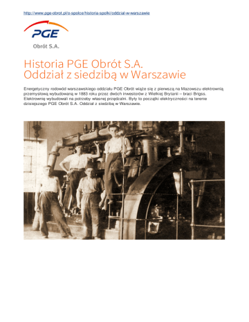 http://www.pge-obrot.pl/o-spolce/historia-spolki/oddzial-w-warszawie Historia PGE Obrót S.A. Oddział z siedzibą w Warszawie Energetyczny rodowód warszawskiego oddziału PGE Obrót wiąże się z pierwszą na Mazowszu elektrownią przemysłową wybudowaną w 1883 roku przez dwóch inwestorów z Wielkiej Brytanii – braci Brigss. Elektrownię wybudowali na potrzeby własnej przędzalni. Były to początki elektryczności na terenie dzisiejszego PGE Obrót S.A. Oddział z siedzibą w Warszawie. Prawie 130 lat temu po raz pierwszy na terenie oddziału zastosowano oświetlenie elektryczne. Do I wojny światowej przędzalnia w Markach dysponowała jedną z najnowocześniejszych w kraju elektrowni o mocy 1565 kW wytwarzającej prąd trójfazowy o napięciu 220V i 500V. Na początku XX wieku na terenie Mazowsza działało już wiele małych elektrowni przemysłowych, a także elektrownie użyteczności publicznej, które służyły szerszym celom, np. do oświetlania prywatnych domów. W latach dwudziestych XX wieku na terenie warszawskiego oddziału PGE Obrót S.A. pracowały już 33 elektrownie. ( zdjęcie nr 10- elektrownia Otwock 1929 rok.) W 1936 roku powołano Zakład Energetyczny Okręgu Podstołecznego (ZEOP), który w 1938 roku otrzymał uprawnienia na dostarczanie energii na terenie powiatów: warszawskiego, radzymińskiego, pułtuskiego, płońskiego i garwolińskiego. Lata 30 poprzedniego stulecia to początki elektryfikacji, po których nadszedł czas wojny i okupacji, a po nim okres odbudowy.W czasie II wojny światowej uległo zniszczeniu około 70% sieci elektroenergetycznej. Energetycy czynnie zaangażowali się w akcje sabotażowe i dywersyjne, poświęcając życie w walce z okupantem. Po wojnie przystąpiono do odbudowy sieci. Pod koniec 1944 roku powołano Zakłady Energetyczne Okręgu Warszawskiego. Już rok później na Mazowszu odbudowano ze zniszczeń wojennych, a następnie uruchomiono pierwsze elektrownie. Po kilku latach intensywnej odbudowy sieci energetycznej, 1 stycznia 1953 roku Minister Energetyki powołał Zakład Sieci Elektrycznych Warszawa-Teren, który pięć lat później zmienił nazwę na Zakład Energetyczny Warszawa-Teren. Jego działalność to przesył, rozdział i sprzedaż energii elektrycznej. Dynamiczny rozwój Mazowsza to dynamiczny rozwój sieci elektroenergetycznej i zwiększenie liczby odbiorców. Wraz z powstawaniem nowoczesnych urządzeń elektrycznych wzrastało zapotrzebowanie na energię elektryczną. (zdjęcie nr 3 - Generator 1946 rok.) 12 lipca 1993 roku podpisano akt notarialny przekształcenia przedsiębiorstwa państwowego w jednoosobową Spółkę Skarbu Państwa. Spółkę zarejestrowano w dniu 31 sierpnia 1993 r. w rejestrze handlowym pod nr RHB 37870 w Sądzie Gospodarczym dla m. st. Warszawy pod nazwą Zakład Energetyczny Warszawa-Teren, Spółka Akcyjna. Od 1 lipca 2007 roku, w związku z uwolnieniem rynku energii, na podstawie przepisów ustawy Prawo energetyczne rozdzielona została prawnie i organizacyjnie działalność obrotowa i dystrybucyjna. Działalność w zakresie dystrybucji i dostawy energii elektrycznej kontynuowana była przez ZEW-T Dystrybucja Sp. z o.o. Obrót energią elektryczną i jej wytwarzanie pozostały w gestii PGE Zakładu Energetycznego Warszawa - Teren S.A. W dniu 31 sierpnia 2010 roku nastąpiła rejestracja w KRS połączenia w trybie art. 492 par. 1 pkt 1 Kodeksu Spółek Handlowych, 8 Spółek z Obszaru Sprzedaży Detalicznej GK PGE. Z dniem 1 września 2010 roku Spółka PGE Zakład Energetyczny Warszawa - Teren S.A. przestała istnieć jako samodzielny podmiot prawa i stała się ważnym ogniwem nowej Spółki PGE Obrót S.A. z siedzibą w Rzeszowie. W strukturze PGE Obrót S.A. dotychczasowa Spółka PGE Zakład Energetyczny Warszawa - Teren S.A. uzyskała status Oddziału, w pełnym brzmieniu - PGE Obrót S.A. Oddział z siedzibą w Warszawie.