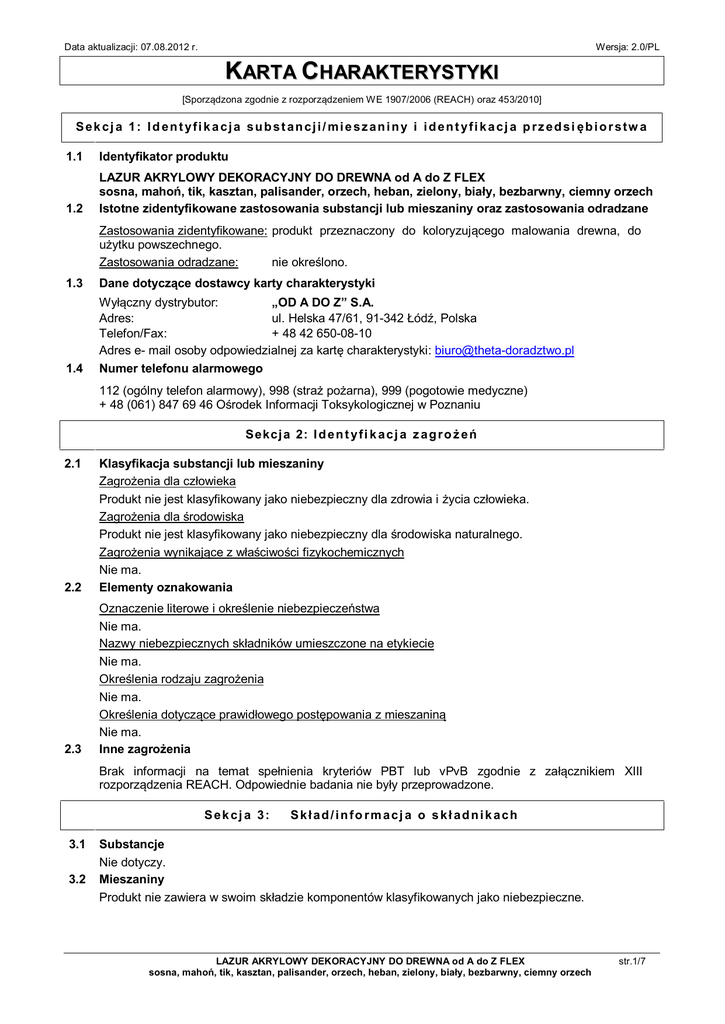 Data aktualizacji: 07.08.2012 r. Wersja: 2.0/PL KARTA CHARAKTERYSTYKI [Sporządzona zgodnie z rozporządzeniem WE 1907/2006 (REACH) oraz 453/2010] Sekcj a 1: Id entyfikacja substancji/ mieszaniny i identyfi kacj a przedsi ębiorstw a 1.1 Identyfikator produktu 1.2 LAZUR AKRYLOWY DEKORACYJNY DO DREWNA od A do Z FLEX sosna, mahoń, tik, kasztan, palisander, orzech, heban, zielony, biały, bezbarwny, ciemny orzech Istotne zidentyfikowane zastosowania substancji lub mieszaniny oraz zastosowania odradzane Zastosowania zidentyfikowane: produkt przeznaczony do koloryzującego malowania drewna, do użytku powszechnego. Zastosowania odradzane: nie określono. 1.3 Dane dotyczące dostawcy karty charakterystyki 1.4 Wyłączny dystrybutor: „OD A DO Z” S.A. Adres: ul. Helska 47/61, 91-342 Łódź, Polska Telefon/Fax: + 48 42 650-08-10 Adres e- mail osoby odpowiedzialnej za kartę charakterystyki: [email protected] Numer telefonu alarmowego 112 (ogólny telefon alarmowy), 998 (straż pożarna), 999 (pogotowie medyczne) + 48 (061) 847 69 46 Ośrodek Informacji Toksykologicznej w Poznaniu Sekcj a 2: I d e n t y f i k a c j a z a g r o ż e ń 2.1 2.2 Klasyfikacja substancji lub mieszaniny Zagrożenia dla człowieka Produkt nie jest klasyfikowany jako niebezpieczny dla zdrowia i życia człowieka. Zagrożenia dla środowiska Produkt nie jest klasyfikowany jako niebezpieczny dla środowiska naturalnego. Zagrożenia wynikające z właściwości fizykochemicznych Nie ma. Elementy oznakowania 2.3 Oznaczenie literowe i określenie niebezpieczeństwa Nie ma. Nazwy niebezpiecznych składników umieszczone na etykiecie Nie ma. Określenia rodzaju zagrożenia Nie ma. Określenia dotyczące prawidłowego postępowania z mieszaniną Nie ma. Inne zagrożenia Brak informacji na temat spełnienia kryteriów PBT lub vPvB zgodnie z załącznikiem XIII rozporządzenia REACH. Odpowiednie badania nie były przeprowadzone. Sekcj a 3: 3.1 3.2 Skład/info rmacj a o skł adnikach Substancje Nie dotyczy. Mieszaniny Produkt nie zawiera w swoim składzie komponentów klasyfikowanych jako niebezpieczne. LAZUR AKRYLOWY DEKORACYJNY DO DREWNA od A do Z FLEX sosna, mahoń, tik, kasztan, palisander, orzech, heban, zielony, biały, bezbarwny, ciemny orzech str.1/7 Data aktualizacji: 07.08.2012 r. Wersja: 2.0/PL KARTA CHARAKTERYSTYKI Sekcj a 4: 4.1 4.2 4.3 Środki pi erw szej po mocy Opis środków pierwszej pomocy W kontakcie ze skórą: przepłukać zanieczyszczoną skórę dużą ilością wody z mydłem. Nie używać rozpuszczalników lub rozcieńczalników. W przypadku wystąpienia podrażnienia skonsultować się z lekarzem. W kontakcie z oczami: skonsultować się z lekarzem w przypadku wystąpienia niepokojących objawów. Chronić niepodrażnione oko, wyjąć szkła kontaktowe. Zanieczyszczone oczy przepłukiwać dokładnie wodą przez kilka minut. Unikać silnego strumienia wody - ryzyko uszkodzenia rogówki. W przypadku spożycia: nie prowokować wymiotów. Wypłukać usta wodą. Nie podawać nic do ust osobie nieprzytomnej. W przypadkach wątpliwych wezwać lekarza. Po narażeniu drogą oddechową: skonsultować się z lekarzem w razie wystąpienia niepokojących dolegliwości. Wyprowadzić poszkodowanego na świeże powietrze, zapewnić ciepło i spokój. Najważniejsze ostre i opóźnione objawy oraz skutki narażenia W kontakcie z oczami: podczas bezpośredniego kontaktu z produktem może powodować zaczerwienienie oczu, ból, łzawienie. W kontakcie ze skórą: może powodować zaczerwienienie u osób szczególnie wrażliwych. Po połknięciu: przypadkowe spożycie może powodować podrażnienie przewodu pokarmowego; bóle brzucha, nudności, biegunkę, wymioty. Po wdychaniu: może powodować podrażnienie dróg oddechowych; efekty narażenia mogą wystąpić po pewnym czasie. Wskazania dotyczące wszelkiej natychmiastowej pomocy lekarskiej i szczególnego postępowania z poszkodowanym Decyzję o sposobie postępowania ratunkowego podejmuje lekarz po dokładnej ocenie stanu poszkodowanego. Leczyć objawowo. Sekcja 5: 5.1 5.2 5.3 Post ępowanie w przyp adku poż aru Środki gaśnicze Odpowiednie środki gaśnicze: wybór środka gaśniczego uzależnić od materiałów gromadzonych w najbliższym sąsiedztwie. Niewłaściwe środki gaśnicze: zwarty strumień wody – niebezpieczeństwo rozprzestrzenienia pożaru. Szczególne zagrożenia związane z substancją lub mieszaniną W czasie pożaru może dojść do uwolnienie niebezpiecznych gazów zawierających m.in. tlenki węgla. Unikać wdychania produktów spalania, mogą stwarzać zagrożenie dla zdrowia. Informacje dla straży pożarnej Środki ochrony ogólnej typowe w przypadku pożaru. Nie należy przebywać w zagrożonej ogniem strefie bez odpowiedniego ubrania odpornego na chemikalia i aparatu do oddychania z niezależnym obiegiem powietrza. Zbiorniki narażone na działanie ognia lub wysokiej temperatury chłodzić rozpylonym strumieniem wody z bezpiecznej odległości. Produkt nie jest palny. Sekcj a 6: P o s t ę p o w a n i e w p r z y p a d k u n i e z a m i e r z o n e g o u w o l n i e n i a d o ś r o d o w i s k a 6.1 6.2 Indywidualne środki ostrożności, wyposażenie ochronne i procedury w sytuacjach awaryjnych Ograniczyć dostęp osób postronnych do obszaru awarii do czasu zakończenia odpowiednich operacji oczyszczania. Należy dopilnować, aby usuwanie awarii i jej skutków przeprowadzał wyłącznie przeszkolony personel. W przypadku dużych wycieków odizolować zagrożony obszar. Unikać kontaktu z oczami i skórą. Nie wdychać par produktu. Zapewnić odpowiednią wentylację. Środki ostrożności w zakresie ochrony środowiska W przypadku uwolnienia większych ilości produktu należy poczynić kroki w celu niedopuszczenia do rozprzestrzenienia się w środowisku naturalnym. Zabezpieczyć studzienki ściekowe; nie dopuścić do przedostania się do nich substancji. Powiadomić odpowiednie służby ratownicze. LAZUR AKRYLOWY DEKORACYJNY DO D