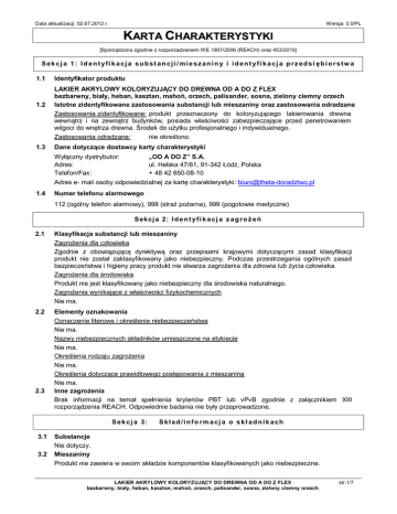 Data aktualizacji: 02.07.2012 r. Wersja: 3.0/PL KARTA CHARAKTERYSTYKI [Sporządzona zgodnie z rozporządzeniem WE 1907/2006 (REACH) oraz 453/2010] Sekcj a 1: Id entyfikacja substancji/ mieszaniny i identyfi kacj a przedsi ębiorstw a 1.1 1.2 1.3 Identyfikator produktu LAKIER AKRYLOWY KOLORYZUJĄCY DO DREWNA OD A DO Z FLEX bezbarwny, biały, heban, kasztan, mahoń, orzech, palisander, sosna, zielony ciemny orzech Istotne zidentyfikowane zastosowania substancji lub mieszaniny oraz zastosowania odradzane Zastosowania zidentyfikowane: produkt przeznaczony do koloryzującego lakierowania drewna wewnątrz i na zewnątrz budynków, posiada właściwości zabezpieczające przed penetrowaniem wilgoci do wnętrza drewna. Środek do użytku profesjonalnego i indywidualnego. Zastosowania odradzane: nie określono. Dane dotyczące dostawcy karty charakterystyki Wyłączny dystrybutor: Adres: Telefon/Fax: „OD A DO Z” S.A. ul. Helska 47/61, 91-342 Łódź, Polska + 48 42 650-08-10 Adres e- mail osoby odpowiedzialnej za kartę charakterystyki: [email protected] 1.4 Numer telefonu alarmowego 112 (ogólny telefon alarmowy), 998 (straż pożarna), 999 (pogotowie medyczne) Sekcj a 2: I d e n t y f i k a c j a z a g r o ż e ń 2.1 Klasyfikacja substancji lub mieszaniny Zagrożenia dla człowieka Zgodnie z obowiązującą dyrektywą oraz przepisami krajowymi dotyczącymi zasad klasyfikacji produkt nie został zaklasyfikowany jako niebezpieczny. Podczas przestrzegania ogólnych zasad bezpieczeństwa i higieny pracy produkt nie stwarza zagrożenia dla zdrowia lub życia człowieka. Zagrożenia dla środowiska Produkt nie jest klasyfikowany jako niebezpieczny dla środowiska naturalnego. Zagrożenia wynikające z właściwości fizykochemicznych Nie ma. 2.2 Elementy oznakowania Oznaczenie literowe i określenie niebezpieczeństwa Nie ma. Nazwy niebezpiecznych składników umieszczone na etykiecie Nie ma. Określenia rodzaju zagrożenia Nie ma. Określenia dotyczące prawidłowego postępowania z mieszaniną Nie ma. Inne zagrożenia Brak informacji na temat spełnienia kryteriów PBT lub vPvB zgodnie z załącznikiem XIII rozporządzenia REACH. Odpowiednie badania nie były przeprowadzone. 2.3 Sekcj a 3: 3.1 3.2 Skład/info rmacj a o skł adnikach Substancje Nie dotyczy. Mieszaniny Produkt nie zawiera w swoim składzie komponentów klasyfikowanych jako niebezpieczne. LAKIER AKRYLOWY KOLORYZUJĄCY DO DREWNA OD A DO Z FLEX bezbarwny, biały, heban, kasztan, mahoń, orzech, palisander, sosna, zielony ciemny orzech str.1/7 Data aktualizacji: 02.07.2012 r. Wersja: 3.0/PL KARTA CHARAKTERYSTYKI Sekcj a 4: 4.1 4.2 4.3 Środki pi erw szej po mocy Opis środków pierwszej pomocy W kontakcie ze skórą: przepłukać zanieczyszczoną skórę dużą ilością wody. Nie stosować rozpuszczalników ani rozcieńczalników. W przypadku wystąpienia podrażnienia skonsultować się z lekarzem. W kontakcie z oczami: skonsultować się z lekarzem w przypadku wystąpienia niepokojących objawów. Chronić niepodrażnione oko, wyjąć szkła kontaktowe. Zanieczyszczone oczy przepłukiwać dokładnie wodą przez kilka minut. Unikać silnego strumienia wody - ryzyko uszkodzenia rogówki. W przypadku spożycia: nie prowokować wymiotów. Wypłukać usta wodą. Nie podawać nic do ust osobie nieprzytomnej. W przypadkach wątpliwych wezwać lekarza, pokazać opakowanie lub etykietę. Po narażeniu drogą oddechową: skonsultować się z lekarzem w razie wystąpienia niepokojących dolegliwości. Wyprowadzić poszkodowanego na świeże powietrze, zapewnić ciepło i spokój. Najważniejsze ostre i opóźnione objawy oraz skutki narażenia W kontakcie z oczami – podczas bezpośredniego kontaktu z produktem może powodować zaczerwienienie oczu, ból, łzawienie, W kontakcie ze skórą – może powodować zaczerwienienie u osób szczególnie wrażliwych. Po połknięciu – przypadkowe spożycie może powodować podrażnienie przewodu pokarmowego; bóle brzucha, nudności, biegunkę, wymioty. Po wdychaniu – może powodować podrażnienie dróg oddechowych. Efekty podrażnienia mogą wystąpić po pewnym czasie. Wskazania dotyczące wszelkiej natychmiastowej pomocy lekarskiej i szczególnego postępowania z poszkodowanym Decyzję o sposobie postępowania ratunkowego podejmuje lekarz po dokładnej ocenie stanu poszkodowanego. Leczyć objawowo. Sekcja 5: Post ępowanie w przyp adku poż aru 5.1 Środki gaśnicze Odpowiednie środki gaśnicze: wybór środka gaśniczego uzależnić od materiałów gromadzonych w najbliższym sąsiedztwie. Niewłaściwe środki gaśnicze: zwarty strumień wody – niebezpieczeństwo rozprzestrzenienia pożaru. 5.2 Szczególne zagrożenia związane z substancją lub mieszaniną W czasie pożaru może dojść do uwolnienie niebezpiecznych gazów zawierających m.in. tlenki węgla i tlenki azotu. Unikać wdychania produktów spalania, mogą stwarzać zagrożenie dla zdrowia. 5.3 Informacje dla straży pożarnej Produkt nie jest palny. Środki ochrony ogólnej typowe w przypadku pożaru. Nie należy przebywać w zagrożonej ogniem strefie bez odpowiedniego ubrania odpornego na chemikalia i aparatu do oddychania z niezależnym obiegiem powietrza. Zbiorniki narażone na działanie ognia lub wysokiej temperatury chłodzić wodą z bezpiecznej odległości. Sekcj a 6: P o s t ę p o w a n i e w p r z y p a d k u n i e z a m i e r z o n e g o u w o l n i e n i a d o ś r o d o w i s k a 6.1 6.2 Indywidualne środki ostrożności, wyposażenie ochronne i procedury w sytuacjach awaryjnych Ograniczyć dostęp osób postronnych do obszaru awarii do czasu zakończenia odpowiednich operacji oczyszczania. Należy dopilnować, aby usuwanie awarii i jej skutków przeprowadzał wyłącznie przeszkolony personel. W przypadku dużych wycieków odizolować zagrożony obszar. Unikać kontaktu z oczami i skórą. Nie wdychać par produktu. Zapewnić odpowiednią wentylację. Środki ostrożności w zakresie ochrony środowiska 