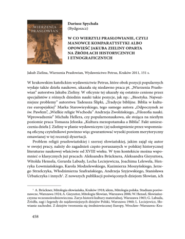 Studia Europaea Gnesnensia 6/2012 · recenzje Dariusz Spychała (Bydgoszcz) W co wierzyli Prasłowianie, czyli manowce komparatystyki albo opowieść Jakuba Zieliny oparta na źródłach historycznych i etnograficznych Jakub Zielina, Wierzenia Prasłowian, Wydawnictwo Petrus, Kraków 2011, 151 s. W krakowskim katolickim wydawnictwie Petrus, które obok pozycji popularnych wydaje także dzieła naukowe, ukazała się niedawno praca pt. „Wierzenia Prasłowian” autorstwa Jakuba Zieliny. W oficynie tej ukazały się ostatnio cenione przez specjalistów z różnych dziedzin nauki takie pozycje, jak np.: „Bioetyka. Najważniejsze problemy” autorstwa Tadeusza Ślipki, „Tradycje biblijne. Biblia w kulturze europejskiej” Marka Starowieyskiego, tego samego autora „Odpoczynek ze św. Pawłem”, „Wielkie religie Wschodu” Andrzeja Zwolińskiego, „Filozofia nauki. Wprowadzenie” Michała Hellera, czy popularnonaukowa, ale stojąca na niezłym poziomie praca Tomasza Jelonka „Kultura mezopotamska a Biblia”. Fakt umieszczenia dzieła J. Zieliny w planie wydawniczym i jej udostępnienie przez wspomnianą oficynę czytelnikowi powinno więc gwarantować wysoki poziom merytoryczny omawianej w tej recenzji dysertacji. Problem religii prasłowiańskiej i szerzej słowiańskiej, jakim zajął się autor w swojej pracy, należy do zagadnień często poruszanych w polskiej historycznej literaturze naukowej właściwie od XVIII wieku. W tym kontekście można wspomnieć o klasycznych już pracach: Aleksandra Brücknera, Aleksandra Gieysztora, Witolda Hensela, Gerarda Labudy, Lecha Leciejewicza, Joachima Lelewela, Henryka Łowmiańskiego, Karola Modzelewskiego, Kazimierza Moszyńskiego, Jerzego Strzelczyka, Włodzimierza Szafrańskiego, Andrzeja Szyjewskiego, Stanisława Urbańczyka i innych1. Z nowszych publikacji poświęconych dziejom Słowian, ich 1 A. Brückner, Mitologia słowiańska, Kraków 1918; idem, Mitologia polska. Studium porównawcze, Warszawa 1924; A. Gieysztor, Mitologia Słowian, Warszawa 2006; W. Hensel, Słowiańszczyzna wczesnośredniowieczna. Zarys historii kultury materialnej, Warszawa 1965; G. Labuda, Źródła, sagi i legendy do najdawniejszych dziejów Polski, Warszawa 1960; L. Leciejewicz, Słowianie zachodni. Z dziejów tworzenia się średniowiecznej Europy, Wrocław–Warszawa–Kra- 458 Dariusz Spychała, W co wierzyli Prasłowianie kulturze i religii można wspomnieć dzieła Artura Błażejewskiego, Władysława Duczko i Witolda Chrzanowskiego2. Praca opiera się na dość licznych źródłach. We wstępie autor wspomina o Prokopiuszu z Cezarei, o podróżnikach arabskich: Ibn Rostehu i al-Gardelim, o kronikarzach niemieckich Ebbonie, Helmoldzie, Widukindzie, Herbordzie, Thietmarze, Adamie z Bremy, Brunonie z Kwerfurtu i Saksie Gramatyku. Podaje tytuły dzieł latopisów ruskich i prace kronikarzy polskich i czeskich: Galla Anonima, Wincentego Kadłubka, Kosmasa, Jana Długosza, Marcina z Urzędowa, Macieja z Miechowa, Michała z Janowa, Marcina Bielskiego, Kallimacha itd. Zadziwia jednak fakt, że żadna z tych pozycji nie znalazła się w bibliografii umieszczonej na końcu książki. I tak gorszy los spotkał Homera, Kronikę Wielkopolską, Rygwedę i Macieja Stryjkowskiego, o których wzmianki znalazły się tylko w tekście głównym pracy i w przypisach. Pecha miał natomiast Joannes Malala, historyk bizantyński, który był godny jedynie wspomnienia w tekście podstawowym na s. 15, gdzie zresztą przedstawiono go jako syryjskiego uczonego3. Jego brak w przypisach może wiązać się z faktem, że autor cytuje go nie bezpośrednio, jak tego wymaga warsztat historyka, ale za pośrednictwem pracy Stanisława Urbańczyka, zatytułowanej „Religia pogańskich Słowian”4. Podobnie potraktował czeskiego kronikarza Kosmasa, który jest na s. 72 cytowany za Andrzejem Kempińskim5. Także Mahabharata występuje tylko w tekście podstawowym, np. na s. 78. Nie ma dzieł: Alfreda, Al Masudiego, Herodota, Jana z Efezu, Jordanesa, Konstantyna Porfyrogenety, Liwiusza, Pawła Diakona, Pliniusza, Pomponiusza Meli, Priskosa z Panion, Ptolemeusza, Tacyta, ków 1989; J. Lelewel, Bałwochwalstwo słowiańskie, Poznań 1853; idem, Cześć bałwochwalcza Słowian i Polski, Poznań 1857; H. Łowmiański, Religia Słowian i jej upadek, Warszawa 1979; idem, Początki Polski, I–VI, Warszawa 1963–1985; K. Modzelewski, Barbarzyńska Europa, Warszawa 2004; K. Moszyński, Kultura ludowa Słowian, 2.1, Warszawa 1967, szczególnie przydatne są strony 233–715 poświęcone życiu religijnemu Słowian; J. Strzelczyk, Mity, podania i wierzenia dawnych Słowian, Poznań 1998; idem, Od Prasłowian do Polaków, Kraków 1987; W. Szafrański, Pradzieje religii w Polsce, Warszawa 1979; A. Szyjewski, Religia Słowian, Kraków 2004; S. Urbańczyk, Religia pogańskich Słowian, Kraków 1947. 2 A. Błażejewski, Starożytni Słowianie, Wrocław–Warszawa–Kraków 2007; W. Duczko, Ruś Wikingów. Historia obecności Skandynawów we wczesnośredniowiecznej Europie Wschodniej, tłum. N. Kreczmar, Warszawa 2007; W. Chrzanowski, Kronika Słowian, 1–3, Kraków 2008– –2009. 3 H. Cichocka, J. Malalas, [w:] O. Jurewicz (red.), Encyklopedia kultury bizantyńskiej, Warszawa 2002, s. 322–323. 4 S. Urbańczyk, Religia, s. 29. 5 A. Kempiński, Encyklopedia mitologii ludów indoeuropejskich, Warszawa 2001, s. 292. 459 Studia Europaea Gnesnensia 6/2012 · recenzje Teofylakta, Zonorasa i wielu innych. Autor nie zauważył także opublikowanej przez G. Labudę w 1961 roku pracy „Źródła skandynawskie i anglosaskie do dziejów Słowiańszczyzny” oraz wydanej przez tego samego autora w 1999 r. antologii tekstów źródłowych zatytułowanej „Słowiańszczyzna starożytna i wczesnośredniowieczna”. Jako historyk w swojej recenzji zajmę się przede wszystkim interesującą mnie historyczną stroną omawianej publikacji. Jak się wydaje, podstawowym założeniem J. Zieliny, które stara