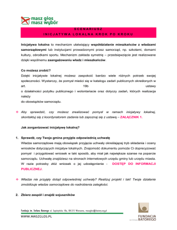 SCENARIUSZ INICJATYW A LOKALNA KROK PO KROKU Inicjatywa lokalna to mechanizm ułatwiający współdziałanie mieszkańców z władzami samorządowymi lub instytucjami prowadzonymi przez samorząd, np. szkołami, domami kultury, ośrodkami sportu. Mechanizm zakłada symetrię – przedsięwzięcie jest realizowane dzięki wspólnemu zaangażowaniu władz i mieszkańców. Co możesz zrobić? Dzięki inicjatywie lokalnej możesz zaspokoić bardzo wiele różnych potrzeb swojej społeczności. Wystarczy, że pomysł mieści się w katalogu zadań publicznych określonych w art. 19b ustawy o działalności pożytku publicznego i wolontariacie oraz dotyczy zadań, których realizacja należy do obowiązków samorządu. Aby sprawdzić, czy możesz zrealizować pomysł w ramach inicjatywy lokalnej, skontaktuj się z koordynatorem zadania lub zapoznaj się z ustawą – ZAŁĄCZNIK 1. Jak zorganizować inicjatywę lokalną? 1. Sprawdź, czy Twoja gmina przyjęła odpowiednią uchwałę Władze samorządowe mają obowiązek przyjęcia uchwały określającej tryb składania i oceny wniosków dotyczących inicjatyw lokalnych. Znajomość dokumentu pomoże Ci doprecyzować pomysł i przygotować wniosek w taki sposób, aby miał jak największe szanse na poparcie samorządu. Uchwałę znajdziesz na stronach internetowych urzędu gminy lub urzędu miasta. W razie potrzeby złóż wniosek o jej udostępnienie - DOSTĘP DO INFORMACJI PUBLICZNEJ. Władze nie przyjęły dotąd odpowiedniej uchwały? Realizuj projekt i tak! Twoje działanie zmobilizuje władze samorządowe do nadrobienia zaległości. 2. Zbierz zespół i znajdź sojuszników Fundacja im. Stefana Batorego ul. Sapieżyńska 10a, 00-215 Warszawa, [email protected] Bardzo ważne, by od samego początku jasno określić, kto odpowiada za realizację pomysłu, a kto jedynie popiera inicjatywę. Realizatorzy inicjatywy to osoby, które włączą się bezpośrednio w jej realizację – np. poświęcą swój czas, wniosą wkład rzeczowy lub pieniężny i będą za cały proces odpowiedzialne. Wskazówki JAK STWORZYĆ GRUPĘ ROBOCZĄ?. Sojusznicy to mieszkańcy popierający pomysł, ale niekoniecznie włączający się w prace nad projektem. Istnieje formalny wymóg, aby realizatorzy i sojusznicy mieszkali na terenie, na którym realizowany będzie pomysł. Realizatorzy (i sojusznicy) inicjatywy podpisują się pod wnioskiem (patrz Załącznik 2 w kroku 4). Warto też od razu określić formę zaangażowania poszczególnych osób w ODDZIELNYCH DEKLARACJACH – ZAŁĄCZNIK 3. Poparcie wpływowych osób – lokalnych autorytetów, radnych, organizacji społecznych lub kościelnych zwiększa szanse, że władze samorządowe podejmą decyzję o realizacji zaproponowanej inicjatywy. Bardzo duże znaczenie ma też liczba osób popierających inicjatywę – działa tu efekt skali: im więcej popierających, tym większa szansa akceptacji inicjatywy przez lokalne władze. 3. Określ partnera ze strony urzędu Formalnym adresatem inicjatywy – a więc i partnerem przy jej realizacji – będzie przedstawiciel władz samorządowych (wójt, burmistrz albo prezydent). Jednak w praktyce częściej będziecie współpracować z urzędnikami lub pracownikami instytucji prowadzonych przez samorząd, np. dyrektorem szkoły lub domu kultury. To dlatego już na etapie opracowywania koncepcji działań warto ustalić, z kim faktycznie będziecie się kontaktować i zaprosić taką osobę (lub osoby) do współpracy. 4. Złóż formalny wniosek Wniosek o realizację inicjatywy lokalnej należy złożyć we właściwym urzędzie (urzędzie gminy lub urzędzie miasta). We wniosku opiszcie założenia Waszego pomysłu, uzasadnijcie potrzebę jego realizacji, doprecyzujcie planowane działania oraz zaproponujcie harmonogram. Dołączcie też wstępny kosztorys. Wniosek może mieć formę zaproponowaną przez Was, np. WNIOSEK – ZAŁĄCZNIK 2. Fundacja im. Stefana Batorego ul. Sapieżyńska 10a, 00-215 Warszawa, [email protected] Jeśli urząd opracował już wzór takiego dokumentu, skorzystajcie z niego! Ułatwi to ocenę Waszego pomysłu i przyspieszy procedurę. Ocena wniosku powinna nastąpić nie później niż w ciągu 30 dni. W przypadku decyzji pozytywnej, możecie przejść do kroku 5. Jeśli decyzja będzie odmowna, nie zniechęcajcie się! Postarajcie się o spotkanie z przedstawicielami władz i wyjaśnijcie, jakie były przyczyny negatywnego rozstrzygnięcia. Być może spotkanie z władzami stanie się punktem wyjścia do kolejnego działania! 5. Dopracuj z urzędem plan, podpisz umowę Na tym etapie pracujecie już wspólnie z przedstawicielem władz samorządowych. Dopracowujecie plan przedsięwzięcia, harmonogram i plan finansowy oraz podział zadań – między Wami i urzędem. Etap zakończy się podpisaniem umowy o wspólnej realizacji inicjatywy. Tu znajdziecie przydatne INFORMACJE NA TEMAT UMOWY – ZAŁĄCZNIK 4 oraz MATERIAŁY – ZAŁĄCZNIK 5 i ZAŁĄCZNIK 6, które ułatwią uszczegółowienie projektu. Uwaga: Na tym etapie każda ze stron może odstąpić od podpisania umowy, jeżeli uzna, że realizacja pomysłu jest niemożliwa. 6. Zrealizuj inicjatywę lokalną Czas na wspólną realizację projektu. Pamiętajcie, żeby robić to zgodnie z podpisaną umową, harmonogramem i budżetem. Pilnujcie przebiegu działań, ich terminowości oraz zakresu zadeklarowanego przez mieszkańców wkładu własnego. W przypadku trudności, kontaktujcie się partnerem, czyli urzędem – organizujcie wspólne spotkania, na bieżąco wymieniajcie się informacjami o przebiegu działań, napotykanych trudnościach lub innych okolicznościach istotnych dla realizacji przedsięwzięcia. Jeżeli nie mieliście dotychczas do czynienia z wdrażaniem zadań publicznych, możecie skorzystać z pomocy, np. organizacji pozarządowej. Inicjatywa lokalna może korzystać z takiej pomocy już na etapie inicjowania działań i podpisywania umowy. 7. Zakończ inicjatyw