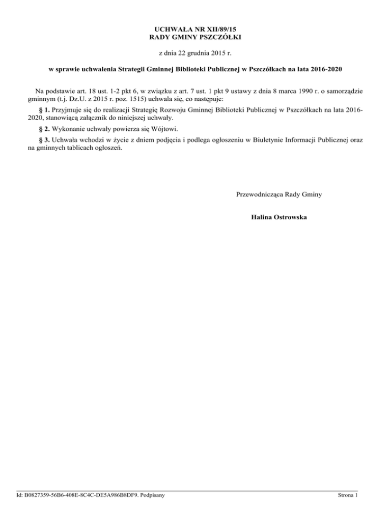 UCHWAŁA NR XII/89/15 RADY GMINY PSZCZÓŁKI z dnia 22 grudnia 2015 r. w sprawie uchwalenia Strategii Gminnej Biblioteki Publicznej w Pszczółkach na lata 2016-2020 Na podstawie art. 18 ust. 1-2 pkt 6, w związku z art. 7 ust. 1 pkt 9 ustawy z dnia 8 marca 1990 r. o samorządzie gminnym (t.j. Dz.U. z 2015 r. poz. 1515) uchwala się, co następuje: § 1. Przyjmuje się do realizacji Strategię Rozwoju Gminnej Biblioteki Publicznej w Pszczółkach na lata 20162020, stanowiącą załącznik do niniejszej uchwały. § 2. Wykonanie uchwały powierza się Wójtowi. § 3. Uchwała wchodzi w życie z dniem podjęcia i podlega ogłoszeniu w Biuletynie Informacji Publicznej oraz na gminnych tablicach ogłoszeń. Przewodnicząca Rady Gminy Halina Ostrowska Id: B0827359-56B6-408E-8C4C-DE5A986B8DF9. Podpisany Strona 1 Załącznik do uchwały Nr XII/89/15 Rady Gminy Pszczółki Z dnia 22 grudnia 2015 r. STRATEGIA ROZWOJU GMINNEJ BIBLIOTEKI PUBLICZNEJ W PSZCZÓŁKACH na lata 2016-2020 SPIS TREŚCI: I II III IV Wstęp Biblioteka i jej środowisko I.1 Charakterystyka środowiska I.2 Gminna Biblioteka Publiczna i jej potencjał Kierunki rozwoju GBP w Pszczółkach II.1 Misja biblioteki II.2 Wizja Biblioteki Obszary rozwoju biblioteki – cele i działania Zarządzanie realizacją strategii 2 3 3 4 11 11 11 11 15 1 Id: B0827359-56B6-408E-8C4C-DE5A986B8DF9. Podpisany Strona 1 Wstęp Podstawowym celem Strategii Rozwoju Gminnej Biblioteki Publicznej w Pszczółkach na lata 2016 – 2020 jest określenie kierunku rozwoju instytucji. Celem niniejszej Strategii jest również realizacja koncepcji nowoczesnej i przyjaznej mieszkańcom biblioteki jako miejsca chętnie uczęszczanego i dającego duże możliwości przyjemnego i pożytecznego spędzania wolnego czasu. Niniejszy dokument pozwala na wypracowanie działań, jakie należy podjąć, aby biblioteka zrealizowała tę koncepcję. Etapy pracy nad strategią: Po sporządzeniu wstępnego projektu w styczniu 2015 był on konsultowany z czytelnikami w okresie wiosennym. W listopadzie 2015 przeprowadzono spotkanie Komisji Oświaty, Ochrony Zdrowia, Opieki Społecznej, Kultury i Sportu Rady Gminy Pszczółki podczas którego opiniowano Strategię. W miesiącach listopad – grudzień 2015 przeprowadzono wśród czytelników ankietę w sprawie działalności Gminnej Biblioteki Publicznej w Pszczółkach w celu oceny funkcjonowania biblioteki przez użytkowników oraz dla poprawy jakości pracy w przyszłości. Dokument ten wraz z wszystkimi celami i zadaniami w nim sformułowanymi jest spójny ze Strategią Rozwoju Gminy Pszczółki do roku 2020, uwzględnia misję Gminy Pszczółki ustaloną jako „Zapewnienie godziwej jakości życia społeczności Gminy oraz jej szybki, zrównoważony rozwój poprzez inwestycje w gospodarce i infrastrukturze, przy pełnym wykorzystaniu istniejącego potencjału Gminy i jej szans rozwojowych”. 2 Id: B0827359-56B6-408E-8C4C-DE5A986B8DF9. Podpisany Strona 2 I. Biblioteka i jej środowisko I.1 Charakterystyka środowiska 1. Mapa gminy Pszczółki Gmina Pszczółki jest gminą wiejską położoną na północy Polski w województwie pomorskim, powiecie gdańskim, około 20 km na południe od Gdańska. Jej powierzchnia wynosi 49,84 km2. Użytki rolne stanowią 86 % powierzchni gminy, a użytki leśne 2 %. Gmina Pszczółki obejmuje sołectwa: Kleszczewko, Kolnik, Ostrowite, Pszczółki, Rębielcz, Różyny, Skowarcz, Ulkowy i Żelisławki. Gmina Pszczółki graniczy z gminami: Pruszcz Gdański, Suchy Dąb, Tczew, Trąbki Wielkie. Na terenie gminy zamieszkuje 8836 mieszkańców, w tym kobiet 50,5 % i mężczyzn 49,5 %. Mieszkańcy w wieku produkcyjnym stanowią 66,2 %, w wieku przedprodukcyjnym 21,6 %, w wieku poprodukcyjnym 12,2%. Dane demograficzne wg GUS – stan na 31.12.2013 r. Mieszkańcy gminy utrzymują się z pracy we własnych gospodarstwach rolnych a część jest zatrudniona w przemyśle, handlu i usługach na terenie gminy Pszczółki oraz sąsiednich gmin. 3 Id: B0827359-56B6-408E-8C4C-DE5A986B8DF9. Podpisany Strona 3 W gminie Pszczółki znajduje się Urząd Gminy, siedziba Gminnej Biblioteki Publicznej, Gminny Ośrodek Pomocy Społecznej, ośrodek zdrowia, gimnazjum, szkoły podstawowe, przedszkola, żłobek oraz obiekty sportowo - rekreacyjne takie jak stadion sportowy, Orliki, place zabaw i ścieżka rowerowa. Na terenie gminy mieści się również siedziba fundacji „Żyć Godnie”. I.2 Gminna Biblioteka Publiczna i jej potencjał 2. Gminna Biblioteka Publiczna w Pszczółkach Gminna Biblioteka Publiczna w Pszczółkach swoją działalność na terenie gminy prowadzi od 1948 roku. Od 2002 roku biblioteka działa jako samodzielna instytucja kultury. Od października 2013 roku siedziba biblioteki znajduje się w nowym, nowoczesnym, obszernym i dobrze wyposażonym w funkcjonalne meble i różnego typu sprzęty budynku usytuowanym w centrum miejscowości Pszczółki. Obiekt jest przystosowany do osób niepełnosprawnych. Biblioteka posiada wypożyczalnię książek i czytelnię czasopism, czytelnię Internetową wyposażoną w pięć stanowisk komputerowych oraz salę dla dzieci wyposażoną w scenę dla teatrzyku dziecięcego. W bibliotece znajduje się również duża sala konferencyjna wykorzystywana do organizacji różnego typu imprez. Biblioteka prowadzi trzy punkty biblioteczne w miejscowościach: Skowarcz, Żelisławki i Kleszczewko. Bogaty księgozbiór biblioteki liczy ponad 33 tys. woluminów. Korzysta z niego ponad 1500 czytelników. Biblioteka prenumeruje 28 tytułów czasopism. Biblioteka działa w następujących obszarach: 4 Id: B0827359-56B6-408E-8C4C-DE5A986B8DF9. Podpisany Strona 4 - Działalność podstawowa czyli gromadzenie, opracowanie i udostępnianie książek i czasopism, - Działalność kulturalna czyli organizacja różnego typu imprez kulturalnych, - Działalność edukacyjna czyli lekcje biblioteczne, kursy i warsztaty, - Działalność informacyjna. Biblioteka od roku 2013 posiada s