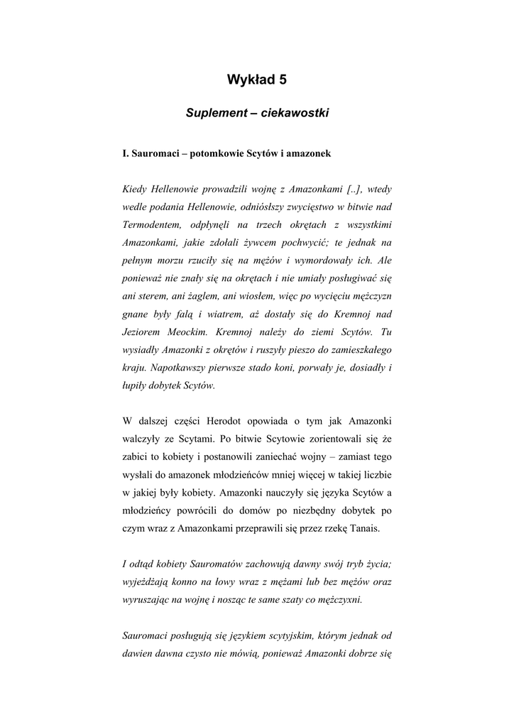 Wykład 5 Suplement – ciekawostki I. Sauromaci – potomkowie Scytów i amazonek Kiedy Hellenowie prowadzili wojnę z Amazonkami [..], wtedy wedle podania Hellenowie, odniósłszy zwycięstwo w bitwie nad Termodentem, odpłynęli na trzech okrętach z wszystkimi Amazonkami, jakie zdołali żywcem pochwycić; te jednak na pełnym morzu rzuciły się na mężów i wymordowały ich. Ale ponieważ nie znały się na okrętach i nie umiały posługiwać się ani sterem, ani żaglem, ani wiosłem, więc po wycięciu mężczyzn gnane były falą i wiatrem, aż dostały się do Kremnoj nad Jeziorem Meockim. Kremnoj należy do ziemi Scytów. Tu wysiadły Amazonki z okrętów i ruszyły pieszo do zamieszkałego kraju. Napotkawszy pierwsze stado koni, porwały je, dosiadły i łupiły dobytek Scytów. W dalszej części Herodot opowiada o tym jak Amazonki walczyły ze Scytami. Po bitwie Scytowie zorientowali się że zabici to kobiety i postanowili zaniechać wojny – zamiast tego wysłali do amazonek młodzieńców mniej więcej w takiej liczbie w jakiej były kobiety. Amazonki nauczyły się języka Scytów a młodzieńcy powrócili do domów po niezbędny dobytek po czym wraz z Amazonkami przeprawili się przez rzekę Tanais. I odtąd kobiety Sauromatów zachowują dawny swój tryb życia; wyjeżdżają konno na łowy wraz z mężami lub bez mężów oraz wyruszając na wojnę i nosząc te same szaty co mężczyxni. Sauromaci posługują się językiem scytyjskim, którym jednak od dawien dawna czysto nie mówią, ponieważ Amazonki dobrze się go nie wyuczyły. Co do zaślubin taki u nich panuje zwyczaj: Żadna dziewica nie wyjdzie wprzód za mąż, aż zabije któregoś z nieprzyjaciół. Niektóre z nich nawet umierają jako staruszki, nie wyszedłszy za mąż, ponieważ nie mogły zadośćuczynić prawu. II. O tym jak żonom znudziła się samotność Otóż Scytów, którzy przez dwadzieścia osiem lat bawili z dala od ojczyzny i po tak długim czasie teraz do niej wracali, oczekiwał tam nie mniejszy znój. Zastali Oni dość znaczne wojsk, które przeciw nim wyszło w pole: bo małżonki Scytów podczas długiej nieobecności mężów nawiązały stosunki z niewolnikami... Otóż z tych niewolników i własnych ich żon zrodzona podchowała się im młódź, która, dowiedziawszy się o swoim pochodzeniu, wyszła przeciw nim w pole, gdy wracali z kraju Medów. Ten fragment dzieła Herodota dotyczy powrotu z wyprawy Scytów do Azji Mniejszej. Zakończenie walki z dziećmi niewolników w ocenie naukowców jest mało wiarygodne. Herodot pisze, że po nieudanych walkach Scytowie postanowili pójść na wrogów z samymi batami – pokazując w ten sposób kto jest panem. Według podań helleńskich w młodzieży odezwała się krew niewolników i widząc od razu skapitulowali. Mamy więc do czynienia z delikatną propagandą wynikającą z silnego zakorzenienia niewolnictwa w kulturze starożytnej Grecji. O niewolnikach Herodot pisze również: Scytowie oślepiają wszystkich swoich niewolników – z powodu mleka kobylego, które jest ich napojem. Po wydojeniu wlewają mleko do drewnianych, wyżłobionych naczyń i, ustawiwszy ślepców dookoła tych naczyń, każą im mleko mieszać; co z niego osadzi się w górze, to zbierają i uważają za cenniejsze, a co zostanie na spodzie, za gorsze od wierzchniego. Po raz kolejny przekazy Herodota budzą wątpliwości. Z niewidomych niewolników Scytowie mieliby więcej kłopotów niż pożytku. Badacze są raczej zgodni, że niewolnictwo nie odgrywało doniosłej roli w organizacji społecznej Scytów. III. Czaszki przy stole Z samymi zaś głowami, nie wszystkich, tylko największych swych wrogów, postępują w ten sposób: co jest poniżej brwi, to wszystko odpiłowują i czaszkę oczyszczają; jeżeli kto jest biedny, obciąga ją tylko od zewnątrz surową skórą wołową i używa jej zamiast pucharu; jeżeli zaś jest bogaty obciąga ją również skórą wołową, wewnątrz jednak czaszkę pozłaca i posługuje się nią niby pucharem. [...] Jeśli potem przybędą do niego goście, z którymi się liczy, wynosi przed nich te głowy i opowiada... Zwyczaj ten szczególnie dotyczył krewnych. W przypadku rodzinnego konfliktu staczano w obecności króla pojedynek a pokonany traktowany był jak najgorszy wróg. IV. Chwała wojownikom Wobec zwykłych wrogów poprzestawano na zdjęciu skalpu, który zawieszano u uzdy konia. Ich ilość świadczyła o męstwie wojownika a zabicie pierwszego wroga czczono pijąc jego krew. Aby z kolei mieć udział w łupach należało królowi przynieść głowy zabitych. Raz do roku każdy naczelnik powiatu miesza w swoim powiecie krater wina, z którego piją ci wszyscy Scytowie, którzy zabili nieprzyjaciół; którzy zaś tego nie dokonali, Ci nie kosztują tego wina, lecz siedzą nie uczczeni na boku, a jest to dla nich największą hańbą. Ale Ci, co wyjątkowo dużo wrogów uśmiercili, otrzymują dwa puchary i piją z obydwu.