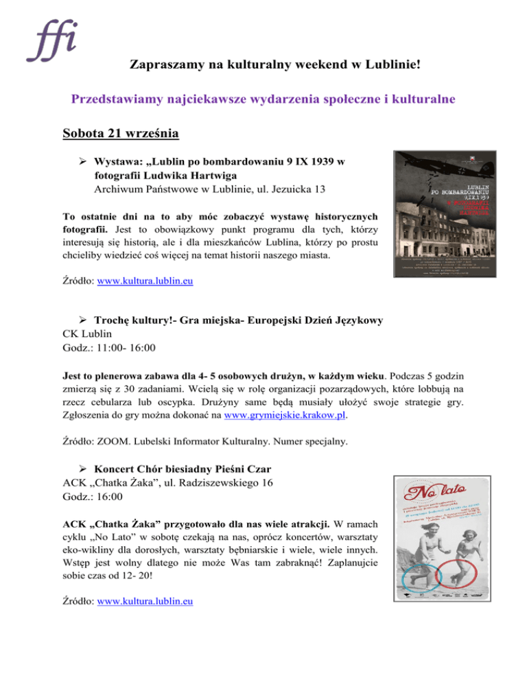 Zapraszamy na kulturalny weekend w Lublinie! Przedstawiamy najciekawsze wydarzenia społeczne i kulturalne Sobota 21 września Wystawa: „Lublin po bombardowaniu 9 IX 1939 w fotografii Ludwika Hartwiga Archiwum Państwowe w Lublinie, ul. Jezuicka 13 To ostatnie dni na to aby móc zobaczyć wystawę historycznych fotografii. Jest to obowiązkowy punkt programu dla tych, którzy interesują się historią, ale i dla mieszkańców Lublina, którzy po prostu chcieliby wiedzieć coś więcej na temat historii naszego miasta. Źródło: www.kultura.lublin.eu Trochę kultury!- Gra miejska- Europejski Dzień Językowy CK Lublin Godz.: 11:00- 16:00 Jest to plenerowa zabawa dla 4- 5 osobowych drużyn, w każdym wieku. Podczas 5 godzin zmierzą się z 30 zadaniami. Wcielą się w rolę organizacji pozarządowych, które lobbują na rzecz cebularza lub oscypka. Drużyny same będą musiały ułożyć swoje strategie gry. Zgłoszenia do gry można dokonać na www.grymiejskie.krakow.pl. Źródło: ZOOM. Lubelski Informator Kulturalny. Numer specjalny. Koncert Chór biesiadny Pieśni Czar ACK „Chatka Żaka”, ul. Radziszewskiego 16 Godz.: 16:00 ACK „Chatka Żaka” przygotowało dla nas wiele atrakcji. W ramach cyklu „No Lato” w sobotę czekają na nas, oprócz koncertów, warsztaty eko-wikliny dla dorosłych, warsztaty bębniarskie i wiele, wiele innych. Wstęp jest wolny dlatego nie może Was tam zabraknąć! Zaplanujcie sobie czas od 12- 20! Źródło: www.kultura.lublin.eu The Best Off vol. 1 - „Filmy Dobrze Zakręcone” CK w Lublinie, ul. Peowiaków 12 Godz.: 17:00 Na sobotni wieczór Centrum Kultury proponuje nam serię filmów. Każdy znajdzie coś ciekawego dla siebie. Możemy się spodziewać niezależnych produkcji wychodzących poza kinowe konwencje. Nie będzie nudno, a wręcz przeciwnie. Źródło: www.kultura.lublin.eu Eclectic Garden: Electro Acustic Beat Session feat. Paulina Przybysz, Sambasim, Soul Service, LSM Soundsystem i Subspace Centrum Kultury w Lublinie Godz. 20:00 Jest to projekt specjalnie stworzony na otwarcie CK. Na początek będziemy mogli wysłuchać występu Sambasim a następnie rozpocznie się występ improwizowany ElectroAcoustic Beat Session, którzy wystąpią razem z Pauliną Przybysz. I to nie będzie koniec atrakcji tego wieczoru... Wstęp wolny. Źródło: ZOOM Lubelski Informator Kulturalny. Numer Specjalny. Niedziela 22 września Centralny Plac Zabaw Plac Centrum Kultury Godz.: 12:00- 18:00 Ta inicjatywa ma na celu stworzenie przyjemnej przestrzeni publicznej, w której będą się mogły integrować różne środowiska miejskie. Źródło: ZOOM Lubelski Informator Kulturalny. Numer Specjalny. Mateusz Nowak- Bajko- czytanie Sala Czarna, Centrum Kultury w Lublinie Godz.: 13:00 Chcecie dowiedzieć się jak czytać bajki? Jak zachęcić dzieci do wspólnego tworzenia opowieści? Na te i wiele innych pytań odpowie prezentacja, połączona z warsztatami. Uczestnicy poznają, między innymi, zasady poprawnej emisji głosu czy zasady oddechowe. Źródło: ZOOM Lubelski Informator Kulturalny. Numer Specjalny. The Best Of vol. 2 – Złote Mrówkojady Centrum Kultury w Lublinie Godz.: 18:00 Będzie to pokaz filmów dokumentalnych, fabularnych i animowanych z festiwalu Złote Mrówkojady. Jest to nie lada gratka dla wielbicieli kina niezależnego. Festiwal, podczas którego wyświetlane są filmy zarówno profesjonalistów jak i amatorów, stał się rozpoznawalną marką nie tylko w kraju, ale i poza jego granicami. Sami przyznacie, że warto to zobaczyć. Źródło: ZOOM Lubelski Informator Kulturalny. Numer Specjalny.