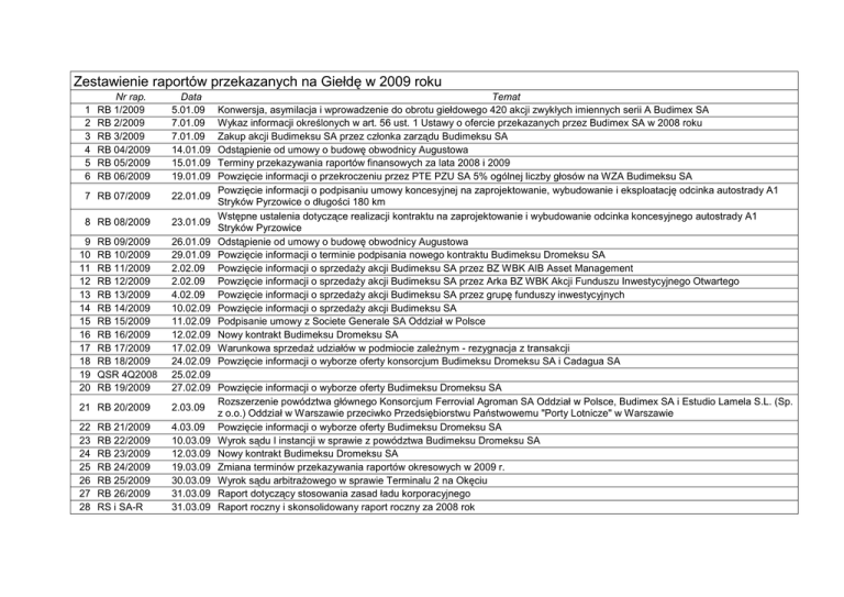 Zestawienie raportów przekazanych na Giełdę w 2009 roku Nr rap. RB 1/2009 RB 2/2009 RB 3/2009 RB 04/2009 RB 05/2009 RB 06/2009 Data 5.01.09 7.01.09 7.01.09 14.01.09 15.01.09 19.01.09 7 RB 07/2009 22.01.09 8 RB 08/2009 23.01.09 1 2 3 4 5 6 9 10 11 12 13 14 15 16 17 18 19 20 RB 09/2009 RB 10/2009 RB 11/2009 RB 12/2009 RB 13/2009 RB 14/2009 RB 15/2009 RB 16/2009 RB 17/2009 RB 18/2009 QSR 4Q2008 RB 19/2009 21 RB 20/2009 22 23 24 25 26 27 28 RB 21/2009 RB 22/2009 RB 23/2009 RB 24/2009 RB 25/2009 RB 26/2009 RS i SA-R Temat Konwersja, asymilacja i wprowadzenie do obrotu giełdowego 420 akcji zwykłych imiennych serii A Budimex SA Wykaz informacji określonych w art. 56 ust. 1 Ustawy o ofercie przekazanych przez Budimex SA w 2008 roku Zakup akcji Budimeksu SA przez członka zarządu Budimeksu SA Odstąpienie od umowy o budowę obwodnicy Augustowa Terminy przekazywania raportów finansowych za lata 2008 i 2009 Powzięcie informacji o przekroczeniu przez PTE PZU SA 5% ogólnej liczby głosów na WZA Budimeksu SA Powzięcie informacji o podpisaniu umowy koncesyjnej na zaprojektowanie, wybudowanie i eksploatację odcinka autostrady A1 Stryków Pyrzowice o długości 180 km Wstępne ustalenia dotyczące realizacji kontraktu na zaprojektowanie i wybudowanie odcinka koncesyjnego autostrady A1 Stryków Pyrzowice Odstąpienie od umowy o budowę obwodnicy Augustowa Powzięcie informacji o terminie podpisania nowego kontraktu Budimeksu Dromeksu SA Powzięcie informacji o sprzedaŜy akcji Budimeksu SA przez BZ WBK AIB Asset Management Powzięcie informacji o sprzedaŜy akcji Budimeksu SA przez Arka BZ WBK Akcji Funduszu Inwestycyjnego Otwartego Powzięcie informacji o sprzedaŜy akcji Budimeksu SA przez grupę funduszy inwestycyjnych Powzięcie informacji o sprzedaŜy akcji Budimeksu SA Podpisanie umowy z Societe Generale SA Oddział w Polsce Nowy kontrakt Budimeksu Dromeksu SA Warunkowa sprzedaŜ udziałów w podmiocie zaleŜnym - rezygnacja z transakcji Powzięcie informacji o wyborze oferty konsorcjum Budimeksu Dromeksu SA i Cadagua SA 26.01.09 29.01.09 2.02.09 2.02.09 4.02.09 10.02.09 11.02.09 12.02.09 17.02.09 24.02.09 25.02.09 27.02.09 Powzięcie informacji o wyborze oferty Budimeksu Dromeksu SA Rozszerzenie powództwa głównego Konsorcjum Ferrovial Agroman SA Oddział w Polsce, Budimex SA i Estudio Lamela S.L. (Sp. 2.03.09 z o.o.) Oddział w Warszawie przeciwko Przedsiębiorstwu Państwowemu "Porty Lotnicze" w Warszawie 4.03.09 Powzięcie informacji o wyborze oferty Budimeksu Dromeksu SA 10.03.09 Wyrok sądu I instancji w sprawie z powództwa Budimeksu Dromeksu SA 12.03.09 Nowy kontrakt Budimeksu Dromeksu SA 19.03.09 Zmiana terminów przekazywania raportów okresowych w 2009 r. 30.03.09 Wyrok sądu arbitraŜowego w sprawie Terminalu 2 na Okęciu 31.03.09 Raport dotyczący stosowania zasad ładu korporacyjnego 31.03.09 Raport roczny i skonsolidowany raport roczny za 2008 rok 29 30 31 32 33 34 35 36 37 38 39 40 41 42 43 44 45 46 47 48 49 50 51 52 53 54 55 56 57 58 59 60 61 62 RB 27/2009 RB 28/2009 RB 29/2009 RB 30/2009 RB 31/2009 RB 32/2009 RB 33/2009 RB 34/2009 QSR 1Q 2009 RB 35/2009 RB 36/2009 RB 37/2009 RB 38/2009 RB 39/2009 RB 40/2009 RB 41/2009 RB 42/2009 RB 43/2009 RB 44/2009 RB 45/2009 RB 46/2009 RB 47/2009 RB 48/2009 RB 49/2009 RB 50/2009 RB 51/2009 RB 52/2009 RB 53/2009 RB 54/2009 RB 55/2009 RB 56/2009 RB 57/2009 RB 58/2009 RB 59/2009 6.04.09 7.04.09 8.04.09 23.04.09 27.04.09 28.04.09 28.04.09 29.04.09 5.05.09 8.05.09 20.05.09 20.05.09 21.05.09 27.05.09 28.05.09 28.05.09 1.06.09 1.06.09 8.06.09 10.06.09 17.06.09 17.06.09 17.06.09 18.06.09 30.06.09 7.07.09 8.07.09 16.07.09 16.07.09 22.07.09 24.07.09 27.07.09 28.07.09 30.07.09 Zmiana terminu przekazania raportu okresowego za I kwartał 2009 roku Nowy kontrakt Budimeksu Dromeksu SA Powzięcie informacji o sprzedaŜy akcji Budimeksu SA Powzięcie informacji o wyborze oferty konsorcjum Budimeksu Dromeksu SA i Mostostalu Warszawa SA Podpisanie aneksu do umowy wielocelowej linii kredytowej Powzięcie informacji o sprzedaŜy akcji Budimeksu SA Nowy kontrakt Budimeksu Dromeksu SA Termin oraz porządek obrad ZWZA Budimeksu SA Nowy kontrakt Budimeksu Dromeksu SA Zmiana daty ustalenia listy akcjonariuszy uprawnionych do dywidendy za 2008 rok Wybór podmiotu uprawnionego do badania sprawozdań finansowych Projekt tekstu jednolitego statutu spółki Budimex SA Podpisanie aneksu do umowy zlecenia o okresowe udzielanie gwarancji ubezpieczeniowych kontraktowych z PZU SA Podpisanie aneksu do umowy wielocelowej linii kredytowej Podjęcie decyzji o rozpoczęciu prac analitycznych w zakresie połączenia Budimeksu SA z Budimeksem Dromeksem SA Projekty uchwał ZWZA Budimeksu SA oraz dokumenty związane i uzasadnienie projektów uchwał ZWZA Stanowisko zarządu Budimeksu SA odnośnie planowanego połączenia Budimeksu SA ze spółką Budimex Inwestycje Sp. z o.o. Podpisanie aneksu do umowy kredytowej z Calyon SA Wykaz akcjonariuszy uprawnionych do udziału w Walnym Zgromadzeniu Budimeksu SA Uchwały Podjęte przez Walne Zgromadzenie Budimeksu SA Uchwała WZ Budimeksu SA w sprawie wypłaty dywidendy Lista akcjonariuszy obecnych na WZ Budimeksu SA posiadających powyŜej 5% głosów na WZ Korekta raportu nr 45/2009-wykaz akcjonariuszy uprawnionych do udziału w Zwyczajnym Walnym Zgromadzeniu Budimeksu SA Podpisanie aneksu do umowy wielocelowej linii kredytowej z Fortis Bankiem Powzięcie informacji o wyborze oferty Budimeksu Dromeksu SA Skierowanie pozwu o zapłatę kary umownej Wyrok sądu II instancji w sprawie z powództwa Budimeksu Dromeksu SA Podjęcie decyzji o zamiarze połączenia Budimeksu SA z Budimeksem Dromeksem SA Podpisanie aneksu do umowy wielocelowej linii kredytowej z Fortis Bankiem Podpisanie aneksu do umowy kredytowej Nowy kontrakt Budimeksu Dromeksu SA Termin przekazania wybranych informacji finansowych ze skonsolidowanego sprawozdania finansowego za 6 miesięcy 2009 roku Wybrane dane finansowe za skonsolidowanego sprawozdania finansowego za 6 