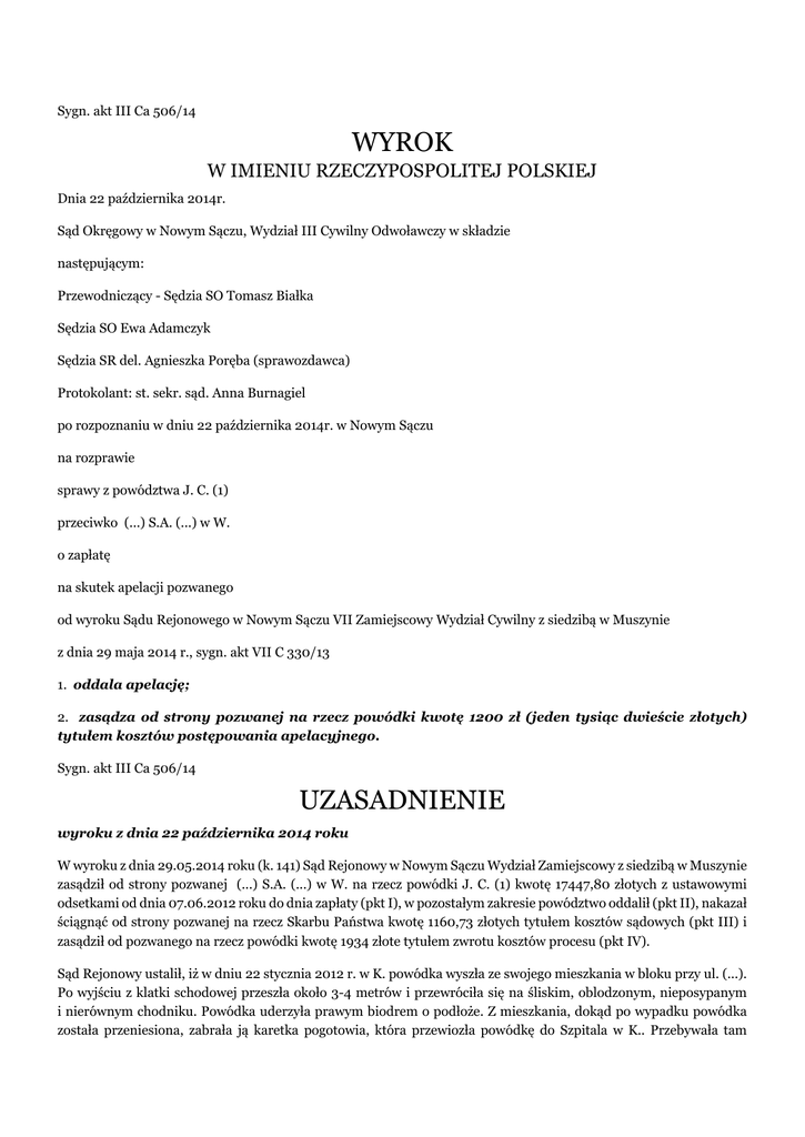 Sygn. akt III Ca 506/14 WYROK W IMIENIU RZECZYPOSPOLITEJ POLSKIEJ Dnia 22 października 2014r. Sąd Okręgowy w Nowym Sączu, Wydział III Cywilny Odwoławczy w składzie następującym: Przewodniczący - Sędzia SO Tomasz Białka Sędzia SO Ewa Adamczyk Sędzia SR del. Agnieszka Poręba (sprawozdawca) Protokolant: st. sekr. sąd. Anna Burnagiel po rozpoznaniu w dniu 22 października 2014r. w Nowym Sączu na rozprawie sprawy z powództwa J. C. (1) przeciwko (...) S.A. (...) w W. o zapłatę na skutek apelacji pozwanego od wyroku Sądu Rejonowego w Nowym Sączu VII Zamiejscowy Wydział Cywilny z siedzibą w Muszynie z dnia 29 maja 2014 r., sygn. akt VII C 330/13 1. oddala apelację; 2. zasądza od strony pozwanej na rzecz powódki kwotę 1200 zł (jeden tysiąc dwieście złotych) tytułem kosztów postępowania apelacyjnego. Sygn. akt III Ca 506/14 UZASADNIENIE wyroku z dnia 22 października 2014 roku W wyroku z dnia 29.05.2014 roku (k. 141) Sąd Rejonowy w Nowym Sączu Wydział Zamiejscowy z siedzibą w Muszynie zasądził od strony pozwanej (...) S.A. (...) w W. na rzecz powódki J. C. (1) kwotę 17447,80 złotych z ustawowymi odsetkami od dnia 07.06.2012 roku do dnia zapłaty (pkt I), w pozostałym zakresie powództwo oddalił (pkt II), nakazał ściągnąć od strony pozwanej na rzecz Skarbu Państwa kwotę 1160,73 złotych tytułem kosztów sądowych (pkt III) i zasądził od pozwanego na rzecz powódki kwotę 1934 złote tytułem zwrotu kosztów procesu (pkt IV). Sąd Rejonowy ustalił, iż w dniu 22 stycznia 2012 r. w K. powódka wyszła ze swojego mieszkania w bloku przy ul. (...). Po wyjściu z klatki schodowej przeszła około 3-4 metrów i przewróciła się na śliskim, oblodzonym, nieposypanym i nierównym chodniku. Powódka uderzyła prawym biodrem o podłoże. Z mieszkania, dokąd po wypadku powódka została przeniesiona, zabrała ją karetka pogotowia, która przewiozła powódkę do Szpitala w K.. Przebywała tam na Oddziale (...)w dniach 22-25 stycznia 2012 r. z rozpoznaniem złamania dolnej gałęzi kości łonowej prawej bez przemieszczenia. Poszkodowana leżała na wznak na materacu przeciwodleżynowym, gdyż nie mogła zmieniać pozycji. Było to dla niej szczególnie uciążliwe, ze względu na trudności ze snem. Po wypisie ze szpitala powódka była leczona zachowawczo. Przez 6 tygodni leżała w domu, a później ambulatoryjnie leczona była w Poradni (...). Przez pierwsze cztery tygodnie poszkodowana nadal zmuszona była leżeć na wznak, później mogła już lekko przewrócić się na lewy bok. Przebywając w domu J. C. (1) sama aplikowała sobie zastrzyki przeciwzakrzepowe oraz leki przeciwbólowe. Po przebytym urazie przez około 6 tygodni, tj. do czasu zrostu złamania powódka wymagała pomocy innych osób. W tym czasie, nieżyjący obecnie mąż powódki J. C. (2) był chory i sam wymagał opieki. Z kolei jej syn T. C. jest niepełnosprawny. Opiekę nad powódką i jej domownikami sprawowała sąsiadka C. B.. Za wykonane czynności C. B. nie uzyskała od powódki zapłaty. Po sześciu tygodniach powódka mogła samodzielnie poruszać się o kulach. Leczenie zakończyła w październiku 2012 r. W dniach od 20 września do 11 października 2012 r. była rehabilitowana w Oddziale (...) w L.. Nadto sąd ustalił, iż powódka kupowała leki w związku z wypadkiem za łączną sumę 47,80 zł. Lekarz zalecił również masaż klasyczny, który nie podlegał refundacji. Powódka skorzystała z dziesięciu zabiegów masażu klasycznego, za który zapłaciła 400 zł. Sąd Rejonowy ustalił też, że wypadek, któremu uległa J. C. (1) miał miejsce na odcinku chodnika służącemu jako dojście do budynku nr (...) przy ulicy (...) w K.. Teren ten znajduje się w obrębie działki ew. nr (...) i stanowi własność Gminy K.. Dojście do budynku w okresie zimowym utrzymywane jest przez Wspólnotę Mieszkaniową bloku nr(...) przy ulicy (...) w K.. Gmina K. nie zawierała ze Wspólnotą Mieszkaniową bloku nr (...) umowy dotyczącej zimowego odśnieżania chodnika stanowiącego dojście do tego budynku, ani też nie zlecała innym podmiotom zimowego utrzymania chodnika. W dniu wypadku Gmina K. związana była z pozwanym (...) S.A. (...)w W. umową ubezpieczenia odpowiedzialności cywilnej gminy potwierdzonej polisą nr (...), do której zastosowanie znajdują Ogólne Warunki Ubezpieczenia. Mając na uwadze powyższe ustalenia Sąd Rejonowy przyjął, iż za utrzymanie chodnika przy ul. (...) w K., na którym doszło do przedmiotowego zdarzenia odpowiadają solidarnie Gmina K., a pośrednio jako związana umową ubezpieczenia także strona pozwana oraz Wspólnota Mieszkaniowa przy ul. (...) na zasadzie art. 441 § 1 k.c.. Powołał się przy tym na z art. 20 pkt 4 w zw. z art.19.ust.2 pkt.4 ustawy z dnia 21 marca 1985 r. o drogach publicznych ( tekst jedn. Dz. U. 2013 r., poz. 260 ze zm.) oraz art. 5 ust. 1 pkt 4 w zw. z art. 2 pkt 4 ustawy z dnia 13 września 1996 r. o utrzymaniu czystości i porządku w gminach ( tekst jedn. Dz. U. 2013, poz.1399 ze zm.) zgodnie z którymi obowiązek utrzymania chodników spoczywa solidarnie na zarządcy drogi oraz właścicielach i użytkownikach wieczystych nieruchomości do nich bezpośrednio przyległych. Sąd Rejonowy wywiódł, iż skoro za utrzymanie czystości chodnika odpowiedzialna była Gmina K. to zgodnie z art. 822 § 4.k.c. uprawniony do odszkodowania w związku ze zdarzeniem objętym umową ubezpieczenia odpowiedzialności cywilnej może dochodzić roszczenia bezpośrednio od ubezpieczyciela. Ustalając wysokość dochodzonego roszczenia Sąd oparł się na przepisach art. 444 k.c. i 445 § 1 k.c. Rozstrzygnięcie o kosztach sądowych uzasadniono treścią art. 113 ust.1 ustawy o kosztach sądowych w sprawach cywilnych przy zastosowaniu art.98.§ 1.k.p.c., zaś rozstrzygnięcie o kosztach procesu oparto na podstawie art. 100 zd. 1.k.p.c. stosunkowo je rozdzielając (w 4/5 częściach). Apelację od tego wyroku zł