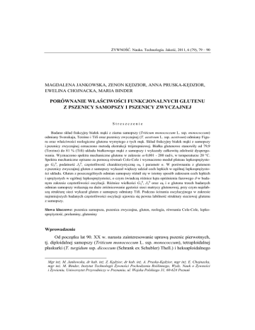 ŻYWNOŚĆ. Nauka. Technologia. Jakość, 2011, 6 (79), 79 – 90 MAGDALENA JANKOWSKA, ZENON KĘDZIOR, ANNA PRUSKA-KĘDZIOR, EWELINA CHOJNACKA, MARIA BINDER PORÓWNANIE WŁAŚCIWOŚCI FUNKCJONALNYCH GLUTENU Z PSZENICY SAMOPSZY I PSZENICY ZWYCZAJNEJ Streszczenie Badano skład frakcyjny białek mąki z ziarna samopszy (Triticum monococcum L. ssp. monococcum) odmiany Svenskaja, Terzino i Tifi oraz pszenicy zwyczajnej (T. aestivum L. ssp. aestivum) odmiany Figura oraz właściwości reologiczne glutenu wymytego z tych mąk. Skład frakcyjny białek mąki z samopszy i pszenicy zwyczajnej oznaczono metodą ekstrakcji trójstopniowej. Białka glutenowe stanowiły od 79,9 (Terzino) do 81 % (Tifi) układu białkowego mąki z samopszy i wykazały całkowitą zdolność dyspergowania. Wyznaczono spektra mechaniczne glutenu w zakresie 0,001 - 200 rad/s, w temperaturze 20 C. Spektra mechaniczne opisano za pomocą równań Cole-Cole i wyznaczono moduł plateau lepkosprężystego GN0, podatność JN0, częstotliwość charakterystyczną 0 i parametr n. W porównaniu z glutenem z pszenicy zwyczajnej gluten z samopszy wykazał większy udział cech lepkich w ogólnej lepkosprężystości układu. Gluten z poszczególnych odmian samopszy różnił się w istotny sposób zakresem cech lepkich i sprężystych w ogólnej lepkosprężystości, o czym świadczą różnice kąta opóźnienia fazowego w badanym zakresie częstotliwości oscylacji. Różnice wielkości GN0, JN0 oraz 0 i n glutenu trzech badanych odmian samopszy wskazują na duże zróżnicowanie gęstości sieci matrycy glutenowej, przy czym najsłabszą strukturę sieci wykazał gluten z samopszy odmiany Tifi. Podczas ścinania oscylacyjnego w zakresie najmniejszych badanych częstotliwości oscylacji ujawnia się pewna labilność struktury sieciowej glutenu z samopszy. Słowa kluczowe: pszenica samopsza, pszenica zwyczajna, gluten, reologia, równania Cole-Cole, lepkosprężystość, prolaminy, gluteniny Wprowadzenie Od początku lat 90. XX w. narasta zainteresowanie uprawą pszenic pierwotnych, tj. diploidalnej samopszy (Triticum monococcum L. ssp. monococcum), tetraploidalnej płaskurki (T. turgidum ssp. dicoccum (Schrank ex Schubler) Thell.) i heksaploidalnego Mgr inż. M. Jankowska, dr hab. inż. Z. Kędzior, dr hab. inż. A. Pruska-Kędzior, mgr inż. E. Chojnacka, mgr inż. M. Binder, Instytut Technologii Żywności Pochodzenia Roślinnego, Wydz. Nauk o Żywności i Żywieniu, Uniwersytet Przyrodniczy w Poznaniu, ul. Wojska Polskiego 31, 60-624 Poznań 80 Magdalena Jankowska, Zenon Kędzior, Anna Pruska-Kędzior, Ewelina Chojnacka, Maria Binder orkiszu (T. aestivum ssp. spelta (L.) Thell.). W rozwoju tych upraw upatruje się szansy na podtrzymanie bioróżnorodności środowiska rolniczego [4, 28, 29] oraz pozyskania ziarna konsumpcyjnego o potencjalnie większej zawartości składników biologicznie czynnych, korzystnych w żywieniu człowieka, niż wynosi ich zawartość w ziarnie pszenicy zwyczajnej [4, 15, 17, 20, 21, 25, 26]. Mąka z samopszy ma niską wartość wypiekową, co oznacza, że konieczne jest dostosowanie procesu prowadzenia ciasta i wypieku pieczywa do specyfiki tego surowca [1, 10, 13, 30]. Jednym z czynników determinujących właściwości technologiczne mąki z samopszy jest skład frakcyjny zespołu białek glutenowych i determinowane przez ten czynnik właściwości fizykochemiczne matrycy glutenowej. Jeżeli badaniom składu frakcyjnego białek samopszy poświęcono wiele uwagi [3, 8, 30], to nadal niepoznane pozostają podstawowe właściwości reologiczne glutenu z samopszy. Celem pracy było scharakteryzowanie właściwości reologicznych glutenu z samopszy za pomocą metody reologii oscylacyjnej z uwzględnieniem wpływu składu frakcyjnego układu białek glutenowych na lepkosprężystość matrycy glutenowej. Materiał i metody badań Materiał wyjściowy do badań stanowiło ziarno trzech odmian ozimych samopszy (Triticum monococcum L. ssp. monococcum): Svenskaja, Terzino i Tifi (K.-J. Mueller Getreidezüchtungsforschung Darzau, 29490 Neu Darchau, Niemcy) oraz ziarno pszenicy zwyczajnej (T. aestivum L. ssp. aestivum) odmiany Figura (DANKO, Hodowla Roślin Sp. z o.o. w Choryni). Ziarno obu gatunków pszenic przemielono na mąkę w młynie laboratoryjnym Brabender, model Quadrumat Senior. Na dobę przed przemiałem wilgotność prób ziarna przeznaczonych do przemiału doprowadzono do poziomu 14,75 %. Wilgotność surowców oznaczano metodą suszarkową wg Polskiej Normy [19]. Zawartość białka w surowcach oznaczano metodą Kjeldahla stosując przelicznik N5,7. Dokonano ogólnej charakterystyki technologicznej otrzymanych mąk laboratoryjnych, oznaczając liczbę sedymentacyjną wg Zeleny’ego, wydajność i rozpływalność glutenu oraz liczbę opadania. Określano skład frakcyjny układu białkowego mąki z samopszy i pszenicy zwyczajnej, posługując się metodą ekstrakcji trójstopniowej wg Coatesa i Simmondsa [9] w modyfikacji Jankiewicza [14], wyodrębniając ekstrakt albumin i globulin w 0,01 M buforze pirofosforanowym o pH 7,0, ekstrakt prolamin w 0,05 M kwasie octowym oraz ekstrakt glutelin w 0,1 M NaOH. Właściwości reologiczne glutenu z samopszy i pszenicy zwyczajnej badano za pomocą reometru oscylacyjnego o kontrolowanym naprężeniu firmy Rheometric Scientific, model DSR 500, stosując geometrię pomiarową stożek-płytka (średnica stożka 25 mm, kąt rozwarcia 0,1 rad, szczelina pomiarowa 0,056 mm). Pomiary pro- PORÓWNANIE WŁAŚCIWOŚCI FUNKCJONALNYCH GLUTENU Z PSZENICY SAMOPSZY… 81 wadzono w temp. 20 ± 0,1 ºC. Próbki glutenu przeznaczonego do badań zabezpieczano przed zachodzeniem spontanicznych reakcji wymiany SH - SS lub powstawania nowych wiązań SS, prowadząc końcową fazę hydratacji glutenu (30 min) i pomiary reometryczne w środowisku 0,1 M roztworu NEMI (n-etylomaleinimid) [16, 22]. W celu zapobieżenia efektom parowania roztworu NEMI i/lub wysychania próby podcza