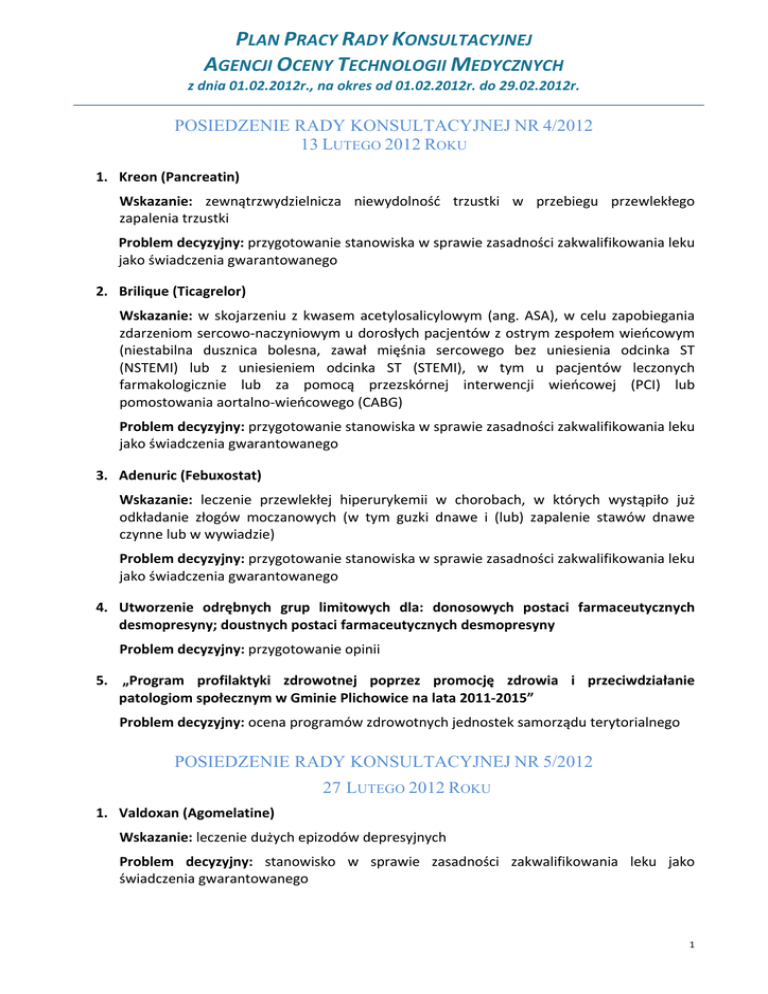 PLAN PRACY RADY KONSULTACYJNEJ AGENCJI OCENY TECHNOLOGII MEDYCZNYCH z dnia 01.02.2012r., na okres od 01.02.2012r. do 29.02.2012r. POSIEDZENIE RADY KONSULTACYJNEJ NR 4/2012 13 LUTEGO 2012 ROKU 1. Kreon (Pancreatin) Wskazanie: zewnątrzwydzielnicza niewydolność trzustki w przebiegu przewlekłego zapalenia trzustki Problem decyzyjny: przygotowanie stanowiska w sprawie zasadności zakwalifikowania leku jako świadczenia gwarantowanego 2. Brilique (Ticagrelor) Wskazanie: w skojarzeniu z kwasem acetylosalicylowym (ang. ASA), w celu zapobiegania zdarzeniom sercowo-‐naczyniowym u dorosłych pacjentów z ostrym zespołem wieńcowym (niestabilna dusznica bolesna, zawał mięśnia sercowego bez uniesienia odcinka ST (NSTEMI) lub z uniesieniem odcinka ST (STEMI), w tym u pacjentów leczonych farmakologicznie lub za pomocą przezskórnej interwencji wieńcowej (PCI) lub pomostowania aortalno-‐wieńcowego (CABG) Problem decyzyjny: przygotowanie stanowiska w sprawie zasadności zakwalifikowania leku jako świadczenia gwarantowanego 3. Adenuric (Febuxostat) Wskazanie: leczenie przewlekłej hiperurykemii w chorobach, w których wystąpiło już odkładanie złogów moczanowych (w tym guzki dnawe i (lub) zapalenie stawów dnawe czynne lub w wywiadzie) Problem decyzyjny: przygotowanie stanowiska w sprawie zasadności zakwalifikowania leku jako świadczenia gwarantowanego 4. Utworzenie odrębnych grup limitowych dla: donosowych postaci farmaceutycznych desmopresyny; doustnych postaci farmaceutycznych desmopresyny Problem decyzyjny: przygotowanie opinii 5. „Program profilaktyki zdrowotnej poprzez promocję zdrowia i przeciwdziałanie patologiom społecznym w Gminie Plichowice na lata 2011-‐2015” Problem decyzyjny: ocena programów zdrowotnych jednostek samorządu terytorialnego POSIEDZENIE RADY KONSULTACYJNEJ NR 5/2012 27 LUTEGO 2012 ROKU 1. Valdoxan (Agomelatine) Wskazanie: leczenie dużych epizodów depresyjnych Problem decyzyjny: stanowisko w sprawie zasadności zakwalifikowania leku jako świadczenia gwarantowanego 1 2. Zahron (Rosuvastatin) Wskazanie: pierwotna hipercholesterolemia (typu IIa) lub mieszana dyslipidemia (typu IIb) jako leczenie dodatkowe do diety, gdy stosowanie diety i innych niefarmakologicznych sposobów leczenia (np. ćwiczenia fizyczne, zmniejszenie masy ciała) jest niewystarczające. Rodzinna homozygotyczna hipercholesterolemia jako leczenie dodatkowe do diety i innych sposobów leczenia zmniejszającego stężenie lipidów (np. afereza LDL), lub jeśli inne sposoby leczenia są niewłaściwe Problem decyzyjny: stanowisko w sprawie zasadności zakwalifikowania leku jako świadczenia gwarantowanego 3. Pradaxa (Debigatran etexilate) Wskazanie: prewencja udarów i zatorowości systemowej u dorosłych pacjentów z niezastawkowym migotaniem przedsionków z jednym lub więcej następujących czynników ryzyka: przebyty udar, przemijający napad niedokrwienny lub zatorowość systemowa, frakcja wyrzutowa lewej komory serca < 40% objawowa niewydolność serca, II kl. wg NYHA, wiek 75 lat, wiek 65 lat i towarzysząca mu jedna z następujących chorób: cukrzyca, choroba wieńcowa lub nadciśnienie tętnicze Problem decyzyjny: przygotowanie stanowiska w sprawie zasadności zakwalifikowania leku jako świadczenia gwarantowanego 4. Xarelto (Rywaroksaban) Wskazanie: profilaktyka udaru i zatorowości obwodowej u dorosłych pacjentów z migotaniem przedsionków niezwiązanych z wadą zastawkową z jednym lub kilkoma czynnikami ryzyka, takimi jak zastoinowa niewydolność serca, nadciśnienie tętnicze krwi, wiek 75 lat, cukrzyca, udar lub przemijający udar niedokrwienny w wywiadzie Problem decyzyjny: stanowisko w sprawie zasadności zakwalifikowania leku jako świadczenia gwarantowanego 5. Xarelto (Rywaroksaban) Wskazanie: leczenie zakrzepicy żył głębokich (ZŻG) oraz profilaktyka nawrotowej ZŻG i zatorowości płucnej (ZP) po ostrej ZŻG dorosłych Problem decyzyjny: stanowisko w sprawie zasadności zakwalifikowania leku jako świadczenia gwarantowanego 6. Mabthera (Rytuxymab) Wskazanie: leczenie chłoniaków nieziarniczych przy wykorzystaniu produktu leczniczego Mabthera® (rytuksymab) w ramach Terapeutycznego Programu Zdrowotnego „Leczenie chłoniaków złośliwych” Problem decyzyjny: stanowisko w sprawie usunięcia z wykazu świadczeń gwarantowanych albo zmiany sposobu lub poziomu finansowania świadczenia gwarantowanego 7. Program profilaktyki i wczesnego wykrywania cukrzycy typu 2” „Profilaktyka cukrzycy i promocja zdrowia w cukrzycy w gminie Polkowice” Problem decyzyjny: ocena programów zdrowotnych jednostek samorządu terytorialnego 8. „Narodowy Program Profilaktyki i Edukacji Diabetologicznej” Problem decyzyjny: ocena programu zdrowotnego Ministra Zdrowia 2 9. „Terapia protonowa nowotworów oka” Problem decyzyjny: stanowisko w sprawie zasadności zakwalifikowania świadczenia opieki zdrowotnej jako świadczenia gwarantowanego 10. „Program profilaktyki antynikotynowej oraz zapobiegania próchnicy u uczniów klas III szkół gimnazjalnych na terenie Mysłowic” „Program zdrowotny „Zapobieganie próchnicy zębów u dzieci” „Program profilaktycznych zapobiegania próchnicy dla dzieci klas II Zabrzańskich szkół z elementami profilaktyki uzależnień” „Profilaktyka chorób jamy ustnej i ich powikłań w ramach „FLC – Profilaktyka w ciąży” „Miejski program „Profilaktyki Próchnicy dla dzieci i młodzieży do 18 roku” „Promocja zdrowia higieny jamy ustnej oraz zapobieganie próchnicy poprzez leczenie stomatologiczne zachowawcze” Problem decyzyjny: ocena programów zdrowotnych jednostek samorządu terytorialnego 3