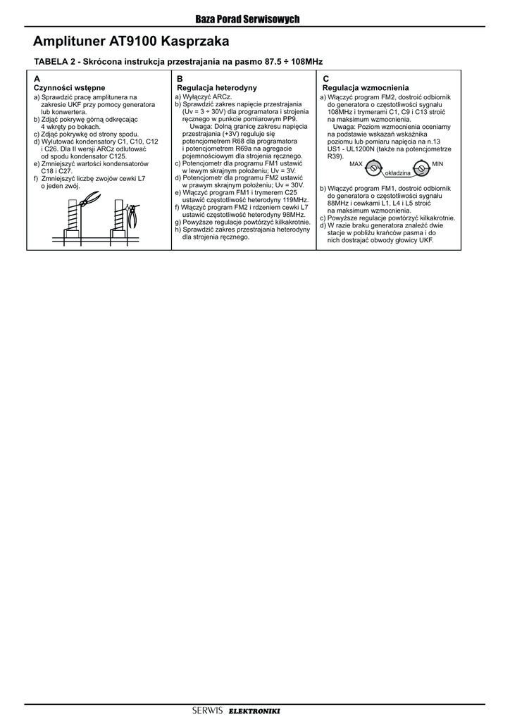 Baza Porad Serwisowych Amplituner AT9100 Kasprzaka TABELA 2 - Skrócona instrukcja przestrajania na pasmo 87.5 ÷ 108MHz A B a) Sprawdziæ pracê amplitunera na zakresie UKF przy pomocy generatora lub konwertera. b) Zdj¹æ pokrywê górn¹ odkrêcaj¹c 4 wkrêty po bokach. c) Zdj¹æ pokrywkê od strony spodu. d) Wylutowaæ kondensatory C1, C10, C12 i C26. Dla II wersji ARCz odlutowaæ od spodu kondensator C125. e) Zmniejszyæ wartoœci kondensatorów C18 i C27. f) Zmniejszyæ liczbê zwojów cewki L7 o jeden zwój. a) Wy³¹czyæ ARCz. b) Sprawdziæ zakres napiêcie przestrajania (Uv = 3 ÷ 30V) dla programatora i strojenia rêcznego w punkcie pomiarowym PP9. Uwaga: Doln¹ granicê zakresu napiêcia przestrajania (+3V) reguluje siê potencjometrem R68 dla programatora i potencjometrem R69a na agregacie pojemnoœciowym dla strojenia rêcznego. c) Potencjometr dla programu FM1 ustawiæ w lewym skrajnym po³o¿eniu; Uv = 3V. d) Potencjometr dla programu FM2 ustawiæ w prawym skrajnym po³o¿eniu; Uv = 30V. e) W³¹czyæ program FM1 i trymerem C25 ustawiæ czêstotliwoœæ heterodyny 119MHz. f) W³¹czyæ program FM2 i rdzeniem cewki L7 ustawiæ czêstotliwoœæ heterodyny 98MHz. g) Powy¿sze regulacje powtórzyæ kilkakrotnie. h) Sprawdziæ zakres przestrajania heterodyny dla strojenia rêcznego. Czynnoœci wstêpne Regulacja heterodyny SERWIS ELEKTRONIKI C Regulacja wzmocnienia a) W³¹czyæ program FM2, dostroiæ odbiornik do generatora o czêstotliwoœci sygna³u 108MHz i trymerami C1, C9 i C13 stroiæ na maksimum wzmocnienia. Uwaga: Poziom wzmocnienia oceniamy na podstawie wskazañ wskaŸnika poziomu lub pomiaru napiêcia na n.13 US1 - UL1200N (tak¿e na potencjometrze R39). MAX MIN ok³adzina b) W³¹czyæ program FM1, dostroiæ odbiornik do generatora o czêstotliwoœci sygna³u 88MHz i cewkami L1, L4 i L5 stroiæ na maksimum wzmocnienia. c) Powy¿sze regulacje powtórzyæ kilkakrotnie. d) W razie braku generatora znaleŸæ dwie stacje w pobli¿u krañców pasma i do nich dostrajaæ obwody g³owicy UKF.
