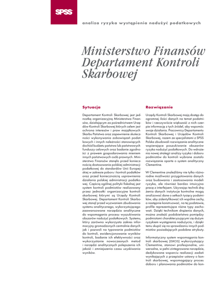 an a l iza r y z y ka w yst ą pi e ni a n a d uż yć p o d a t kow yc h Ministerstwo Finansów Departament Kontroli Skarbowej Sytuacja Rozwiązanie Departament Kontroli Skarbowej jest jednostką organizacyjną Ministerstwa Finansów, działającym za pośrednictwem Urzędów Kontroli Skarbowej których celem jest ochrona interesów i praw majątkowych Skarbu Państwa oraz zapewnienie skuteczności wykonywania zobowiązań podatkowych i innych należności stanowiących dochód budżetu państwa lub państwowych funduszy celowych oraz badanie zgodności z prawem gospodarowania mieniem innych państwowych osób prawnych. Ministerstwo Finansów stanęło przed koniecznością dostosowania polskiej administracji podatkowej do standardów Unii Europejskiej w zakresie poboru i kontroli podatków oraz przed koniecznością usprawnienia działania polskiej administracji podatkowej. Częścią ogólnej polityki fiskalnej jest system kontroli podmiotów realizowany przez jednostki organizacyjne kontroli skarbowej którymi są Urzędy Kontroli Skarbowej. Departament Kontroli Skarbowej stanął przed wyzwaniem zbudowania systemu analitycznego, wykorzystującego zaawansowane narzędzia analityczne do wspomagania procesu wyszukiwania obszarów nadużyć podatkowych. Systemu, który zarówno wykorzysta zakres informacyjny gromadzonych centralnie danych jak i pozwoli na typowanie podmiotów do kontroli, ewidencjonowanie wyników kontroli, badanie ich efektywności oraz wykorzystanie nowoczesnych metod i narzędzi analitycznych polepszenia ich jakość i zmniejszenia czasu uzyskiwania wyników. Urzędy Kontroli Skarbowej mają dostęp do ogromnej ilości danych na temat podatników i rzeczywiście większość z nich czerpie informację z tych źródeł, aby wspomóc swoje działania. Pracownicy Departamentu Kontroli Skarbowej i Urzędów Kontroli Skarbowej, razem ze specjalistami z SPSS Polska zbudowali rozwiązanie analityczne wspierające poszukiwanie obszarów ryzyka nadużyć podatkowych. Do wdrożenia nowej strategii analizy ryzyka i doboru podmiotów do kontroli wybrane zostało rozwiązanie oparte o system analityczny Clementine. W Clementine znaleźliśmy nie tylko różnorodne możliwości przygotowania danych oraz budowania i zastosowania modeli ryzyka, ale również bardzo intuicyjna pracę z interfejsem. Używając technik drążenia danych instytucje kontrolne mogą analizować dane o setkach tysięcy podatników, aby zidentyfikować ich wspólne cechy, a następnie konstruować, na tej podstawie, profile reprezentujące różne typy zachowań. Dzięki technikom drążenia danych, można znaleźć podobieństwa pomiędzy podmiotami charakteryzującymi się dużym ryzykiem wystąpienia nadużycia, i dzięki temu skupić się na sprawdzaniu innych podmiotów posiadających podobne atrybuty. Informatyczny system wspomagania kontroli skarbowej ( ISKOS ) wykorzystujący Clementine, stanowi profesjonalne, uniwersalne, w pełni zintegrowane narzędzie, dedykowane wsparciu realizacji zadań wynikających z przepisów ustawy o kontroli skarbowej, wspomagający proces doboru i planowania podmiotów do kon- troli, poprzez wykorzystanie analizy ryzyka i automatyzację procedur. Wyniki analiz realizowanych z wykorzystaniem narzędzi analitycznych SPSS wykorzystywane są zarówno przez analityków z Departamentu Kontroli Skarbowej, jak i analityków z komórek planowania kontroli w Urzędach Kontroli Skarbowej oraz inspektorów kontroli skarbowej i pracowników wykonujący czynności kontrolne. Typowanie podmiotów do kontroli, ze względu na swoją złożoność wymaga dużej wydajności od wykorzystywanych narzędzi analitycznych. Zastosowane rozwiązanie analityczne umożliwia pracę w architekturze klient-serwer, co zapewnia odpowiednią wydajność i stabilność pracy. Zastosowane rozwiązanie sprawia, że przy tak dużym obciążeniu, wszystkie operacje wykonywane są szybko, a czas ich realizacji nie przekracza kilku godzin. Korzyści SPSS Polska u l. Ra cł awi cka 5 8 3 0 – 01 7 Kraków t e l . / faks 0 12 .6 36 .0 7. 9 1 te l . /f aks 0 1 2. 63 6. 45 .3 5 t el . / fa ks 01 2. 63 6. 96 . 80 e – mai l: in fo @ s ps s .pl www.s ps s.pl ww w.an aliz ad an ych .pl www.we bm in in g.pl Skupienie się na kontroli podatników o podwyższonym ryzyku zagrożenia przestępczością podatkową daje w efekcie wzrost efektywności kontroli oraz maksymalizację ściągalności podatków. Trafny dobór podatników do kontroli pośrednio podwyższa dobrowolne płacenie podatków oraz bezpośrednio generuje dodatkową ich ściągalność, co pomaga zmniejszyć obszar szarej strefy. Efektywne zarządzanie zespołami kontrolującymi podatników wymaga jednak podejmowania wielu decyzji, i tu wsparcie ze strony wykorzystywanych narzędzi analitycznych SPSS jest nieocenione. Wykorzystanie Clementine do drążenia danych nie tylko umożliwia ich zrozumienie, ale także analizę i prognozę zachowań podmiotów unikających płacenia podatków. Udział specjalistów z SPSS Polska został bardzo wysoko oceniony, nie tylko ze względu na wysoki poziom wsparcia uzyskiwanego w ramach budowy modeli analizy ryzyka, ale również ze względu na wysoki poziom szkoleń przeprowadzanych dla analityków ryzyka, w tym w szczególności za: wysoki poziom wiedzy wykładowców, merytoryczne i dobrze przygotowane materiały szkoleniowe, wysoki poziom wiedzy o poszczególnych obszarach podatkowych, umiejętność przekazywania wiedzy i zaangażowanie wykładowców w pracę.