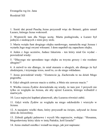 Ewangelia wg św. Jana Rozdział XII 1. Sześć dni przed Paschą Jezus przyszedł więc do Betanii, gdzie umarł Łazarz, którego Jezus wskrzesił. 2. Wyprawili tam dla Niego ucztę. Marta posługiwała, a Łazarz był jednym z siedzących z nimi przy stole. 3. Maria wzięła funt drogiego olejku nardowego, namaściła nogi Jezusa i wytarła Jego nogi swymi włosami. I dom napełnił się zapachem olejku. 4. Jeden z Jego uczniów, Judasz Iskariota - ten który miał Go wydać powiedział wtedy: 5. “Dlaczego nie sprzedano tego olejku za trzysta groszy i nie rozdano ubogim?” 6. A mówił to nie dlatego, że miał staranie o ubogich, ale dlatego że był złodziejem, i trzymając trzos, nosił to, co do niego wkładano. 7. Jezus powiedział wtedy: “Zostawcie ją. Zachowała to na dzień Mego pogrzebu. 8. Gdyż ubogich zawsze macie u siebie, a Mnie nie zawsze macie.” 9. Wielka rzesza Żydów dowiedziała się wtedy, że tam jest. I przyszli nie tylko ze względu na Jezusa, ale aby ujrzeć Łazarza, którego wzbudził z martwych. 10. Lecz najwyżsi kapłani planowali, aby Łazarza również zabić. 11. Gdyż wielu Żydów ze względu na niego odchodziło i wierzyło w Jezusa. 12. A nazajutrz wielki tłum, który przyszedł na święto, usłyszał że Jezus idzie do Jerozolimy. 13. Zebrali gałązki palmowe i wyszli Mu naprzeciw, wołając: “Hosanna, błogosławiony który idzie w imię Pańskie, król Izraela!” 14. Jezus znalazł osiołka i wsiadł na niego, jak jest napisane: 15. “Nie bój się córo syjońska! Oto jedzie twój król siedząc na źrebięciu oślicy.” 16. Jego uczniowie nie rozumieli tego najpierw, lecz gdy Jezus został uwielbiony, wtedy przypomnieli sobie, że było to o Nim napisane i to Mu uczynili. 17. A lud, który był z Nim, kiedy wezwał Łazarza z grobu i wskrzesił go z umarłych, sławił Jego czyn. 18. Dlatego też cały lud wyszedł Mu naprzeciw, gdyż słyszeli, że to On uczynił ten cud. 19. Faryzeusze mówili więc między sobą: “Czy widzicie, że nic nie osiągacie? Oto cały świat poszedł za Nim”. 20. A byli tam pewni poganie z tych, którzy przyszli, aby oddać pokłon w dzień święty. 21. Oni to przyszli do Filipa, który pochodził z Betsaidy Galilejskiej i prosili go, mówiąc: “Panie, chcemy zobaczyć Jezusa”. 22. Filip poszedł i powiedział Andrzejowi. Następnie Andrzej i Filip powiedzieli Jezusowi. 23. A Jezus odpowiedział im mówiąc: “Przyszła godzina, aby Syn Człowieczy został uwielbiony. 24. Zaprawdę, zaprawdę mówię wam: Jeśli ziarno pszenicy wpadając do ziemi nie obumrze, zostaje samo. Lecz jeśli obumrze, przynosi wielki owoc. 25. Kto kocha swe życie, straci je, a kto nienawidzi swego życia na tym świecie, zachowa je ku życiu wiecznemu. 26. Jeśli ktoś Mi służy, niech idzie za Mną, a gdzie Ja jestem, tam będzie również Mój sługa. Jeśli ktoś będzie Mi służył, uczci go Mój Ojciec. 27. Teraz dusza moja jest zatrwożona, i co mam powiedzieć? Ojcze, wybaw Mnie od tej godziny? Lecz po to przyszedłem na tę godzinę. 28. Ojcze! Uwielbij imię Twoje!” Rozległ się wtedy głoś z nieba: “I uwielbiłem i jeszcze uwielbię”. 29. Wtedy lud, który stał i usłyszał to, powiedział, że zagrzmiało. A inni mówili: “Anioł przemówił do Niego”. 30. Jezus odpowiedział: “Nie dla Mnie ten głos przyszedł, lecz dla was. 31. Teraz jest sąd nad światem, teraz książe tego świata zostanie wyrzucony precz. 32. A gdy Ja będę podwyższony ponad ziemię, pociągnę wszystko do siebie”. 33. Mówił to, oznajmując jaką śmiercią miał umrzeć. 34. Lud odpowiedział Mu: “My słyszeliśmy w Prawie, że Chrystus trwa na wieki, a dlaczego Ty mówisz: “Potrzeba, aby Syn Człowieczy został podwyższony?” 35. Jezus odrzekł im: “Jeszcze przez krótki czas światłość jest między wami. Chodźcie, dopóki macie światłość, aby nie ogarnęły was ciemności. A kto chodzi w ciemności, nie wie dokąd idzie. 36. Dopóki macie światłość, wierzcie w światłość, abyście byli synami światłości”. To powiedział Jezus i ukrył się przed nimi. 37. A choć tak wiele cudów uczynił przed nimi, nie uwierzyli w Niego. 38. Aby się wypełniły słowa proroka Izajasza, które mówią: “Panie! Kto uwierzył naszemu głoszeniu? I komu ramię Pańskie zostało objawione?” 39. Nie mogli uwierzyć dlatego, że Izajasz powiedział jeszcze: 40. “Zaślepił ich oczy i zatwardził ich serce, aby oczyma nie widzieli i sercem nie zrozumieli, nie nawrócili się i nie uzdrowił ich”. 41. To powiedział Izajasz, gdy widział Jego chwałę, a mówił o Nim. 42. Jednak także i z przełożonych wielu z nich uwierzyło w Niego. Lecz ze względu na faryzeuszy nie przyznawali się, aby nie wyrzucono ich z synagogi. 43. Gdyż bardziej ukochali chwałę ludzką niż chwałę Bożą. 44. A Jezus wołał i mówił: “Kto we Mnie wierzy, nie we Mnie wierzy, ale w Tego, który Mnie posłał. 45. I kto Mnie widzi, widzi Tego, który Mnie posłał. 46. Ja przyniosłem na świat światłość, aby każdy kto wierzy we Mnie, nie mieszkał w ciemności. 47. A jeśli ktoś słucha moich słów, a nie przestrzega, nie Ja go osądzę. Bo nie przyszedłem, aby świat sądzić, ale żeby świat zbawić. 48. Kto Mną gardzi i nie przyjmuje moich słów, ma kogoś, kto go osądzi. Słowa, którymi mówił, te go będą sądzić w dzień ostateczny. 49. Gdyż Ja nie mówiłem sam z siebie, lecz Ojciec, który Mnie posłał, On dał Mi nakaz, co mam mówić i opowiadać. 50. A wiem, że Jego nakaz jest życiem wiecznym. I dlatego to, co mówię, mówię tak, jak mi rzekł Ojciec”. Impressum: Tekst źródłowy: http://pl.wikisource.org/wiki/Biblia_Wujka/Ewangelia_wg_św._Jana Nagranie i uwspółcześnienie tłumaczenia (2009-13) Marek Przybyła ([email protected]) na podstawie Biblii w tłumaczeniu Jakuba Wujka, Źródło: Wikipedia - Wikiźródła,link do strony: http:// pl.wikisource.org/wiki/Bib