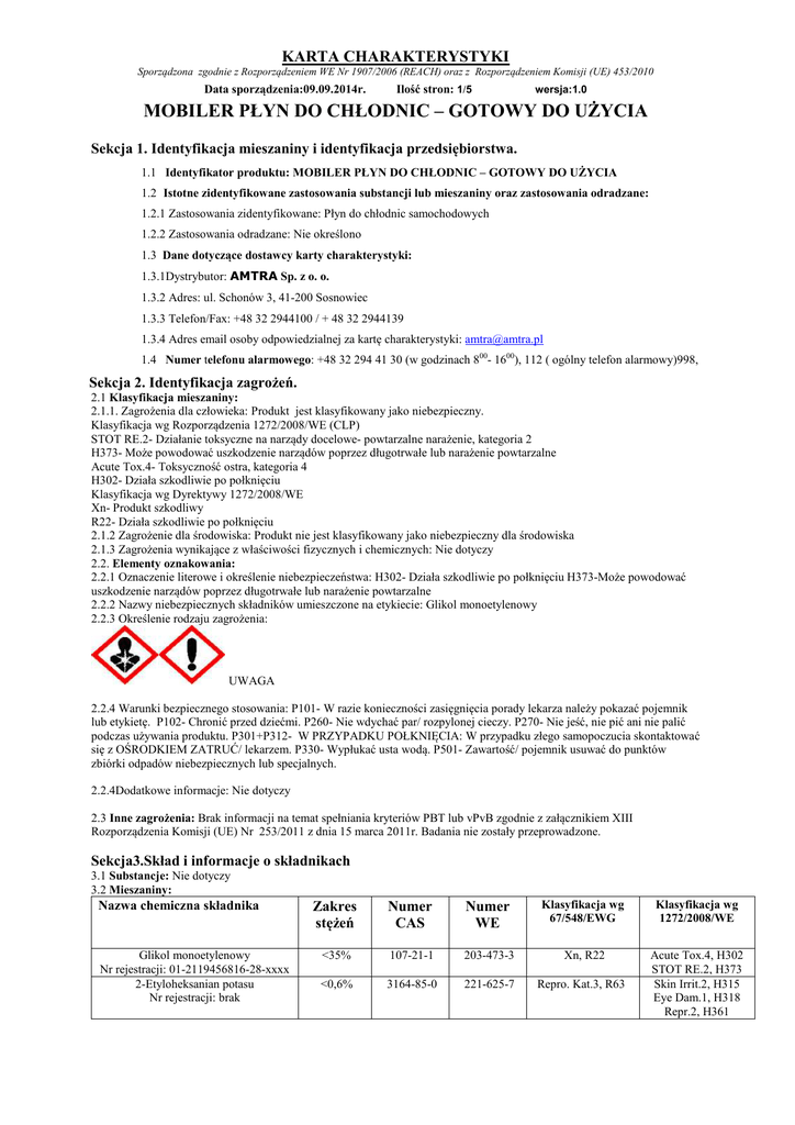 KARTA CHARAKTERYSTYKI Sporządzona zgodnie z Rozporządzeniem WE Nr 1907/2006 (REACH) oraz z Rozporządzeniem Komisji (UE) 453/2010 Data sporządzenia:09.09.2014r. Ilość stron: 1/5 wersja:1.0 MOBILER PŁYN DO CHŁODNIC – GOTOWY DO UŻYCIA Sekcja 1. Identyfikacja mieszaniny i identyfikacja przedsiębiorstwa. 1.1 Identyfikator produktu: MOBILER PŁYN DO CHŁODNIC – GOTOWY DO UŻYCIA 1.2 Istotne zidentyfikowane zastosowania substancji lub mieszaniny oraz zastosowania odradzane: 1.2.1 Zastosowania zidentyfikowane: Płyn do chłodnic samochodowych 1.2.2 Zastosowania odradzane: Nie określono 1.3 Dane dotyczące dostawcy karty charakterystyki: 1.3.1Dystrybutor: AMTRA Sp. z o. o. 1.3.2 Adres: ul. Schonów 3, 41-200 Sosnowiec 1.3.3 Telefon/Fax: +48 32 2944100 / + 48 32 2944139 1.3.4 Adres email osoby odpowiedzialnej za kartę charakterystyki: [email protected] 1.4 Numer telefonu alarmowego: +48 32 294 41 30 (w godzinach 800- 1600), 112 ( ogólny telefon alarmowy)998, Sekcja 2. Identyfikacja zagrożeń. 2.1 Klasyfikacja mieszaniny: 2.1.1. Zagrożenia dla człowieka: Produkt jest klasyfikowany jako niebezpieczny. Klasyfikacja wg Rozporządzenia 1272/2008/WE (CLP) STOT RE.2- Działanie toksyczne na narządy docelowe- powtarzalne narażenie, kategoria 2 H373- Może powodować uszkodzenie narządów poprzez długotrwałe lub narażenie powtarzalne Acute Tox.4- Toksyczność ostra, kategoria 4 H302- Działa szkodliwie po połknięciu Klasyfikacja wg Dyrektywy 1272/2008/WE Xn- Produkt szkodliwy R22- Działa szkodliwie po połknięciu 2.1.2 Zagrożenie dla środowiska: Produkt nie jest klasyfikowany jako niebezpieczny dla środowiska 2.1.3 Zagrożenia wynikające z właściwości fizycznych i chemicznych: Nie dotyczy 2.2. Elementy oznakowania: 2.2.1 Oznaczenie literowe i określenie niebezpieczeństwa: H302- Działa szkodliwie po połknięciu H373-Może powodować uszkodzenie narządów poprzez długotrwałe lub narażenie powtarzalne 2.2.2 Nazwy niebezpiecznych składników umieszczone na etykiecie: Glikol monoetylenowy 2.2.3 Określenie rodzaju zagrożenia: UWAGA 2.2.4 Warunki bezpiecznego stosowania: P101- W razie konieczności zasięgnięcia porady lekarza należy pokazać pojemnik lub etykietę. P102- Chronić przed dziećmi. P260- Nie wdychać par/ rozpylonej cieczy. P270- Nie jeść, nie pić ani nie palić podczas używania produktu. P301+P312- W PRZYPADKU POŁKNIĘCIA: W przypadku złego samopoczucia skontaktować się z OŚRODKIEM ZATRUĆ/ lekarzem. P330- Wypłukać usta wodą. P501- Zawartość/ pojemnik usuwać do punktów zbiórki odpadów niebezpiecznych lub specjalnych. 2.2.4Dodatkowe informacje: Nie dotyczy 2.3 Inne zagrożenia: Brak informacji na temat spełniania kryteriów PBT lub vPvB zgodnie z załącznikiem XIII Rozporządzenia Komisji (UE) Nr 253/2011 z dnia 15 marca 2011r. Badania nie zostały przeprowadzone. Sekcja3.Skład i informacje o składnikach 3.1 Substancje: Nie dotyczy 3.2 Mieszaniny: Nazwa chemiczna składnika Glikol monoetylenowy Nr rejestracji: 01-2119456816-28-xxxx 2-Etyloheksanian potasu Nr rejestracji: brak Zakres stężeń Numer CAS Numer WE Klasyfikacja wg 67/548/EWG Klasyfikacja wg 1272/2008/WE <35% 107-21-1 203-473-3 Xn, R22 <0,6% 3164-85-0 221-625-7 Repro. Kat.3, R63 Acute Tox.4, H302 STOT RE.2, H373 Skin Irrit.2, H315 Eye Dam.1, H318 Repr.2, H361 KARTA CHARAKTERYSTYKI Sporządzona zgodnie z Rozporządzeniem WE Nr 1907/2006 (REACH) oraz z Rozporządzeniem Komisji (UE) 453/2010 Data sporządzenia:09.09.2014r. Ilość stron: 2/5 wersja:1.0 MOBILER PŁYN DO CHŁODNIC – GOTOWY DO UŻYCIA SEKCJA 4. ŚRODKI PIERWSZEJ POMOCY 4.1 Opis środków pierwszej pomocy: 4.1.1 Połknięcie: Nie wywoływać wymiotów. Wypłukać usta wodą. Nigdy nie podawać niczego do ust osobie nieprzytomnej. Wezwać lekarza, pokazać opakowanie lub etykietę. 4.1.2. Zatrucie inhalacyjne: Skonsultować się z lekarzem, w razie wystąpienia niepokojących dolegliwości. Wyprowadzić poszkodowanego na świeże powietrze, zapewnić ciepło i spokój. 4.1.3. Skażenie skóry: Zdjąć skażoną odzież. Narażone partie skóry zmyć dokładnie wodą z mydłem. Skonsultować się z lekarzem w przypadku wystąpienia niepokojących objawów. 4.1.4.Skażenie oczu: Chronić niepodrażnione oko, wyjąć szkła kontaktowe. Zanieczyszczone oczy przepłukać dokładnie wodą przez kilka minut. Unikać silnego strumienia wody – ryzyko uszkodzenia rogówki. Skonsultować się z lekarzem okulistą w przypadku wystąpienia niepokojących objawów. 4.2 Najważniejsze ostre i opóźnione objawy oraz skutki narażenia: 4.2.1 Skażenie oczu: Może wystąpić podrażnienie, zaczerwienienie oraz łzawienie 4.2.2 Połknięcie: Mogą pojawić się mdłości, wymioty, ból głowy, zaburzenia równowagi i koordynacji, senność 4.4.3 Skóra: Może wystąpić zaczerwienienie, wysuszenie i pękanie skóry 4.3 Wskazania dotyczące wszelkiej natychmiastowej pomocy lekarskiej i szczególnego postępowania z poszkodowanym: Podjąć leczenie objawowe. Decyzję o sposobie postępowanie ratunkowego podejmuje lekarz po dokładnej ocenie stanu poszkodowanego. SEKCJA 5. POSTĘPOWANIE W PRZYPADKU POŻARU 5.1 Środki gaśnicze: 5.1.1 Odpowiednie środki gaśnicze: Stosować proszek gaśniczy, CO2, woda-prądy rozproszone, pianę odporną na alkohol 5.1.2 Niewłaściwe środki gaśnicze: Woda- zwarty strumień wody 5.2 Szczególne zagrożenia związane z mieszaniną: Podczas spalania mogą tworzyć się toksyczne spaliny zawierające tlenki węgla. Unikać wdychania produktów spalania, mogą stwarzać zagrożenie dla zdrowia. 5.3 Informacje dla straży pożarnej: Stosować standardowe metody gaszenia pożarów chemicznych. Zbiorniki narażone na działanie wysokiej temperatury chłodzić wodą i w miarę możliwości usunąć z zagrożonego obszaru. Opary alkoholu strącić rozproszonymi strumieniami wody. Strażaków wyposażyć w ubrania odporne na działanie wysokich temperatur. Niezależne aparaty izolujące drogi odd