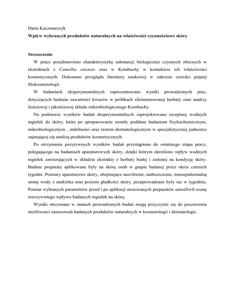 Daria Kaczmarczyk Wpływ wybranych produktów naturalnych na właściwości czynnościowe skóry Streszczenie W pracy przedstawiono charakterystykę substancji biologicznie czynnych obecnych w ekstraktach z Camellia sinensis oraz w Kombuchy w kontekście ich właściwości kosmetycznych. Dokonano przeglądu literatury naukowej w zakresie szeroko pojętej fitokosmetologii. W badaniach eksperymentalnych zaprezentowano wyniki prowadzonych prac, dotyczących badania zawartości kwasów w próbkach sfermentowanej herbaty oraz analizy ilościowej i jakościowej składu mikrobiologicznego Kombuchy. Na podstawie wyników badań eksperymentalnych zaprojektowano recepturę wodnych mgiełek do skóry, które po spreparowaniu zostały poddane badaniom fizykochemicznym, mikrobiologicznym , stabilności oraz testom dermatologicznym w specjalistycznej jednostce zajmującej się analizą produktów kosmetycznych. Po otrzymaniu pozytywnych wyników badań przystąpiono do ostatniego etapu pracy, polegającego na badaniach aparaturowych skóry, dzięki którym określono wpływ wodnych mgiełek zawierających w składzie ekstrakty z herbaty białej i zielonej na kondycję skóry. Badane preparaty aplikowane były na skórę osób w grupie badanej przez okres czterech tygodni. Pomiary aparaturowe skóry, obejmujące nawilżenie, natłuszczenie, transepidermalną utratę wody z naskórka oraz poziom gładkości skóry, przeprowadzane były raz w tygodniu. Pomiar wybranych parametrów przed i po aplikacji stosowanych preparatów umożliwił ocenę rzeczywistego wpływu badanych mgiełek na skórę. Wyniki otrzymane w ramach prowadzonych badań mogą przyczynić się do poszerzenia możliwości zastosowań badanych produktów naturalnych w kosmetologii i dermatologii.