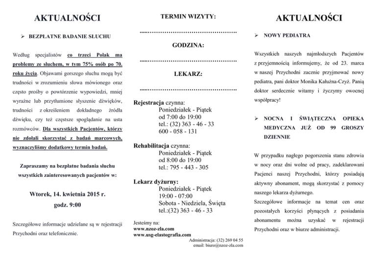 AKTUALNOŚCI TERMIN WIZYTY: .....……………………………………. BEZPŁATNE BADANIE SŁUCHU AKTUALNOŚCI NOWY PEDIATRA GODZINA: Według specjalistów co trzeci Polak ma problemy ze słuchem, w tym 75% osób po 70. roku życia. Objawami gorszego słuchu mogą być trudności w zrozumieniu słowa mówionego oraz często prośby o powtórzenie wypowiedzi, mniej wyraźne lub przytłumione słyszenie dźwięków, trudności z określeniem dokładnego źródła dźwięku, czy też częstsze spoglądanie na usta rozmówców. Dla wszystkich Pacjentów, którzy .....……………………………………. LEKARZ: Zapraszamy na bezpłatne badania słuchu .....……………………………………. Rejestracja czynna: Poniedziałek - Piątek od 7:00 do 19:00 tel.: (32) 363 - 46 - 33 600 - 058 - 131 godz. 9:00 Szczegółowe informacje udzielane są w rejestracji Przychodni oraz telefonicznie. w naszej Przychodni zacznie przyjmować nowy doktor serdecznie witamy i życzymy owocnej współpracy! NOCNA I MEDYCZNA ŚWIĄTECZNA JUŻ OD 99 OPIEKA GROSZY DZIENNIE Rehabilitacja czynna: Poniedziałek - Piątek od 8:00 do 19:00 tel.: 795 - 443 - 305 W przypadku nagłego pogorszenia stanu zdrowia w nocy oraz dni wolne od pracy, zadeklarowani Pacjenci naszej Przychodni, którzy posiadają wszystkich zainteresowanych pacjentów w: Wtorek, 14. kwietnia 2015 r. z przyjemnością informujemy, że od 23. marca pediatra, pani doktor Monika Kałużna-Czyż. Panią nie zdołali skorzystać z badań marcowych, wyznaczyliśmy dodatkowy termin badań. Wszystkich naszych najmłodszych Pacjentów Lekarz dyżurny: Poniedziałek - Piątek 19:00 - 07:00 Sobota - Niedziela, Święta tel.:(32) 363 - 46 - 33 Jesteśmy na: www.nzoz-zla.com www.usg-elastografia.com Administracja: (32) 269 04 55 email: [email protected] aktywny abonament, mogą skorzystać z pomocy naszego lekarza dyżurnego. Szczegółowe informacje na temat cen oraz pozostałych korzyści płynących z posiadania abonamentu można uzyskać w Przychodni oraz w biurze administracji. rejestracji AKTUALNOŚCI SPECJALISTYKA BADANIE OSTEOPOROZY Osteoporoza jest chorobą podstępną. Rozwija się przez wiele lat, a we wczesnej fazie choroby często nie pojawiają się żadne objawy. Podwyższone ryzyko wystąpienia osteoporozy dotyczy m.in. ludzi po 65. roku życia, o szczupłej budowie ciała, przebyte złamania po 40. roku życia, płeć żeńska (częściej chorują kobiety), siedzący tryb życia, uwarunkowania genetyczne, wczesna menopauza, zła dieta, używki: papierosy, alkohol, duże ilości kawy. PRACOWANIA BADAŃ USG CHIRURG ORTOPEDA DIABETOLOG GASTROLOG HEPATOLOG OTOLARYNGOLOG NEUROLOG REUMATOLOG REHABILITACJA INTERNISTA NOCNA I ŚWIĄTECZNA OPIEKA MEDYCZNA PRZYCHODNIA POGOŃ OPIEKA MEDYCZNA dla Ciebie i Twojej Rodziny Lekarze rodzinni i specjaliści Zapraszamy na badanie osteoporozy Nocna i świąteczna opieka medyczna dla pacjentów z abonamentem. w specjalnym Osteobusie na tylnym parkingu Przychodni w: Pracownia USG Poniedziałek, 27. kwietnia godziny: 8:00-12:30 Realizujemy usługi POZ (LEKARZ RODZINNY, PEDIATRA, cena: 40 zł Zapraszamy do zapisywania się na badania. PIELEGNIARKA) w ramach umowy z NFZ Więcej informacji w rejestracji Przychodni, na plakatach oraz w specjalnych ulotkach. Dołącz do nas na FACEBOOKu! Holtery EKG i RR Badania laboratoryjne Masaż, fizykoterapia, ćwiczenia Pracownia endoskopii NZOZ ZLA Przychodnia „Pogoń” Sp. z o.o. 41-200 Sosnowiec ul. Grota Roweckiego 37