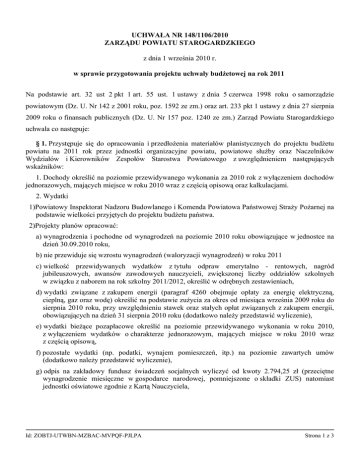 UCHWAŁA NR 148/1106/2010 ZARZĄDU POWIATU STAROGARDZKIEGO z dnia 1 września 2010 r. w sprawie przygotowania projektu uchwały budżetowej na rok 2011 Na podstawie art. 32 ust 2 pkt 1 art. 55 ust. 1 ustawy z dnia 5 czerwca 1998 roku o samorządzie powiatowym (Dz. U. Nr 142 z 2001 roku, poz. 1592 ze zm.) oraz art. 233 pkt 1 ustawy z dnia 27 sierpnia 2009 roku o finansach publicznych (Dz. U. Nr 157 poz. 1240 ze zm.) Zarząd Powiatu Starogardzkiego uchwala co następuje: § 1. Przystępuje się do opracowania i przedłożenia materiałów planistycznych do projektu budżetu powiatu na 2011 rok przez jednostki organizacyjne powiatu, powiatowe służby oraz Naczelników Wydziałów i Kierowników Zespołów Starostwa Powiatowego z uwzględnieniem następujących wskaźników: 1. Dochody określić na poziomie przewidywanego wykonania za 2010 rok z wyłączeniem dochodów jednorazowych, mających miejsce w roku 2010 wraz z częścią opisową oraz kalkulacjami. 2. Wydatki 1)Powiatowy Inspektorat Nadzoru Budowlanego i Komenda Powiatowa Państwowej Straży Pożarnej na podstawie wielkości przyjętych do projektu budżetu państwa. 2)Projekty planów opracować: a) wynagrodzenia i pochodne od wynagrodzeń na poziomie 2010 roku obowiązujące w jednostce na dzień 30.09.2010 roku, b) nie przewiduje się wzrostu wynagrodzeń (waloryzacji wynagrodzeń) w roku 2011 c) wielkość przewidywanych wydatków z tytułu odpraw emerytalno - rentowych, nagród jubileuszowych, awansów zawodowych nauczycieli, zwiększonej liczby oddziałów szkolnych w związku z naborem na rok szkolny 2011/2012, określić w odrębnych zestawieniach, d) wydatki związane z zakupem energii (paragraf 4260 obejmuje opłaty za energię elektryczną, cieplną, gaz oraz wodę) określić na podstawie zużycia za okres od miesiąca września 2009 roku do sierpnia 2010 roku, przy uwzględnieniu stawek oraz stałych opłat związanych z zakupem energii, obowiązujących na dzień 31 sierpnia 2010 roku (dodatkowo należy przedstawić wyliczenie), e) wydatki bieżące pozapłacowe określić na poziomie przewidywanego wykonania w roku 2010, z wyłączeniem wydatków o charakterze jednorazowym, mających miejsce w roku 2010 wraz z częścią opisową, f) pozostałe wydatki (np. podatki, wynajem pomieszczeń, itp.) na poziomie zawartych umów (dodatkowo należy przedstawić wyliczenie), g) odpis na zakładowy fundusz świadczeń socjalnych wyliczyć od kwoty 2.794,25 zł (przeciętne wynagrodzenie miesięczne w gospodarce narodowej, pomniejszone o składki ZUS) natomiast jednostki oświatowe zgodnie z Kartą Nauczyciela, Id: ZOBTJ-UTWBN-MZBAC-MVPQF-PJLPA Strona 1 z 3 3. Jednostki organizacyjne sporządzają odrębnie plan wydatków majątkowych oraz plan wydatków remontowych. Wydatki na remonty określić w wysokości niezbędnej do poniesienia w 2011 roku.Wydatki majątkowe powinny uwzględniać wszystkie koszty związane z inwestycją (np. zakup i montaż maszyn i urządzeń, zużycie materiałów oraz koszty ich dostawy, załadunku, roboty budowlanomontażowe, instalacyjne, wykończeniowe, wynagrodzenia bezosobowe oraz pochodne od tych wynagrodzeń, podatek od towarów i usług niepodlegający odliczeniu, opłaty skarbowe i notarialne dotyczące poszczególnych obiektów inwestycyjnych, próby montażowe i rozruch, jeżeli są dokonywane przed przekazaniem do używania, opracowanie dokumentacji projektowo-kosztorysowej, nadzór autorski i inwestorski, przygotowanie terenu pod budowę, przygotowanie tymczasowego zaplecza na potrzeby budowy, ubezpieczenie placu budowy, koszty transportu). § 2. 1. Zobowiązuje się dyrektorów, kierowników, naczelników wydziałów do złożenia w terminie do 8 października 2010 roku szczegółowych preliminarzy dochodów i wydatków. Preliminarze te należy składać : 1)jednostki oświaty w dwóch egzemplarzach (jeden egzemplarz do Wydziału Edukacji, jeden egzemplarz do Skarbnika Powiatu) Wydział Edukacji analizuje poszczególne preliminarze, sporządza zestawienie zbiorcze i przekazuje je do Skarbnika Powiatu do 15 października 2010 roku. 2)Domy Pomocy Społecznej w dwóch egzemplarzach do 8 października 2010 roku: (jeden egzemplarz do Powiatowego Centrum Pomocy Rodzinie, który analizuje i sporządza zestawienia zbiorcze i przekazuje je do Skarbnika Powiatu do 15 października 2010 roku) Zbiorczy plan finansowy Domów Pomocy Społecznej nie może przekraczać wielkości prognozowanych wpływów z tytułu odpłatności pensjonariuszy oraz wielkości dotacji. 3)pozostałe jednostki (jeden egzemplarz do Skarbnika Powiatu) 4)Naczelnicy Wydziałów (jeden egzemplarz do Sekretarza Powiatu, jeden egzemplarz do Głównego Księgowego Starostwa Powiatowego) 2. Opracowany preliminarz powinien zawierać: 1)rodzaj dochodów, 2)rodzaj wydatków 3)dział, rozdział, paragraf klasyfikacji budżetowej, 4)plan na dzień 30 września 2010 rok, 5)przewidywane wykonanie za 2010 rok nie przekraczające wielkości ustalonego planu, 6)projekt na 2011 rok, 7)wskaźnik procentowy (pkt 6 : pkt 5), 8)część opisową wraz z kalkulacjami w zakresie planu dochodów i wydatków § 3. Zgodnie z art. 226 ustawy o finansach publicznych zobowiązuje się kierowników jednostek do sporządzenia realistycznych planów finansowych na rok 2011 oraz na kolejne 3 lata (tj. rok 2012, 2013, 2014) Id: ZOBTJ-UTWBN-MZBAC-MVPQF-PJLPA Strona 2 z 3 § 4. W terminie do dnia 31 października 2010 roku Zarząd Powiatu Starogardzkiego przeprowadzi analizę przedłożonych materiałów i ustali ostateczną wielkość planowanych dochodów oraz wstępnych kwot wydatków dla poszczególnych działów i rozdziałów klasyfikacji budżetowej dotyczących projektu budżetu na 2011 rok. § 5. Uchwała wchodzi w życie z dniem podjęcia. Przewodniczący Zarządu Leszek Burczyk Id: ZOBTJ-UTWBN-MZBAC-MVPQF-PJLPA Strona 3 z 3