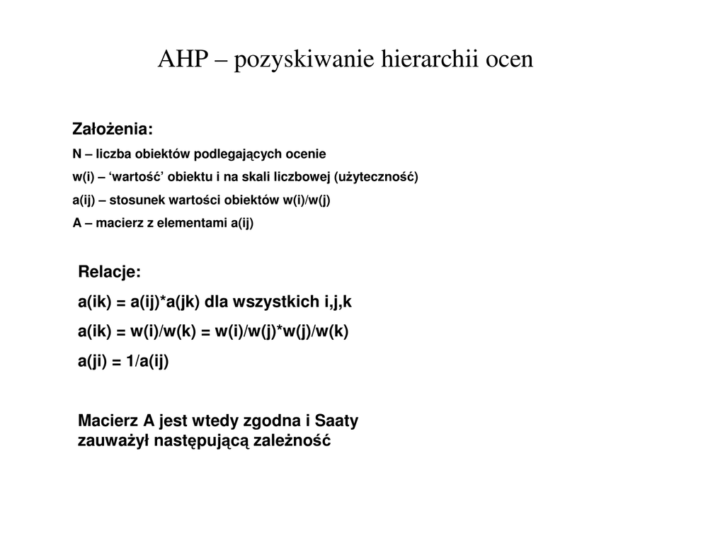 AHP – pozyskiwanie hierarchii ocen Zało enia: N – liczba obiektów podlegaj cych ocenie w(i) – ‘warto ’ obiektu i na skali liczbowej (u yteczno a(ij) – stosunek warto ci obiektów w(i)/w(j) A – macierz z elementami a(ij) Relacje: a(ik) = a(ij)*a(jk) dla wszystkich i,j,k a(ik) = w(i)/w(k) = w(i)/w(j)*w(j)/w(k) a(ji) = 1/a(ij) Macierz A jest wtedy zgodna i Saaty zauwa ył nast puj c zale no ) AHP – cd. Macierz A wektor w wynik w(1)/w(1) w(1)/w(2) w(1)/w(3) ... w(1)/w(n) w(1) w(1) w(2)/w(1) w(2)/w(2) w(2)/w(3) ... w(2)/w(n) w(2) w(2) ... w(n)/w(1) w(n)/w(2) w(n)/w(3) ... X w(n)/w(n) ... = n* w(n) Aw = nw – w zapisie macierzowym definicja ‘wektora własnego’ macierzy A w – wektor własny macierzy A zwi zany z warto ci własn równ n ... w(n) AHP – cd. W praktyce w(i) nie s znane – metoda ankietowa pozwala uzyska oszcowania subiektywne a(ij) = w(i)/w(j) - czyli macierz A – poniewa ludzie nie musz by konsekwentni to A nie spełnia zwykle wcze niej pokazanych zale no ci. Mo na jednak si spodziewa , e wektor własny zwi zany z maksymaln warto ci własn (wszystkich warto ci własnych mo e by n) dobrze przybli a hierarchi ocen w(i) poniewa prawdziwe s 2 fakty (twierdzenia): 1. Je li Ax = Lx i istnieje n liczb L(1) ... L(n) spełniajacych to równanie oraz a(ii) = 1 dla wszystkich i to Suma L(i) = n. Poniewa w idealnym przypadku zgodnej macierzy Lmax = n wi c pozostałe L=0. 2. Małe zmiany a(ij) powoduj niewielkie zmiany w wektorze własnym w. Maj c zatem macierz porówna parami A znalezienie hierarchii priorytetów sprowadza si do znalezienia wektora w który spełnia równanie Aw = Lmax*w Odchylenie Lmax od n mo e by miernikiem zgodno ci ocen w macierzy A Wska nik zgodno ci = (Lmax - n) / (n-1). Praktycznie powinien by mniejszy od 0.1 AHP – praktyczne wyznaczanie hierarchii 1. Programy matematyczne (MathLab, Mathematica) oferuj algorytmy znajduj ce wektory i warto ci własne 2. Przybli one rozwi zania Saaty’ego – do zaimplementowania w Exelu: PROCEDURA: Wej cie – macierz A A*A A*A*A ... SumaWierszy(a(ij)) SumaWierszy(a(ij)) normalizacja (Suma w(j) = 1) normalizacja (Suma w(j) = 1) je li mała zmiana w stosunku do poprzedniego stanu to koniec je li mała zmiana w stosunku do poprzedniego stanu to koniec AHP- ocena zgodno ci macierzy A Je li wyznacza si wektor w metod przybli on to brakuje wielko ci Lmax – maksymalnej warto ci własnej potrzebnej do obliczenia wska nika zgodno ci WZ = (Lmax - n) / (n-1). Poniewa zachodzi równo : Aw = Lmax*w a suma w(j) = 1 to Suma el wektora Aw = Lmax*suma(w(j)) = Lmax.