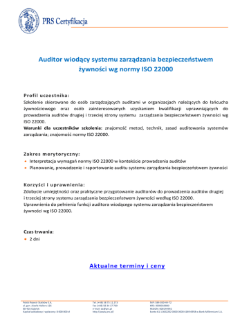 Auditor wiodący systemu zarządzania bezpieczeostwem żywności wg normy ISO 22000 Profil uczestnika: Szkolenie skierowane do osób zarządzających auditami w organizacjach należących do łaocucha żywnościowego oraz osób zainteresowanych uzyskaniem kwalifikacji uprawniających do prowadzenia auditów drugiej i trzeciej strony systemu zarządzania bezpieczeostwem żywności wg ISO 22000. Warunki dla uczestników szkolenia: znajomośd metod, technik, zasad auditowania systemów zarządzania; znajomośd normy ISO 22000. Zakres merytoryczny: Interpretacja wymagao normy ISO 22000 w kontekście prowadzenia auditów Planowanie, prowadzenie i raportowanie auditu systemu zarządzania bezpieczeostwem żywności Korzyści i uprawnienia: Zdobycie umiejętności oraz praktyczne przygotowanie auditorów do prowadzenia auditów drugiej i trzeciej strony systemu zarządzania bezpieczeostwem żywności według ISO 22000. Uprawnienia do pełnienia funkcji auditora wiodącego systemu zarządzania bezpieczeostwem żywności wg ISO 22000. Czas trwania: 2 dni Aktualne terminy i ceny Polski Rejestr Statków S.A. al. gen. Józefa Hallera 126 80-416 Gdaosk Kapitał zakładowy i wpłacony: 8 000 000 zł Tel. (+48) 58 75 11 273 Fax (+48) 58 34 17 769 e-mail: [email protected] http://www.prs.pl/ NIP: 584-030-44-72 KRS: 0000019880 REGON: 000144992 konto 61 11602202 0000 0000 6189 6958 w Bank Millennium S.A.