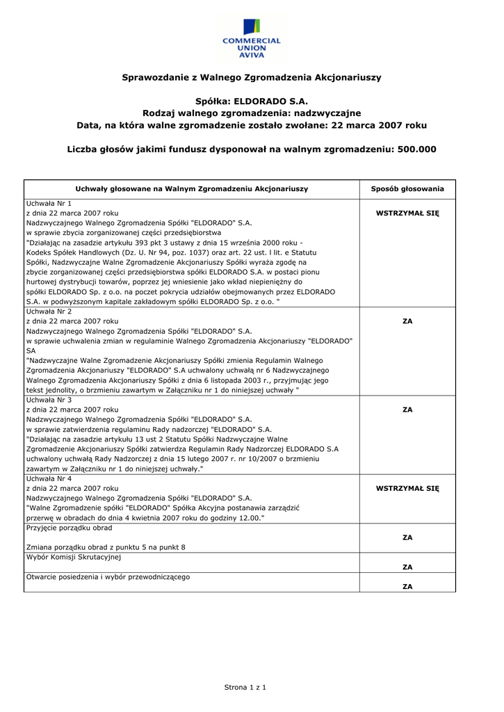 Sprawozdanie z Walnego Zgromadzenia Akcjonariuszy Spółka: ELDORADO S.A. Rodzaj walnego zgromadzenia: nadzwyczajne Data, na która walne zgromadzenie zostało zwołane: 22 marca 2007 roku Liczba głosów jakimi fundusz dysponował na walnym zgromadzeniu: 500.000 Uchwały głosowane na Walnym Zgromadzeniu Akcjonariuszy Uchwała Nr 1 z dnia 22 marca 2007 roku Nadzwyczajnego Walnego Zgromadzenia Spółki "ELDORADO" S.A. w sprawie zbycia zorganizowanej części przedsiębiorstwa "Działając na zasadzie artykułu 393 pkt 3 ustawy z dnia 15 września 2000 roku Kodeks Spółek Handlowych (Dz. U. Nr 94, poz. 1037) oraz art. 22 ust. l lit. e Statutu Spółki, Nadzwyczajne Walne Zgromadzenie Akcjonariuszy Spółki wyraża zgodę na zbycie zorganizowanej części przedsiębiorstwa spółki ELDORADO S.A. w postaci pionu hurtowej dystrybucji towarów, poprzez jej wniesienie jako wkład niepieniężny do spółki ELDORADO Sp. z o.o. na poczet pokrycia udziałów obejmowanych przez ELDORADO S.A. w podwyższonym kapitale zakładowym spółki ELDORADO Sp. z o.o. " Uchwała Nr 2 z dnia 22 marca 2007 roku Nadzwyczajnego Walnego Zgromadzenia Spółki "ELDORADO" S.A. w sprawie uchwalenia zmian w regulaminie Walnego Zgromadzenia Akcjonariuszy "ELDORADO" SA "Nadzwyczajne Walne Zgromadzenie Akcjonariuszy Spółki zmienia Regulamin Walnego Zgromadzenia Akcjonariuszy "ELDORADO" S.A uchwalony uchwałą nr 6 Nadzwyczajnego Walnego Zgromadzenia Akcjonariuszy Spółki z dnia 6 listopada 2003 r., przyjmując jego tekst jednolity, o brzmieniu zawartym w Załączniku nr 1 do niniejszej uchwały " Uchwała Nr 3 z dnia 22 marca 2007 roku Nadzwyczajnego Walnego Zgromadzenia Spółki "ELDORADO" S.A. w sprawie zatwierdzenia regulaminu Rady nadzorczej "ELDORADO" S.A. "Działając na zasadzie artykułu 13 ust 2 Statutu Spółki Nadzwyczajne Walne Zgromadzenie Akcjonariuszy Spółki zatwierdza Regulamin Rady Nadzorczej ELDORADO S.A uchwalony uchwałą Rady Nadzorczej z dnia 15 lutego 2007 r. nr 10/2007 o brzmieniu zawartym w Załączniku nr 1 do niniejszej uchwały." Uchwała Nr 4 z dnia 22 marca 2007 roku Nadzwyczajnego Walnego Zgromadzenia Spółki "ELDORADO" S.A. "Walne Zgromadzenie spółki "ELDORADO" Spółka Akcyjna postanawia zarządzić przerwę w obradach do dnia 4 kwietnia 2007 roku do godziny 12.00." Przyjęcie porządku obrad Sposób głosowania WSTRZYMAŁ SIĘ ZA ZA WSTRZYMAŁ SIĘ ZA Zmiana porządku obrad z punktu 5 na punkt 8 Wybór Komisji Skrutacyjnej ZA Otwarcie posiedzenia i wybór przewodniczącego ZA Strona 1 z 1