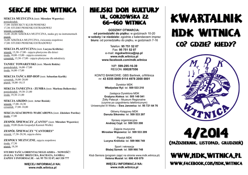 SEKCJE MDK WITNICA SEKCJA MUZYCZNA (instr. Mirosław Wąsowicz) poniedziałek: 17,00: DZIECIĘCY KLUB PIOSENKI 17,30: STUDIO PIOSENKI ESTRADOWEJ wtorek i czwartek: 14,40–20,00: SZKÓŁKA MUZYCZNA, nauka gry na instrumentach piątek: 16,00: SZKÓŁKA MUZYCZNA, ćwiczenia zespołowe 17,00: STUDIO PIOSENKI ESTRADOWEJ SEKCJA PLASTYCZNA (instr. Lucyna Królicka) wtorek: 15,30–17,00 - zajęcia plastyczne dla dzieci środa: 10,00–15,00 - zajęcia ceramiczne czwartek: 15,30–17,00 - zajęcia plastyczne dla młodzieży TANIEC TOWARZYSKI (instr. Marek Rokita) poniedziałek: 16,00–17,00 środa: 16,00–17,00 SEKCJA TAŃCA HIP-HOP (instr. Sebastian Karlik) czwartek: 18,00–20,00 piątek: 16,00–18,15 SEKCJA TANECZNA - ZUMBA (instr. Marlena Dzikowska) poniedziałek: 19,30–21,00 środa: 19,30–21,00 SEKCJA AIKIDO (instr. Artur Rosiak) wtorek: 17,00–18,30 czwartek: 17,00–18,00 SEKCJA SZACHOWO–WARCABOWA (instr. Zdzisław Pawlisz) środa: 17,00 ZESPÓŁ ŚPIEWACZY „CANTO” (instr. Mirosław Wąsowicz) środa: 19,00 (Koło Gospodyń Kamień Wielki) ZESPÓŁ ŚPIEWACZY "CANTORES" wtorek: 17,30–20,30, zajęcia chóru ZESPOŁY MUZYCZNE, zajęcia zespołowe środa: 17,30 piątek: 18,30 STUDIO TAŃCA ORIENTALNEGO AISHA – NOWOŚĆ! (SALSA, TANIEC BRZUCHA, BACHATA, SAMBA) ZAPISY I INFORMACJE – tel. 95 751 52 07, 663 320 777 WIĘCEJ INFORMACJI NA: www.mdk.witnica.pl MIEJSKI DOM KULTURY ul. Gorzowska 22 66-460 Witnica GODZINY OTWARCIA: od poniedziałki do piątku: w godzinach 10-20 w soboty i w niedziele: zgodnie z kalendarzem imprez biuro: od poniedziałku do piątku, w godzinach 7-16 Telefon: 95 751 52 07 Fax: 95 751 52 07 e-mail: [email protected] www.mdk.witnica.pl www.facebook.com/mdk.witnica KWARTALNIK MDK WITNICA CO? Gdzie? Kiedy? NIP: 599-295-16-39 REGON: 000287556 KONTO BANKOWE: GBS Barlinek, o/Witnica nr: 43 8355 0009 0114 4978 2000 0001 Dyrektor MDK Władysław Ryl: tel. 509 533 210 Zastępca Dyrektora MDK Grażyna Aloksa: tel. 505 149 541 Żółty Pałacyk – Muzeum Regionalne (czynne po uzgodnieniu telefonicznym) Uniwersytet III Wieku – Ewa Janowicz: tel. 95 721 64 76 Główny Księgowy MDK Danuta Sikorska: tel. 509 533 207 Sprawy organizacyjne Andrzej Czyż: tel. 509 533 208 Zajęcia muzyczne Mirosław Wąsowicz: tel. 509 533 209 Plastyk MDK Lucyna Królicka: tel. 509 966 749 Sport i rekreacja Błażej Szmek: tel. 509 966 748 Klub Seniora (program zajęć na stronie www.mdk.witnica.pl) Helena Musiał: tel. 606 430 079 WIĘCEJ INFORMACJI NA: www.mdk.witnica.pl 4/2014 (Październik, LISTOPAD, GRUDZIEŃ) www.mdk.witnica.pl www.facebook.com/mdk.witnica KALENDARZ IMPREZ IV KWARTAŁ 2014 KALENDARZ IMPREZ IV KWARTAŁ 2014 KALENDARZ IMPREZ IV KWARTAŁ 2014 28.09.2014r.: 10.10.2014r.: 07.11.2014r.: „Pożegnaj Lato z Nami” - festyn rekreacyjny Powiatowy Przegląd Twórczości Seniorów (MDK Witnica, godz. 15:00) Uroczysta Sesja Rady Miasta z okazji Święta Niepodległości (RCR Witnica, godz. 14:00) (Amfiteatr w Parku Drogowskazów, godz. 15:30-19:00) 10.10.2014r.: „Znak Pokoju” – widowisko słowno-muzyczne zespół De Profundis i Edward Linde-Lubaszenko (RCR Witnica, godz. 18:30) 21.11.2014r.: Powiatowy Przegląd Pieśni Patriotycznej (MDK Witnica, godz. 16:00) 22.11.2014r.: XIII Młodzieżowy Turniej Piłki Halowej o Puchar Burmistrza MiG Witnica (hala sportowa gimnazjum, godz. 10:00) 27.11.2014r.: Andrzejkowe Spotkania z Kulturą Cygańską (Papusza, cygańskie wróżby, Edward Dębicki) (RCR Witnica, godz. 18:00) 06.12.2014r.: Mikołajkowy Turniej Piłki Halowej (hala sportowa gimnazjum, godz. 10:00) 12.12.2014r.: Jakub Michalski – recital ballady Leonarda Cohena i pieśni Jacka Kaczmarskiego (RCR Witnica, godz. 18:30) 13.12.2014r.: 03.10.2014r.: „Zostań Świętym Mikołajem” – koncert (szczegóły na plakatach w terminie późniejszym) „Niemcy okiem polskich i niemieckich fotografików” - otwarcie wystawy fotograficznej „Ale ścieżki pozostały te same” - promocja książki o Charlottenhof Sosny Koncert Fortepianowy (Żółty Pałacyk, godz. 17:00) „Bez Sensu” koncert zespołu dla witnickich uczniów (MDK Witnica, godz. 12:30) 05.10.2014r.: 05.11.2014r.: 22.10.2014r.: Spotkanie Burmistrza MiG Witnica z mieszkańcami Dąbroszyna (Plac przed Pałacem w Dąbroszynie, godz. 16:00) „Przywróćmy Pamięć” - spacer witnickim szlakiem kultury żydowskiej (Żółty Pałacyk, godz. 18:00) WIĘCEJ O KONCERTACH NA: www.mdk.witnica.pl WIĘCEJ O KONCERTACH NA: www.mdk.witnica.pl 31.12.2014r.: Bal Sylwestrowy (RCR Witnica, godz. 20:00) PONADTO W KAŻDYM MIESIĄCU Kameralne imprezy w Żółtym Pałacyku Filmowe Czwartki i Bajkowe Niedziele w RCR WIĘCEJ INFORMACJI NA: www.mdk.witnica.pl oraz na PLAKATACH MDK