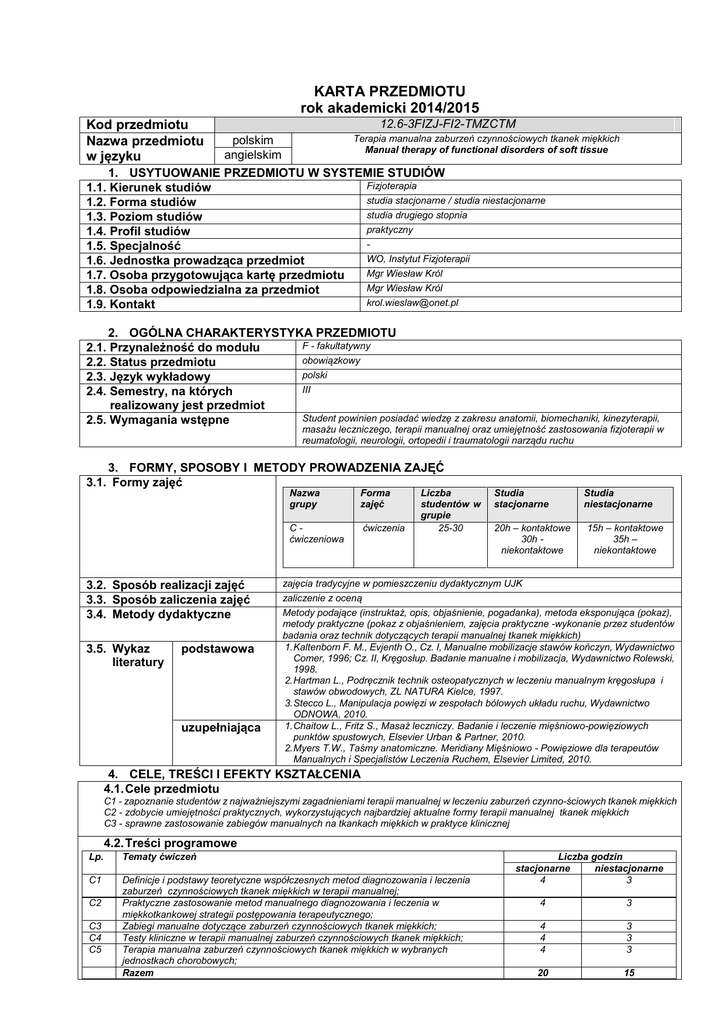 KARTA PRZEDMIOTU rok akademicki 2014/2015 12.6-3FIZJ-FI2-TMZCTM Terapia manualna zaburzeń czynnościowych tkanek miękkich polskim Manual therapy of functional disorders of soft tissue angielskim 1. USYTUOWANIE PRZEDMIOTU W SYSTEMIE STUDIÓW Fizjoterapia 1.1. Kierunek studiów studia stacjonarne / studia niestacjonarne 1.2. Forma studiów studia drugiego stopnia 1.3. Poziom studiów praktyczny 1.4. Profil studiów 1.5. Specjalność WO, Instytut Fizjoterapii 1.6. Jednostka prowadząca przedmiot Mgr Wiesław Król 1.7. Osoba przygotowująca kartę przedmiotu Mgr Wiesław Król 1.8. Osoba odpowiedzialna za przedmiot [email protected] 1.9. Kontakt Kod przedmiotu Nazwa przedmiotu w języku 2. OGÓLNA CHARAKTERYSTYKA PRZEDMIOTU F - fakultatywny 2.1. Przynależność do modułu obowiązkowy 2.2. Status przedmiotu polski 2.3. Język wykładowy III 2.4. Semestry, na których realizowany jest przedmiot Student powinien posiadać wiedzę z zakresu anatomii, biomechaniki, kinezyterapii, 2.5. Wymagania wstępne masażu leczniczego, terapii manualnej oraz umiejętność zastosowania fizjoterapii w reumatologii, neurologii, ortopedii i traumatologii narządu ruchu 3. FORMY, SPOSOBY I METODY PROWADZENIA ZAJĘĆ 3.1. Formy zajęć 3.2. Sposób realizacji zajęć 3.3. Sposób zaliczenia zajęć 3.4. Metody dydaktyczne 3.5. Wykaz literatury podstawowa uzupełniająca Nazwa grupy Forma zajęć Cćwiczeniowa ćwiczenia Liczba studentów w grupie 25-30 Studia stacjonarne 20h – kontaktowe 30h niekontaktowe Studia niestacjonarne 15h – kontaktowe 35h – niekontaktowe zajęcia tradycyjne w pomieszczeniu dydaktycznym UJK zaliczenie z oceną Metody podające (instruktaż, opis, objaśnienie, pogadanka), metoda eksponująca (pokaz), metody praktyczne (pokaz z objaśnieniem, zajęcia praktyczne -wykonanie przez studentów badania oraz technik dotyczących terapii manualnej tkanek miękkich) 1. Kaltenborn F. M., Evjenth O., Cz. I, Manualne mobilizacje stawów kończyn, Wydawnictwo Comer, 1996; Cz. II, Kręgosłup. Badanie manualne i mobilizacja, Wydawnictwo Rolewski, 1998. 2. Hartman L., Podręcznik technik osteopatycznych w leczeniu manualnym kręgosłupa i stawów obwodowych, ZL NATURA Kielce, 1997. 3. Stecco L., Manipulacja powięzi w zespołach bólowych układu ruchu, Wydawnictwo ODNOWA, 2010. 1. Chaitow L., Fritz S., Masaż leczniczy. Badanie i leczenie mięśniowo-powięziowych punktów spustowych, Elsevier Urban & Partner, 2010. 2. Myers T.W., Taśmy anatomiczne. Meridiany Mięśniowo - Powięziowe dla terapeutów Manualnych i Specjalistów Leczenia Ruchem, Elsevier Limited, 2010. 4. CELE, TREŚCI I EFEKTY KSZTAŁCENIA 4.1. Cele przedmiotu C1 - zapoznanie studentów z najważniejszymi zagadnieniami terapii manualnej w leczeniu zaburzeń czynno-ściowych tkanek miękkich C2 - zdobycie umiejętności praktycznych, wykorzystujących najbardziej aktualne formy terapii manualnej tkanek miękkich C3 - sprawne zastosowanie zabiegów manualnych na tkankach miękkich w praktyce klinicznej 4.2. Treści programowe Lp. Tematy ćwiczeń C1 Definicje i podstawy teoretyczne współczesnych metod diagnozowania i leczenia zaburzeń czynnościowych tkanek miękkich w terapii manualnej; Praktyczne zastosowanie metod manualnego diagnozowania i leczenia w miękkotkankowej strategii postępowania terapeutycznego; Zabiegi manualne dotyczące zaburzeń czynnościowych tkanek miękkich; Testy kliniczne w terapii manualnej zaburzeń czynnościowych tkanek miękkich; Terapia manualna zaburzeń czynnościowych tkanek miękkich w wybranych jednostkach chorobowych; Razem C2 C3 C4 C5 Liczba godzin stacjonarne niestacjonarne 4 3 4 3 4 4 4 3 3 3 20 15 kod 4.3. Przedmiotowe efekty kształcenia (mała, średnia, duża liczba efektów) Student, który zaliczył przedmiot Stopień nasycenia efektu przedmiotowe go 1 [+] [++] [+++] Kod dla kierunku w zakresie WIEDZY: W01 Potrafi zdefiniować i scharakteryzować zaburzenia czynnościowe tkanek miękkich oraz wymienić podstawowe metody diagnozowania w terapii manualnej tkanek miękkich W02 Potrafi dobrać odpowiednie techniki terapii zaburzeń czynnościowych tkanek miękkich do wybranych jednostek chorobowych w zakresie UMIEJĘTNOŚCI: U01 Potrafi przeprowadzić testy diagnostyczne i wykonać wybrane techniki manualne dla zaburzeń czynnościowych tkanek miękkich U02 Potrafi przeprowadzić diagnostykę i wnioskowanie kliniczne oraz zaplanować strategię i taktykę dotyczącą terapii zaburzeń czynnościowych tkanek miękkich w wybranych jednostkach chorobowych w zakresie KOMPETENCJI SPOŁECZNYCH: K01 Potrafi zaprezentować inne, uznane techniki terapii zaburzeń czynnościowych tkanek miękkich w oparciu o podaną literaturę uzupełniającą Odniesienie do efektów kształcenia FIZJ2P_W06 +++ FIZJ2P_W16 +++ FIZJ2P_U10 +++ FIZJ2P_U25 ++ FIZJ2P_K02 +++ dla obszaru OM2_W03 potrafi wymienić i scharakteryzować tzw. specjalne metody fizjoterapii, tj.: metody reedukacji posturalnej, reedukacji nerwowo-mięśniowej, neurorehabilitacji, terapii neurorozwojowej oraz terapii manualnej OM2_W05 potrafi analizować patogenezę, objawy kliniczne i przebieg określonych jednostek chorobowych, w aspekcie doboru optymalnych technik i racjonalnego stosowania środków fizjoterapii OM2_U02 potrafi prezentować i zastosować elementy metod specjalnych wykorzystywanych w fizjoterapii: metod reedukacji posturalnej, reedukacji nerwowo- mięśniowej, neurorehabilitacji, terapii neurorozwojowej oraz terapii manualnej potrafi tworzyć, weryfikować i OM2_W08 modyfikować program usprawniania osób z różnymi dysfunkcjami narządu ruchu i innych narządów oraz układów, stosownie do ich stanu klinicznego i funkcjonalnego, wykorzystując wiedzę zakresu diagnostyki funkcjonalnej oraz metodycznych podstaw fizjoterapii wykazuje umiejętność i nawyk OM2_K01 samokształcenia przez całe życie w celu rozszerzenia kompetencji i utrzymania statusu fizjoterapeuty 4.4. Kryteria oceny osiągniętych efektów kształce