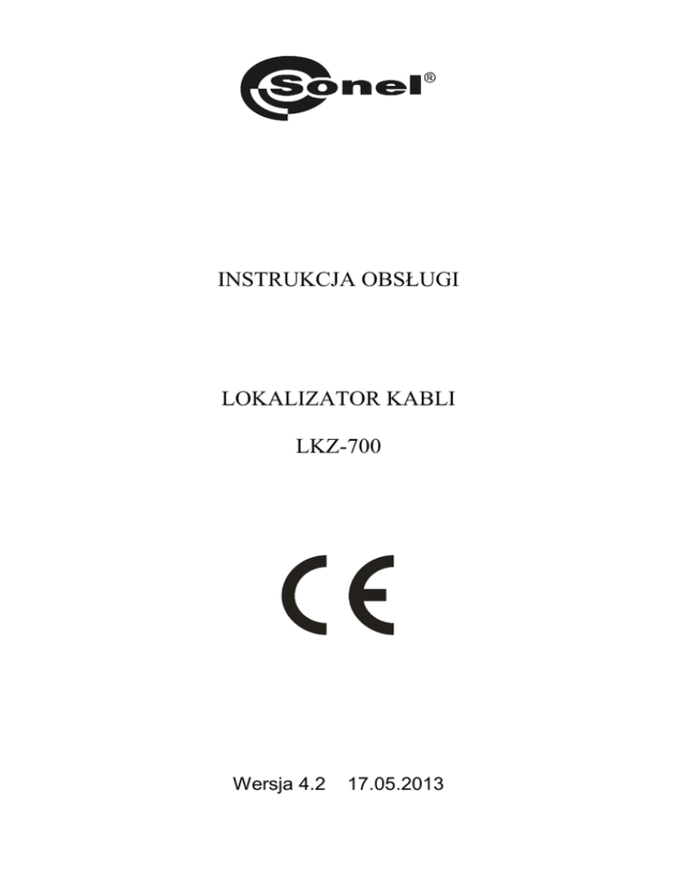 INSTRUKCJA OBSŁUGI LOKALIZATOR KABLI LKZ-700 Wersja 4.2 17.05.2013 Lokalizator LKZ-700 przeznaczony jest głównie do wykrywania przewodów w obiektach budowlanych w różnych środowiskach (beton, cegła, drewno). Może być również przydatny do wykrywania kabli podziemnych. Możliwe jest wykrywanie kabli i przewodów zarówno będących pod napięciem, bez potrzeby odłączania jakichkolwiek urządzeń od badanej sieci, jak i pozbawionych napięcia. Najważniejsze cechy lokalizatora: • • • • • • • • 2 wykrywanie przewodów w sufitach, ścianach i podłogach lokalizowanie przerw w przewodach, wyłączników i bezpieczników lokalizowanie tras zwartych obwodów lokalizowanie uszkodzeń przewodów uziemiających w instalacji trójfazowej wykrywanie zwężeń w rurkach kablowych śledzenie przebiegu kabli podziemnych do głębokości 2m (w trybie „mocowym”) śledzenie przebiegu przewodzących rur instalacji wodnej lub CO identyfikacja przewodów w instalacji Sonel S.A. SPIS TREŚCI 1 WSTĘP......................................................................................................................5 2 BEZPIECZEŃSTWO ..............................................................................................6 3 PRZYGOTOWANIE ZESTAWU DO PRACY ....................................................8 4 OPIS SYSTEMU ......................................................................................................9 4.1 NADAJNIK LKN-700.............................................................................................9 4.1.1 Płyta czołowa.................................................................................................9 4.1.2 Sygnały dźwiękowe ......................................................................................10 4.2 ODBIORNIK LKO-700.........................................................................................11 4.2.1 Płyta czołowa...............................................................................................11 4.2.2 Sygnały dźwiękowe ......................................................................................12 4.3 PRZEWODY .........................................................................................................13 5 ZASADA DZIAŁANIA SYSTEMU......................................................................14 5.1 5.2 5.3 5.4 5.5 6 INFORMACJE OGÓLNE .........................................................................................14 NADAJNIK ...........................................................................................................14 ODBIORNIK .........................................................................................................14 POMIARY W OBWODZIE ZAMKNIĘTYM ................................................................15 POMIARY W OBWODZIE OTWARTYM ...................................................................16 TRYBY PRACY SYSTEMU.................................................................................17 6.1 6.2 6.3 6.4 6.5 6.6 6.7 7 INFORMACJE OGÓLNE .........................................................................................17 PRACA W TRYBIE „M”.........................................................................................17 PRACA W TRYBIE „E”..........................................................................................17 PRACA W TRYBIE „M+E”....................................................................................17 PRACA W TRYBIE „AUTO” .................................................................................18 PRACA W TRYBIE „MOCOWYM” „E”....................................................................18 SYGNALIZACJA AKUSTYCZNA ZMIAN NATĘŻENIA POLA ......................................18 POMIARY ..............................................................................................................19 7.1 7.2 7.2.1 7.2.2 7.2.3 7.3 7.4 7.5 7.6 7.7 FUNKCJA ZOOM ................................................................................................19 LOKALIZOWANIE PRZEWODÓW W SUFITACH, ŚCIANACH I PODŁOGACH...............20 Przewody pod napięciem .............................................................................20 Przewody pozbawione napięcia...................................................................22 Użycie trybu prądowo-napięciowego „M+E” lub „mocowego” „E” ........23 LOKALIZOWANIE PRZERW W PRZEWODACH ........................................................24 ŚLEDZENIE PRZEBIEGU INSTALACJI CAŁEGO BUDYNKU ......................................24 WYKRYWANIE GNIAZD WTYCZKOWYCH I PRZEŁĄCZNIKÓW W INSTALACJI BUDYNKU............................................................................................................24 IDENTYFIKACJA BEZPIECZNIKÓW W ROZDZIELNICY ............................................25 LOKALIZOWANIE ZWARĆ MIĘDZY PRZEWODAMI.................................................26 Sonel S.A. 3 7.8 LOKALIZOWANIE KABLI PODZIEMNYCH POZBAWIONYCH NAPIĘCIA (NIECZYNNYCH)..................................................................................................28 7.9 ŚLEDZENIE TRASY KABLI EKRANOWANYCH ........................................................32 7.10 ŚLEDZENIE TRASY PRZEWODÓW W RURKACH METALOWYCH .............................33 7.11 ŚLEDZENIE PRZEBIEGU RUR Z WODĄ I CENTRALNEGO OGRZEWANIA ORAZ KANAŁÓW ...........................................................................................................33 7.11.1 Obwód zamknięty.........................................................................................33 7.11.2 Obwód otwarty. ...........................................................................................34 7.12 WYKRYWANIE PRZEBIEGU KANAŁÓW I OTWORÓW .............................................35 8 ROZWIĄZYWANIE PROBLEMÓW ........................................................