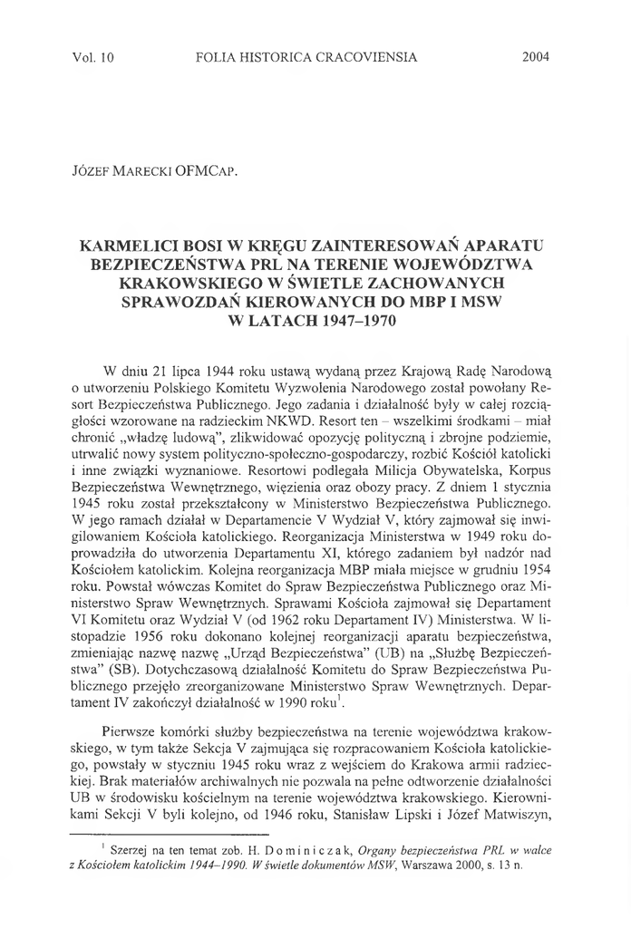 Yol. 10 FOLIA HISTORICA CRACOVIENSIA 2004 Józef M arecki O FM C a p. KARMELICI BOSI W KRĘGU ZAINTERESOWAŃ APARATU BEZPIECZEŃSTWA PRL NA TERENIE WOJEWÓDZTWA KRAKOWSKIEGO W ŚWIETLE ZACHOWANYCH SPRAWOZDAŃ KIEROWANYCH DO MBP I MSW W LATACH 1947-1970 W dniu 21 lipca 1944 roku ustawą wydaną przez Krajową Radę Narodową 0 utworzeniu Polskiego Komitetu Wyzwolenia Narodowego został powołany Re sort Bezpieczeństwa Publicznego. Jego zadania i działalność były w całej rozcią głości wzorowane na radzieckim NKWD. Resort ten - wszelkimi środkami - miał chronić „władzę ludową”, zlikwidować opozycję polityczną i zbrojne podziemie, utrwalić nowy system polityczno-społeczno-gospodarczy, rozbić Kościół katolicki 1 inne związki wyznaniowe. Resortowi podlegała Milicja Obywatelska, Korpus Bezpieczeństwa Wewnętrznego, więzienia oraz obozy pracy. Z dniem 1 stycznia 1945 roku został przekształcony w Ministerstwo Bezpieczeństwa Publicznego. W jego ramach działał w Departamencie V Wydział V, który zajmował się inwi gilowaniem Kościoła katolickiego. Reorganizacja Ministerstwa w 1949 roku do prowadziła do utworzenia Departamentu XI, którego zadaniem był nadzór nad Kościołem katolickim. Kolejna reorganizacja MBP miała miejsce w grudniu 1954 roku. Powstał wówczas Komitet do Spraw Bezpieczeństwa Publicznego oraz Mi nisterstwo Spraw Wewnętrznych. Sprawami Kościoła zajmował się Departament VI Komitetu oraz Wydział V (od 1962 roku Departament IV) Ministerstwa. W li stopadzie 1956 roku dokonano kolejnej reorganizacji aparatu bezpieczeństwa, zmieniając nazwę nazwę „Urząd Bezpieczeństwa” (UB) na „Służbę Bezpieczeń stwa” (SB). Dotychczasową działalność Komitetu do Spraw Bezpieczeństwa Pu blicznego przejęło zreorganizowane Ministerstwo Spraw Wewnętrznych. Depar tament IV zakończył działalność w 1990 roku1. Pierwsze komórki służby bezpieczeństwa na terenie województwa krakow skiego, w tym także Sekcja V zajmująca się rozpracowaniem Kościoła katolickie go, powstały w styczniu 1945 roku wraz z wejściem do Krakowa armii radziec kiej . Brak materiałów archiwalnych nie pozwala na pełne odtworzenie działalności UB w środowisku kościelnym na terenie województwa krakowskiego. Kierowni kami Sekcji V byli kolejno, od 1946 roku, Stanisław Lipski i Józef Matwiszyn, 1 Szerzej na ten temat zob. H. D o m i n i c z a k , Organy bezpieczeństwa PRL w walce z Kościołem katolickim 1944-1990. W świetle dokumentów MSW, Warszawa 2000, s. 13 n. 252 Józef Marecki OFMCap. którego w marcu lub kwietniu 1948 roku zastąpił Krzysztof Srokowski. Przepro wadzono wówczas reorganizację pracy i zapowiedziano pełniejsze niż dotychczas i bardziej właściwe wykorzystanie materiałów na kler diecezjalny i zakonny. Jak wynika z późniejszych sprawozdań opracowano zapewne instrukcje (kwestiona riusze) relacji okresowych2. Funkcjonariusze krakowskiego WUBP byli świadomi, że działają na terenie, na którym przebywa znaczna liczba duchowieństwa. Dlatego też systematycznie budowali agenturę. W pierwszej połowie 1948 roku na terenie województwa kra kowskiego spośród kleru diecezjalnego było 5 agentów i jeden informator, z któ rymi zorganizowano 13 spotkań. Ponadto przyjęto 10 doniesień. W analogicznym okresie spośród kleru zakonnego było 2 agentów, z którymi odbyło się 2 spotka nia. Kierownicy krakowskiej Sekcji V WUBP uważali, że liczba pozyskanych współpracowników była niewystarczająca3. Pod koniec 1948 roku zauważa się intensyfikację działalności na polu infil tracji środowisk zakonnych przez pracowników powiatowych i wojewódzkich urzędów Bezpieczeństwa Publicznego. Kierownik Sekcji V Wydziału V WUBP w Krakowie Krzysztof Srokowski w sprawozdaniu do Wydziału V Departamentu V MBP w grudniu 1948 roku ubolewał, że agentura wśród kleru zakonnego4 jest niedostatecznie obsadzona, mimo, że w stosunku do czerwca liczba informatorów spośród kleru diecezjalnego wzrosła do 6 a spośród zakonnego do 55. W 1950 roku odszedł z Wydziału XI (do 1949 roku Sekcja V) WUBP w Krakowie na wyższe stanowisko wspomniany wyżej Srokowski a jego obo wiązki przejął Stanisław Florek (początkowo jako p.o. kierownika Sekcji). Pod jego kierownictwem prowadzono intensywną kampanię walki z Kościołem kato lickim. Od lutego 1953 roku sprawy zakonne na terenie województwa krakow skiego prowadził starszy referent chor. Wincenty Piechowicz. Po 1950 roku agentura krakowskich służb bezpieczeństwa była znacznie rozbudowana. W czerwcu 1953 roku WUBP w Krakowie miał wśród zakonników 1 agenta, 30 informatorów i 3 mieszkania konspiracyjne, a spośród zakonnic 9 informatorek i 2 mieszkania konspiracyjne, natomiast powiatowe urzędy Bezpie czeństwa Publicznego wśród zakonników posiadały 19 informatorów a spośród zakonnic - 3 informatorki6. 2 Por. Instytut Pamięci Narodowej. Oddziałowe Biuro Udostępniania i Archiwizacji Doku mentów w Krakowie (dalej: IPNKr), sygn. 039/1, t. 1, Sprawozdanie kierownika Sekcji V Wydziału VK. Srokowskiego [?] do MBP Departamentu V Wydziału V, Kraków, 30 VI 1948 r., s. 136. 3 Por. tamże, Raport okresowy p.o. kierownika Sekcji V Wydziału V do MBP Departa mentu V Wydziału V, Kraków, 5 VI 1948 r., s. 130. 4 Warto odnotować, że w latach 1949—1951 szefowie Sekcji V Wydziału V WUBP w Krakowie w swe sprawozdania dzielili na działy: kler świecki, „Caritas”, kler pozytywny, stowarzyszenia katolickie, organizacje katolickie; brak jest działu „kler zakonny”, który pojawia się dopiero w lutym 1953 roku. Obiekty zakonne prowadził wówczas na terenie województwa krakowskiego st. ref. chor. W. Piechowicz. Brak sprawozdań z działu „kler zakonny” może su gerować, że zostały wyłączone z ogólnych sprawozdań lub przekazane w całości do szczegól nych zadań operacyjnych. 5 Por. IPNKr, sygn. 039/1, t. 1, Sprawozdanie kierownika Sekcji V Wydzi