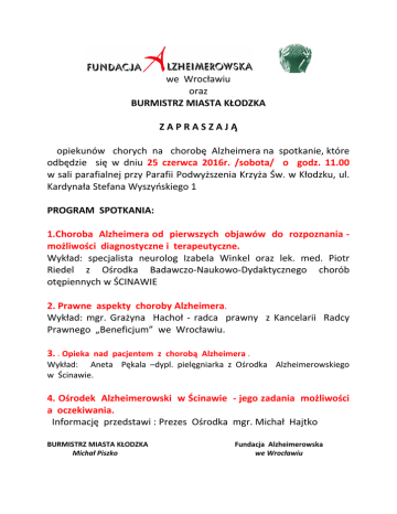 we Wrocławiu oraz BURMISTRZ MIASTA KŁODZKA ZAPRASZAJĄ opiekunów chorych na chorobę Alzheimera na spotkanie, które odbędzie się w dniu 25 czerwca 2016r. /sobota/ o godz. 11.00 w sali parafialnej przy Parafii Podwyższenia Krzyża Św. w Kłodzku, ul. Kardynała Stefana Wyszyńskiego 1 PROGRAM SPOTKANIA: 1.Choroba Alzheimera od pierwszych objawów do rozpoznania możliwości diagnostyczne i terapeutyczne. Wykład: specjalista neurolog Izabela Winkel oraz lek. med. Piotr Riedel z Ośrodka Badawczo-Naukowo-Dydaktycznego chorób otępiennych w ŚCINAWIE 2. Prawne aspekty choroby Alzheimera. Wykład: mgr. Grażyna Hachoł - radca prawny z Kancelarii Radcy Prawnego „Beneficjum” we Wrocławiu. 3. . Opieka nad pacjentem z chorobą Alzheimera . Wykład: Aneta Pękala –dypl. pielęgniarka z Ośrodka Alzheimerowskiego w Ścinawie. 4. Ośrodek Alzheimerowski w Ścinawie - jego zadania możliwości a oczekiwania. Informację przedstawi : Prezes Ośrodka mgr. Michał Hajtko BURMISTRZ MIASTA KŁODZKA Michał Piszko Fundacja Alzheimerowska we Wrocławiu