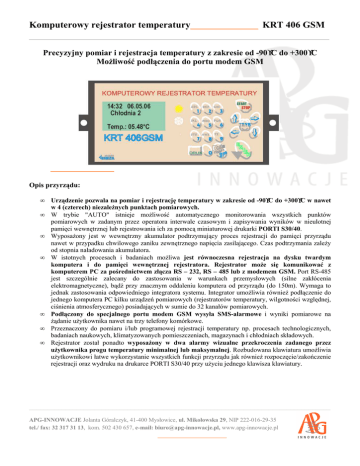 Komputerowy rejestrator temperatury________________ KRT 406 GSM ______________________________________________________________ Precyzyjny pomiar i rejestracja temperatury z zakresie od -90°°C do +300°°C Możliwość podłączenia do portu modem GSM _______________ Opis przyrządu: • • • • • • • Urządzenie pozwala na pomiar i rejestrację temperatury w zakresie od -90°°C do +300°°C w nawet w 4 (czterech) niezależnych punktach pomiarowych. W trybie "AUTO" istnieje możliwość automatycznego monitorowania wszystkich punktów pomiarowych w zadanym przez operatora interwale czasowym i zapisywania wyników w nieulotnej pamięci wewnętrznej lub rejestrowania ich za pomocą miniaturowej drukarki PORTI S30/40. Wyposażony jest w wewnętrzny akumulator podtrzymujący proces rejestracji do pamięci przyrządu nawet w przypadku chwilowego zaniku zewnętrznego napięcia zasilającego. Czas podtrzymania zależy od stopnia naładowania akumulatora. W istotnych procesach i badaniach możliwa jest równoczesna rejestracja na dysku twardym komputera i do pamięci wewnętrznej rejestratora. Rejestrator może się komunikować z komputerem PC za pośrednictwem złącza RS – 232, RS – 485 lub z modemem GSM. Port RS-485 jest szczególnie zalecany do zastosowania w warunkach przemysłowych (silne zakłócenia elektromagnetyczne), bądź przy znacznym oddaleniu komputera od przyrządu (do 150m). Wymaga to jednak zastosowania odpowiedniego integratora systemu. Integrator umożliwia również podłączenie do jednego komputera PC kilku urządzeń pomiarowych (rejestratorów temperatury, wilgotności względnej, ciśnienia atmosferycznego) posiadających w sumie do 32 kanałów pomiarowych. Podłączony do specjalnego portu modem GSM wysyła SMS-alarmowe i wyniki pomiarowe na żądanie użytkownika nawet na trzy telefony komórkowe. Przeznaczony do pomiaru i/lub programowej rejestracji temperatury np. procesach technologicznych, badaniach naukowych, klimatyzowanych pomieszczeniach, magazynach i chłodniach składowych. Rejestrator został ponadto wyposażony w dwa alarmy wizualne przekroczenia zadanego przez użytkownika progu temperatury minimalnej lub maksymalnej. Rozbudowana klawiatura umożliwia użytkownikowi łatwe wykorzystanie wszystkich funkcji przyrządu jak również rozpoczęcie/zakończenie rejestracji oraz wydruku na drukarce PORTI S30/40 przy użyciu jednego klawisza klawiatury. ___________________________________________________________________________________ APG-INNOWACJE Jolanta Góralczyk, 41-400 Mysłowice, ul. Mikołowska 29, NIP 222-016-29-35 tel./ fax: 32 317 31 13, kom. 502 430 657, e-mail: [email protected], www.apg-innowacje.pl ___________________ Komputerowy rejestrator temperatury________________ KRT 406 GSM ______________________________________________________________ Parametry techniczne: • • • • • • • • Zakres pomiaru i rejestracji temperatury: -90°C do +300°C Rozdzielczość pomiaru i rejestracji temperatury: 0,02°C Dokładność rejestratora: 0,1% zakresu pomiarowego według odniesienia do normy PN-EN 60751+A2:1999 Wejście: 4 (cztery) lub 2 (dwa) czujniki Pt - 100 kl.A lub B wg PN-EN 60751 + A2:1999 Sposób podłączenia czujników Pt - 100: linia czterożyłowa (odległość czujników do 100m) Interwał czasowy rejestracji temperatury: od 1 minuty do 24 godzin (programowany za pomocą klawiatury) Interwał wydruku wyników pomiarowych na drukarce: od 1 minuty do 24 godzin (programowany za pomocą klawiatury) Sposób podłączenia drukarki PORTI S30/40: złącze RS-232 na obudowie przyrządu (odległość do drukarki do 2m) Komunikacja z komputerem: 1. RS - 232 ( odległość do komputera do 4 metrów) 2. RS - 485 - wymagany konwerter - (odległość od komputera do 150m) • Odczyt wyników pomiaru temperatury: wyświetlacz alfanumeryczny LCD 4x16 znaków • Odczyt statusu urządzenia: wyświetlacz alfanumeryczny LCD 4x16 znaków • Komunikacja z modemem GSM: oddzielny port w obudowie rejestratora Sposób rejestracji wyników pomiarowych(programowalny przez użytkownika): 1. pamięć wewnętrzna, nieulotna ( do 12 500 zapisów w każdym kanale pomiarowym) 2. drukarka miniaturowa PORTI S30/40 podłączona bezpośrednio do rejestratora 3. On-line na dysk twardy współpracującego komputera PC • • • • Zasilanie: 12V dc lub 230V ac poprzez adapter Obudowa: plastikowa, przystosowana do montażu na ścianie Odporność klimatyczna: zgodnie z IP 54 Wymiary obudowy: 200 x 95 x 37mm DODATKOWE INFORMACJE • gwarancja 12 miesięczna • serwis gwarancyjny i pogwarancyjny • Świadectwo Wzorcowania Urzędu Miar RP ___________________________________________________________________________________ APG-INNOWACJE Jolanta Góralczyk, 41-400 Mysłowice, ul. Mikołowska 29, NIP 222-016-29-35 tel./ fax: 32 317 31 13, kom. 502 430 657, e-mail: [email protected], www.apg-innowacje.pl ___________________