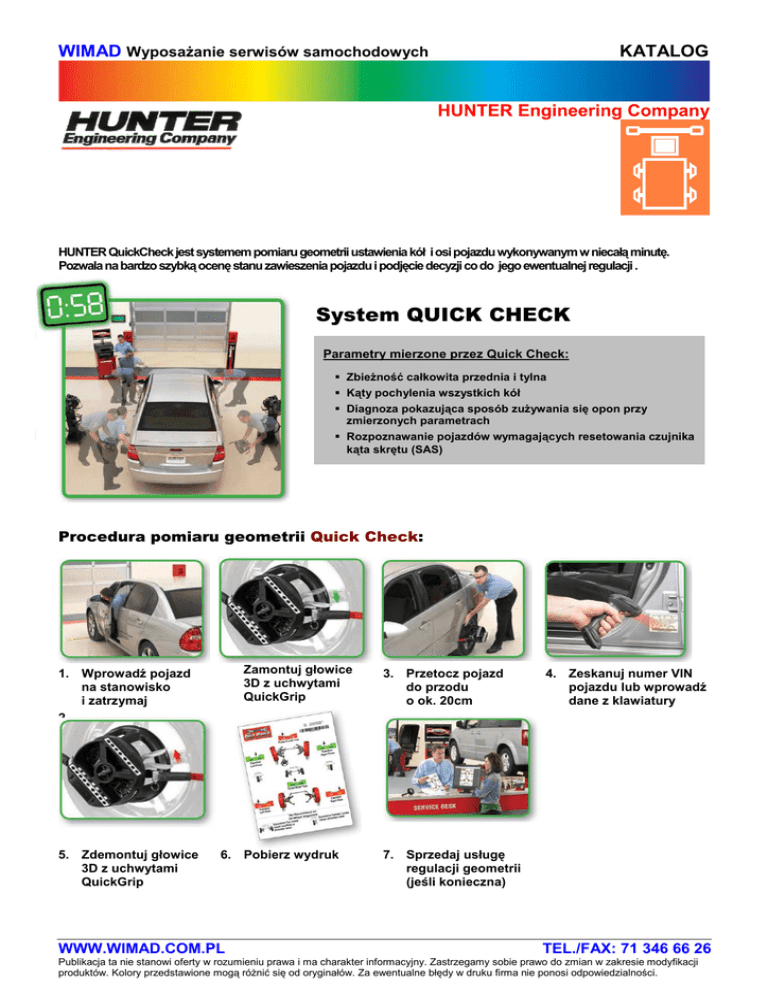 WIMAD Wyposażanie serwisów samochodowych KATALOG HUNTER Engineering Company HUNTER QuickCheck jest systemem pomiaru geometrii ustawienia kół i osi pojazdu wykonywanym w niecałą minutę. Pozwala na bardzo szybką ocenę stanu zawieszenia pojazdu i podjęcie decyzji co do jego ewentualnej regulacji . System QUICK CHECK Parametry mierzone przez Quick Check: Zbieżność całkowita przednia i tylna Kąty pochylenia wszystkich kół Diagnoza pokazująca sposób zużywania się opon przy zmierzonych parametrach Rozpoznawanie pojazdów wymagających resetowania czujnika kąta skrętu (SAS) Procedura pomiaru geometrii Quick Check: Zamontuj głowice 3D z uchwytami QuickGrip 1. Wprowadź pojazd na stanowisko i zatrzymaj 2. 5. Zdemontuj głowice 3D z uchwytami QuickGrip 6. Pobierz wydruk WWW.WIMAD.COM.PL 3. Przetocz pojazd do przodu o ok. 20cm 4. Zeskanuj numer VIN pojazdu lub wprowadź dane z klawiatury 7. Sprzedaj usługę regulacji geometrii (jeśli konieczna) TEL./FAX: 71 346 66 26 Publikacja ta nie stanowi oferty w rozumieniu prawa i ma charakter informacyjny. Zastrzegamy sobie prawo do zmian w zakresie modyfikacji produktów. Kolory przedstawione mogą różnić się od oryginałów. Za ewentualne błędy w druku firma nie ponosi odpowiedzialności. WIMAD Wyposażanie serwisów samochodowych KATALOG HUNTER Engineering Company Dane techniczne: WQ332FCM3 Procesor Intel Core i3 Pamięć 4 GB DDR3 SDRAM Dysk twardy 250 GB SATA (lub większy) 24” (panoramiczny LCD) Dwuletnia darmowa aktualizacja 4 Wersja mobilna Wersja umożliwiająca (na konsoli) przejazd pojazdu SPRZĘT Komputer Monitor Dane techniczne pojazdów Liczba kamer Mocowanie kamer NARZĘDZIA ZWIĘKSZAJĄCE WYDAJNOŚĆ WQ332DT Oprogramowanie HUNTER Quick Check Aktualizacja bazy danych pojazdów Czytnik kodów kreskowych Pomoc wideo Głowice w technologii 3D Uchwyty QuickGrip Kontakt (obręcz-uchwyt głowicy) metal-metal Przenośne stojaki na głowice Standard WebSpecs Standard Standard Standard Standard (o zakresie do 37”) Nie Standard Przykładowa analiza zwrotu inwestycji (w zł) Tydzień pracy - dni Dodatkowe pomiary dziennie (Quick Check) Pojazdy badane metodą Quick Check (dziennie) Pojazdy wymagające ustawienia (60%) 5,5 Dodatkowa realna liczba wykonanych ustawień (≥ 20%) +2 Cena regulacji geometrii Cena części zamiennych z wymianą - średnio (elementy zawieszenia i układu kierowniczego) Razem Koszty pracy i części Zysk brutto Koszt całkowity inwestycji Zysk netto Inwestycja ze środków własnych (gotówka) 20 12 150,00 * 61,00 ** 211,00 – 50% 105,50 50 000,00 Całkowity zwrot inwestycji 2 dziennie 300,00 48 572 miesięcznie pierwszy rok 7 200,00 85 800,00 122,00 2 928,00 422,00 211,00 211,00 – 14,00 197,00 237 dni 10 128,00 5 064,00 5 064,00 – 417,00 4 647,00 9,9 miesięcy 34 892,00 5 720 10 lat 858 000,00 348 920,00 120 692,00 1 206 920,00 60 346,00 603 460,00 60 346,00 603 460,00 – 5 000,00 – 50 000,00 55 346,00 553 460,00 0,8 roku * Regulacja zawiera: inspekcję zawieszenia w celu weryfikacji elementów do wymiany, przygotowanie do pomiaru pierwotnego i pomiar pierwotny, regulację 4 kątów, np. 2 kątów zbieżności połówkowej i 2 kątów PK, wydruk końcowy. Po weryfikacji może nastąpić konieczność wymiany części zamiennych (omówienie poniżej). ** Wartość części zawieszenia i układu kierowniczego wymienianych w statystycznym pojeździe wynosi 150 zł. Konieczność wymiany zachodzi w 40,6 % pojazdów, co daje 61 zł na pojazd. WWW.WIMAD.COM.PL TEL./FAX: 71 346 66 26 Publikacja ta nie stanowi oferty w rozumieniu prawa i ma charakter informacyjny. Zastrzegamy sobie prawo do zmian w zakresie modyfikacji produktów. Kolory przedstawione mogą różnić się od oryginałów. Za ewentualne błędy w druku firma nie ponosi odpowiedzialności.