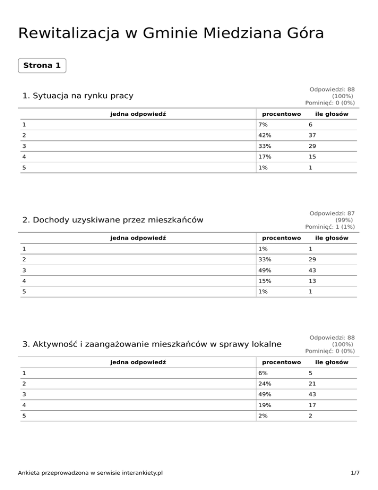 Rewitalizacja w Gminie Miedziana Góra Strona 1 Odpowiedzi: 88 (100%) Pominięć: 0 (0%) 1. Sytuacja na rynku pracy jedna odpowiedź procentowo ile głosów 1 7% 6 2 42% 37 3 33% 29 4 17% 15 5 1% 1 Odpowiedzi: 87 (99%) Pominięć: 1 (1%) 2. Dochody uzyskiwane przez mieszkańców jedna odpowiedź procentowo ile głosów 1 1% 1 2 33% 29 3 49% 43 4 15% 13 5 1% 1 3. Aktywność i zaangażowanie mieszkańców w sprawy lokalne jedna odpowiedź Odpowiedzi: 88 (100%) Pominięć: 0 (0%) procentowo ile głosów 1 6% 5 2 24% 21 3 49% 43 4 19% 17 5 2% 2 Ankieta przeprowadzona w serwisie interankiety.pl 1/7 Odpowiedzi: 88 (100%) Pominięć: 0 (0%) 4. Dostępność opieki przedszkolnej jedna odpowiedź procentowo ile głosów 1 0% 0 2 19% 17 3 28% 25 4 42% 37 5 10% 9 Odpowiedzi: 87 (99%) Pominięć: 1 (1%) 5. Dostępność opieki żłobkowej jedna odpowiedź procentowo ile głosów 1 62% 54 2 25% 22 3 6% 5 4 5% 4 5 2% 2 6. Poziom edukacji i oferta zajęć pozalekcyjnych w szkołach podstawowych oraz gimnazjach jedna odpowiedź Odpowiedzi: 86 (98%) Pominięć: 2 (2%) procentowo ile głosów 1 0% 0 2 8% 7 3 26% 22 4 41% 35 5 26% 22 7. Dostępność i zróżnicowanie oferty kulturalnej i spędzania czasu wolnego jedna odpowiedź Odpowiedzi: 87 (99%) Pominięć: 1 (1%) procentowo ile głosów 1 5% 4 2 20% 17 Ankieta przeprowadzona w serwisie interankiety.pl 2/7 3 38% 33 4 30% 26 5 8% 7 Odpowiedzi: 88 (100%) Pominięć: 0 (0%) 8. Bezpieczeństwo publiczne jedna odpowiedź procentowo ile głosów 1 1% 1 2 10% 9 3 44% 39 4 38% 33 5 7% 6 Odpowiedzi: 87 (99%) Pominięć: 1 (1%) 9. Funkcjonowanie systemu pomocy społecznej w gminie jedna odpowiedź procentowo ile głosów 1 1% 1 2 10% 9 3 41% 36 4 37% 32 5 10% 9 Odpowiedzi: 88 (100%) Pominięć: 0 (0%) 10. Przedsiębiorczość mieszkańców jedna odpowiedź procentowo ile głosów 1 1% 1 2 8% 7 3 51% 45 4 36% 32 5 3% 3 Ankieta przeprowadzona w serwisie interankiety.pl 3/7 Odpowiedzi: 87 (99%) Pominięć: 1 (1%) 11. Dostępność do handlu i usług na terenie gminy jedna odpowiedź procentowo ile głosów 1 2% 2 2 14% 12 3 15% 13 4 54% 47 5 15% 13 Odpowiedzi: 87 (99%) Pominięć: 1 (1%) 12. System wsparcia mikro i małej przedsiębiorczości na terenie gminy jedna odpowiedź procentowo ile głosów 1 10% 9 2 21% 18 3 46% 40 4 22% 19 5 1% 1 13. Dostępność i stan infrastruktury technicznej: drogowej, wodociągowej, kanalizacyjnej itd. jedna odpowiedź Odpowiedzi: 86 (98%) Pominięć: 2 (2%) procentowo ile głosów 1 7% 6 2 23% 20 3 36% 31 4 28% 24 5 6% 5 Odpowiedzi: 88 (100%) Pominięć: 0 (0%) 14. Zagospodarowanie i estetyka przestrzeni publicznych jedna odpowiedź procentowo ile głosów 1 1% 1 2 10% 9 Ankieta przeprowadzona w serwisie interankiety.pl 4/7 3 50% 44 4 34% 30 5 5% 4 Odpowiedzi: 88 (100%) Pominięć: 0 (0%) 15. Baza sportowa i rekreacyjno-wypoczynkowa jedna odpowiedź procentowo ile głosów 1 5% 4 2 9% 8 3 28% 25 4 45% 40 5 13% 11 Odpowiedzi: 87 (99%) Pominięć: 1 (1%) 16. Zagospodarowanie i wykorzystanie dziedzictwa kulturowego i naturalnego jedna odpowiedź procentowo ile głosów 1 8% 7 2 9% 8 3 45% 39 4 34% 30 5 3% 3 17. Stan środowiska naturalnego i zanieczyszczenia powietrza jedna odpowiedź Odpowiedzi: 87 (99%) Pominięć: 1 (1%) procentowo ile głosów 1 3% 3 2 14% 12 3 26% 23 4 47% 41 5 9% 8 Ankieta przeprowadzona w serwisie interankiety.pl 5/7 18. Jakie pięć najważniejszych efektów, według Pana/Pani powinno zostać osiągniętych w wyniku przeprowadzonego procesu rewitalizacji? wiele odpowiedzi Odpowiedzi: 88 (100%) Pominięć: 0 (0%) udział ile głosów Wzrost wykształcenia i umiejętności mieszkańców 19% 17 Włączenie społeczne osób wykluczonych i/lub zagrożonych marginalizacją 20% 18 Zwiększenie integracji mieszkańców i pobudzenie ich aktywności lokalnej 44% 39 Poprawa bezpieczeństwa publicznego 19% 17 Poprawa jakości i zwiększenie dostępności usług publicznych 26% 23 Pozyskanie inwestorów zewnętrznych 66% 58 Rozwój mikro i małej przedsiębiorczości 53% 47 Poprawa estetyki i funkcjonalności przestrzeni publicznych 30% 26 Poprawa stanu infrastruktury technicznej i drogowej 58% 51 Stworzenie i/lub rozszerzenie bazy turystycznej i rekreacyjnej 49% 43 Stworzenie i/lub rozszerzenie bazy sportowej 22% 19 Ograniczenie tzw. niskiej emisji i poprawa jakości środowiska naturalnego 26% 23 Odnowa, ochrona i udostępnianie dziedzictwa kulturowego i naturalnego 24% 21 5 odpowiedzi w polu "inne" Odpowiedz Respondent 5446421 tworzenie miejsc pracy dla ludzi bezrobotnych Respondent 5441613 poprawa komunikacji publicznej Respondent 5424577 Polepszenie opieki Służby zdrowia - np w Ćminsku - lekarze do wymiany (po za p. Rypulakiem), zamiast 5 lekarzy po 2 godz - dwóch rodzinnych i ze 2 specjaistów Respondent 5413447 Dostępność do specjalistów w ośrodkach zdrowia oraz rehabilitacji Respondent 5348330 zatrudnić przy pracach porządkowych wszystkich nierobów i menelów gminnych dopiero wypłacić zapomogę lub inne świadczenie Odpowiedzi: 9 (10%) Pominięć: 79 (90%) 19. Inne uwagi/sugestie Odpowiedz Respondent (5454252) brak Respondent (5451856) Więcej inwestycji mniej zabawy, a Wójt mniej zdjęć a więcej pracy Respondent (5446054) POPRAWA jakości SŁUŻBY ZDROWIA ! Respondent (5416129) W tak dużej miejscowości powinien być Posterunek Policji, szczególnie potrzebny w głównej części przy Urzędzie Gminy. Respondent (5413447) Ujednolicenie wśród wszystkich mieszkańców wysokości podatków od gruntów według nowych przepisów Ankieta przeprowadzona w serwisie interankiety.pl 6/7 Respondent (5399943) sieć gazowa i światłowody ul. Herby Respondent (5351512) chodnik na kostomłotach pierwszych na calej długosci oraz poszezenie ulicy i nowy asfalt przedewszystkim ... Respondent (5348330) Menele i nieroby którzy nie splamili się żadną pracą niech ; czyszczą chodniki ,rowy ,przepusty ,wycinają chwasty ,porządkują teren że śmieci ,usuwają dzikie wysypiska. Rada Gminy powinna zobligow