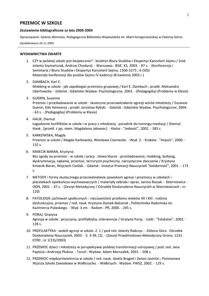 1 PRZEMOC W SZKOLE Zestawienie bibliograficzne za lata 2000-2004 Opracowanie: Jolanta Winnicka. Pedagogiczna Biblioteka Wojewódzka im. Marii Grzegorzewskiej w Zielonej Górze Opublikowano 24.11.2004 WYDAWNICTWA ZWARTE 1. CZY w polskiej szkole jest bezpiecznie? : biuletyn Biura Studiów i Ekspertyz Kancelarii Sejmu / [red. Jolanta Szymańczak, Andrzej Chodyra]. - Warszawa : BSiE. KS, 2003. - 87 s. - (Konferencje i Seminaria / Biuro Studiów i Ekspertyz Kancelarii Sejmu, 1506-3275 ; 6 (50)) Materiały konferencji dla posłów Sejmu IV kadencji (8 kwietnia 2003 r.) 2. DAMBACH, Karl E. Mobbing w szkole : jak zapobiegać przemocy grupowej / Karl E. Dambach ; przekł. Aleksandra Ubertowska. - Gdańsk : Gdańskie Wydaw. Psychologiczne, 2003. - (Pedagogika) (Problemy w Klasie) 3. GUEGIE, Suzanne Przemoc i prześladowanie w szkole : skuteczne przeciwdziałanie agresji wśród młodzieży / Suzanne Guerin, Eilis Hennessy ; przekł. Jarosław Gybski. - Gdańsk : Gdańskie Wydaw. Psychologiczne, 2004. - 63 s. - (Pedagogika) (Problemy w Klasie) 4. HAUK, Diemut Łagodzenie konfliktów w szkole i w pracy z młodzieżą : poradnik do treningu mediacji / Diemut Hauk ; [przekł. z jęz. niem. Magdalena Jałowiec]. - Kielce : "Jedność", 2002. - 183 s. 5. KAGKOWSKA, Magda Przemoc w szkole / Magda Karkowska, Wiesława Czarnecka. - Wyd. 2. - Kraków : "Impuls", 2000. 132 s. 6. KMIECIK-BAGAE, Krystyna Bez zgody na przemoc - w szkole i pracy : słowa klucze - prześladowanie, mobbing, bullying, dyskryminacja, nękanie, przemoc, terroryzm psychiczny, narcystyczne zboczenie / Krystyna Kmiecik-Baran, Wojciech Cieślak. - Gdańsk : Instytut Promocji Eauczycieli "Solidarność", 2001. - 173 s. 7. METODY i formy skutecznego przeciwdziałania zjawiskom agresji i przemocy w szkołach i placówkach opiekuńczo-wychowawczych / materiały zebrała i oprac. Janina Gosiak. - Skierniewice : ODE, 2001. - 47 s. - (Zeszyt Metodyczny / Ośrodek Doskonalenia Eauczycieli w Skierniewicach ; nr 110) 8. PATOLOGIE zachowań społecznych : rzeczywistość przełomu wieków XX i XXI : rodzina dysfunkcyjna, przemoc / red. nauk. Krystyna Dymek-Balcerek ; Politechnika Gadomska im. Kazimierza Pułaskiego. - Wyd. 3 zm. - Gadom : PG, 2000. - 245 s. 9. POGAJ, Grażyna Agresja w szkole : przyczyny, profilaktyka, interwencje / Grażyna Poraj. - Łódź : "Edukator", 2002. 128 s. 10. PGOFILAKTYKA : wokół agresji w szkole. Z. 1 / pod red. Jolanty Gadczyc. - Zielona Góra : Ośrodek Doskonalenia Eauczycieli, 2003. - S. 3-39, [2]. - (Zeszyt Przedmiotowo-Metodyczny Grono, 12310700 ; nr 1(15)/2003) 11. PGZEMOC dzieci i młodzieży w perspektywie polskiej transformacji ustrojowej / pod. red. Jana Papieża i Andrzeja Płukisa. - Toruń : Wydaw. Adam Marszałek, 2001. - 508 s. 12. PGZEMOC międzyrówieśnicza w szkole / red. nauk. Józefa Brągiel i Zenon Jasiński ; Państwowa Wyższa Szkoła Zawodowa w Wałbrzychu. - Wałbrzych : Wydaw. PWSZ, 2002. - 129 s. 2 13. PGZEMOC w rodzinie i w szkole : materiały z sesji naukowej, Toruń 5 kwietnia 2001 r. / pod red. Violetty Kwiatkowskiej-Darul ; Wydział Prawa i Administracji Uniwersytetu Miołaja Kopernika. Toruń : Wydaw. UMK, 2001. - 128 s. 14. SOCHA-KOŁODZIEJ, Krystyna Przemoc wobec dzieci jako zjawisko społeczne i problem wychowawczy / Krystyna Socha-Kołodziej. - Częstochowa : TKOPD, 2002. - 36 s. - (Biblioteczka Terenowego Komitetu Ochrony Praw Dziecka w Częstochowie ; 8) 15. SUGZYKIEWICZ, Janusz Agresja i przemoc w szkole : uwarunkowania socjoekologiczne / Janusz Surzykiewicz. - Warszawa : Centrum Metodyczne Pomocy Psychologiczno-Pedagogicznej, 2000. - 736 s. 16. ŚEIEGULSKA, Anna Przemoc wobec dziecka w rodzinie i szkole / Anna Śniegulska. - Przemyśl ; Gzeszów : Poligrafia Wyższego Seminarium Duchownego, 2003. - 148 s. ROZPRAWY Z PRAC ZBIOROWYCH 17. KOSTEK-EITA, Bogumiła Przemoc wśród dzieci jako realne zagrożenie dla współczesnej szkoły podstawowej - możliwości profilaktycznych oddziaływań / Bogumiła Kostek-Eita // W : Edukacja w perspektywie integracji Europy : praca zbiorowa / pod red. Mariana Ochmańskiego, Teresy Sokołowskiej-Dzioba i Andrzeja Pieleckiego ; Wyższa Szkoła Pedagogiczna Towarzystwa Wiedzy Powszechnej w Warszawie. Warszawa : WSP TWP, 2001. - S. 507-513 18. LESZCZYESKA, Anna Drugie życie szkoły - przemoc czy szkolny rytuał? : uwagi pedagoga / Anna Leszczyńska // W : Przemoc dzieci i młodzieży w perspektywie polskiej transformacji ustrojowej / pod red. Jana Papieża i Andrzeja Płukisa. - Toruń : Wydaw. Adam Marszałek, 2001. - S. 320-334 19. PAWŁOWSKA, Joanna Przemoc, agresja i mobbing w relacjach interpersonalnych uczniów / Joanna Pawłowska // W : Aksjologiczne aspekty relacji interpersonalnych w edukacji : praca zbiorowa / pod red. Urszuli Ostrowskiej. - Kraków : "Impuls", 2002. - S. 99-103 20. PGOKOSZ, Małgarzata Przemoc w szkole podstawowej : stan aktualny i możliwości przeciwdziałania / Małgarzata Prokosz // W : Psychopatologia i psychoterapia : przejawy narkomanii, alkoholizmu, przemocy, zaburzeń psychicznych w rodzinie i w szkole oraz możliwości im przeciwdziałania / red. Andrzej Margasiński, Beata Zajęcka. - Kraków : "Impuls", 2000. - S. 229-238 21. PGZYBYŁA, Hanna Kształcenie umiejętności twórczego rozwiązywania konfliktów jako forma oddziaływań profilaktycznych wobec przemocy w środowisku młodzieży szkolnej / Hanna Przybyła, Aleksandra Skwara // W : Przemoc dzieci i młodzieży w perspektywie polskiej transformacji ustrojowej / pod red. Jana Papieża i Andrzeja Płukisa. - Toruń : Wydaw. Adam Marszałek, 2001. - S. 282-290 22. SOCHA-KOŁODZIEJ, Krystyna Przemoc jako zjawisko występujące w szkole i internatach - możliwości i potrzeby przeciwdziałania / Krystyna Socha-Kołodziej // W : Przemoc dzieci i młodzieży w perspektywie polskiej transformacji ustrojowej / pod red. Jana Papieża i Andrzeja Płukisa. - Toruń : Wydaw. Adam Marszałek, 2001. - S. 301-309 23. ŻEGOMSKA-CHAGLIESKA, Joanna Interwencja p